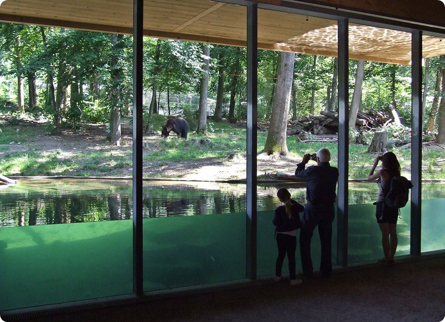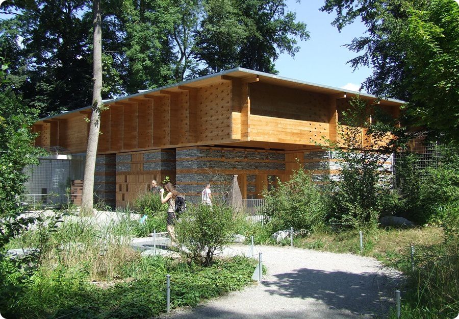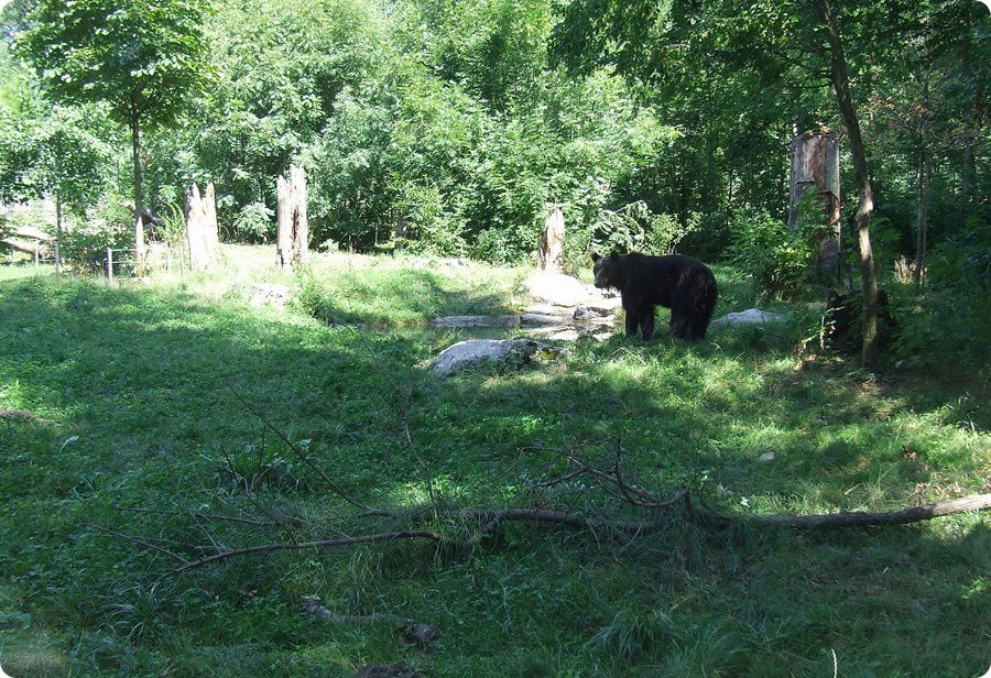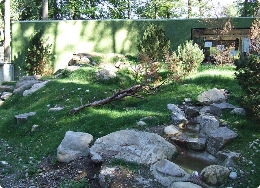 Az állatparkban nem dominálnak az állatházak, sőt, alig láthatunk néhányat. A medvék bemutatójánál kialakított látogatóközpont is minden hivalkodás nélkül illeszkedik az erdei környezetbe. Az épület számos termében elhelyezett gazdag információanyag ismerteti a medvék életmódját, valamint innen láthatjuk a hosszan elnyúló medencét, melyben sebes pisztrángok (Salmo trutta fario) ösztönzik mozgásra a medvéket. A nagyragadozók terjedelmes, több kifutóegységre tagolt, természetes erdei vegetációval bíró kifutót kaptak. A korábbi barnamedve és rozsomák társaskifutó napjainkra felszámolásra került, melynek tapasztalatairól egy korábbi, a Ragadozók társbérletben I. c. dokumentumban olvashatunk. Az európai szürke farkasok (Canis lupus lupus) szintén tágas, 2600 m² alapterületű kifutón élnek.