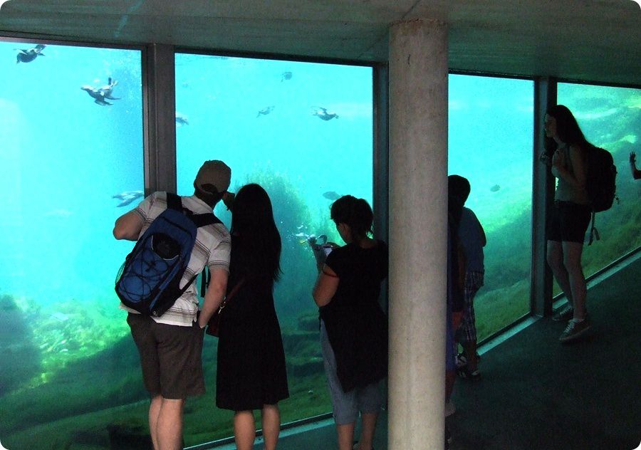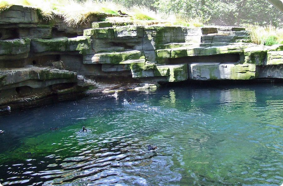 A bemutató nem pusztán röpde, hiszen e madarak életmódjának megfelelően hatalmas víztér áll rendelkezésükre. A halak kedvelői sem csalódnak, hiszen a medencében rózsás márnák (Barbus barbus) és fejes domolykók (Squalius cephalus) népes raja úszkál. A nap folyamán mindenképpen érdemes az előre meghirdetett időpontban tartott etetésre visszatérni, mely során üvegen keresztül is megtekinthetjük a rendkívüli madarak zsákmányszerző, víz alatti cikázását. Mindennek hátteréül nem egy steril betonmedence látványa szolgál, a halak és madarak vízinövények között úszkálnak.