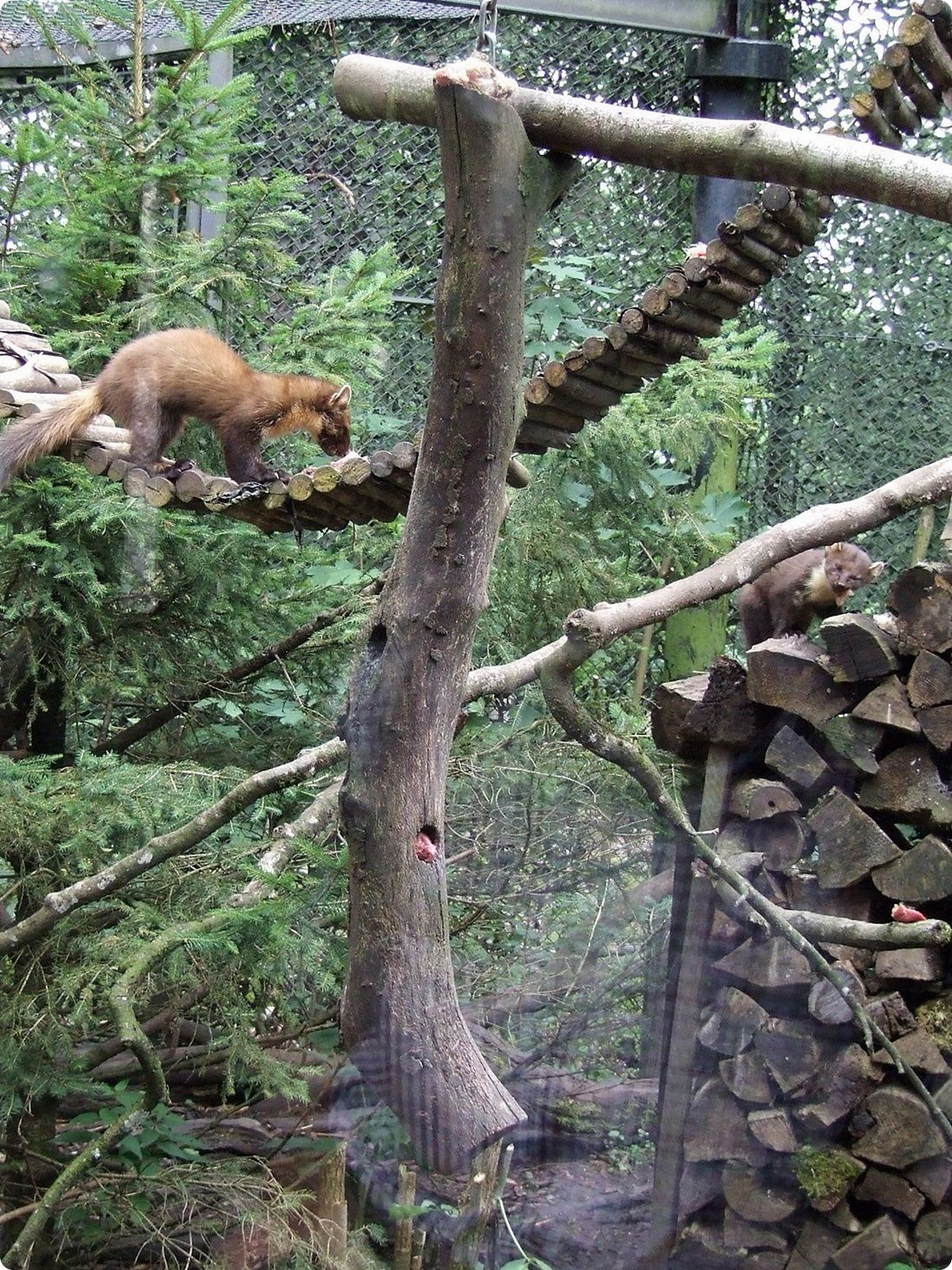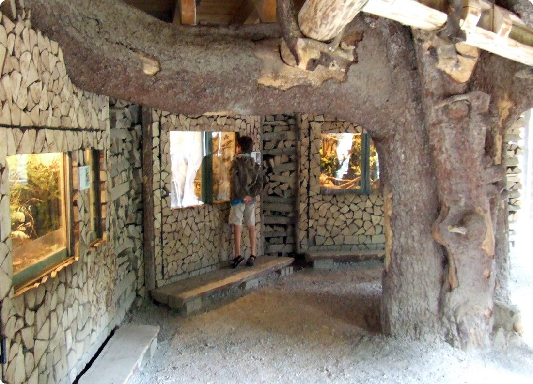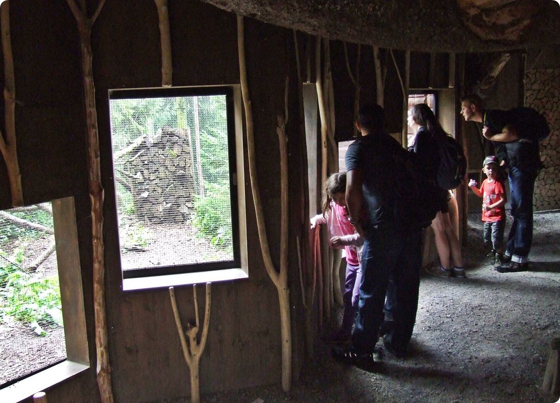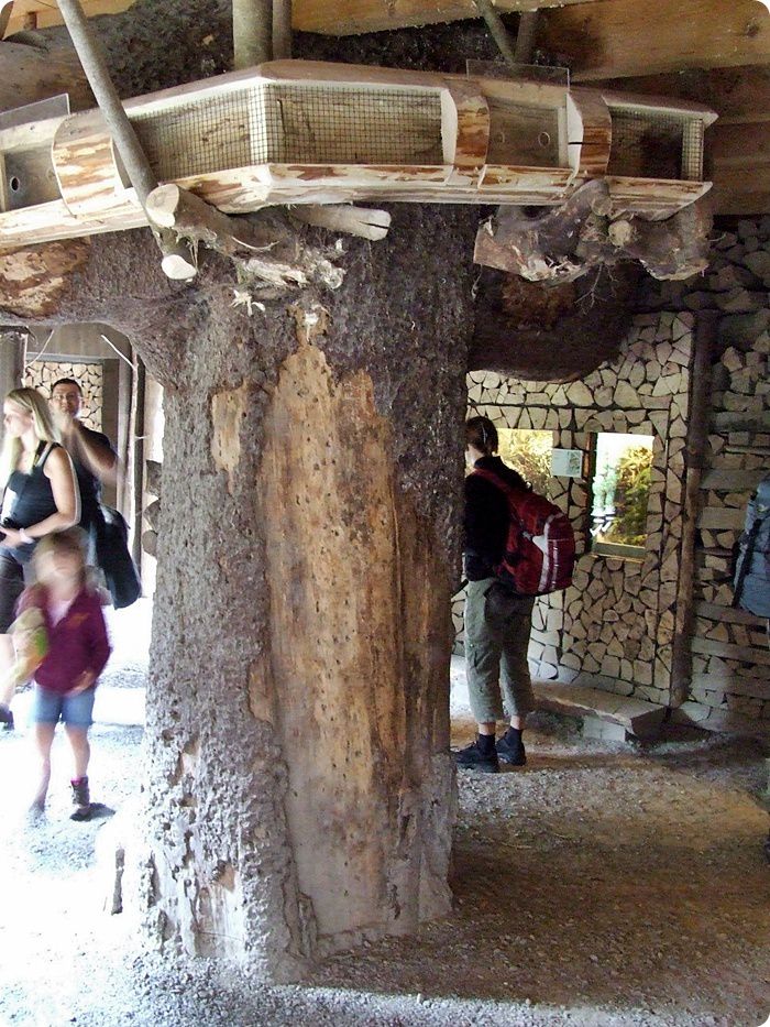 Az épület belterének közepén álló fatörzsön kialakított alagútba belebújhatnak a kistermetű ragadozók, így olykor a látogatók feje fölött is megpillanthatjuk őket.