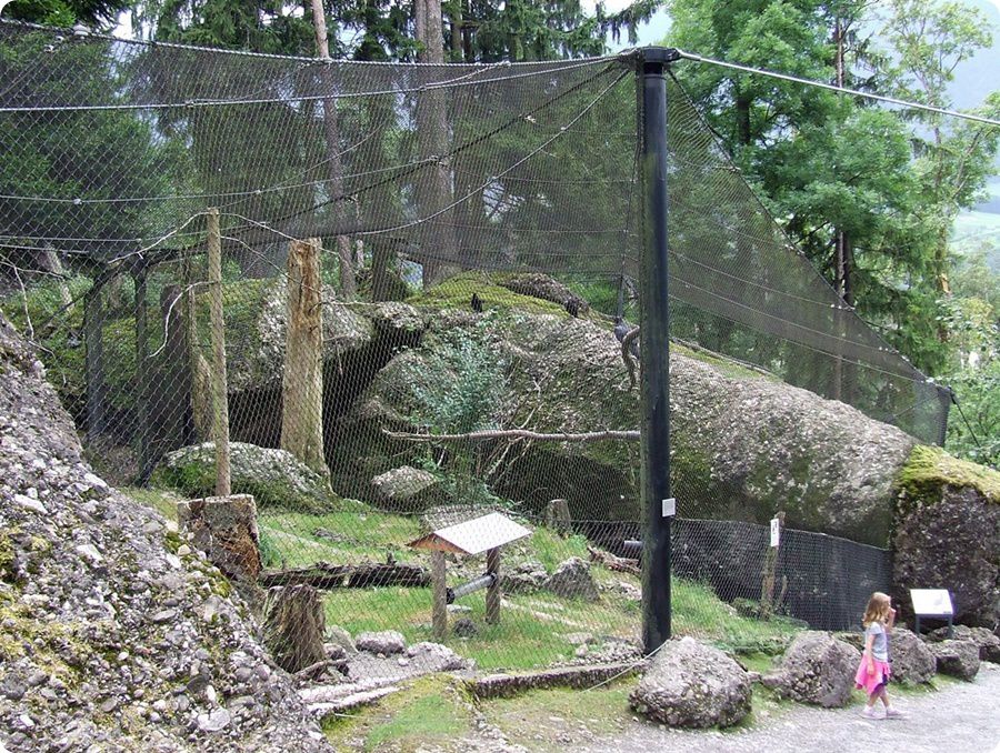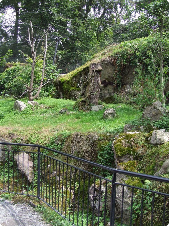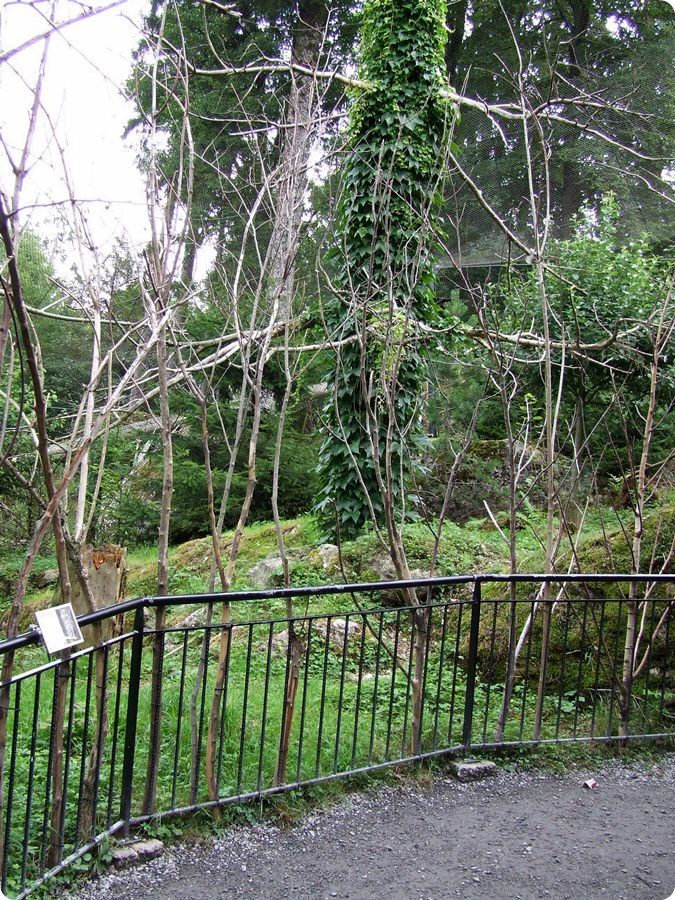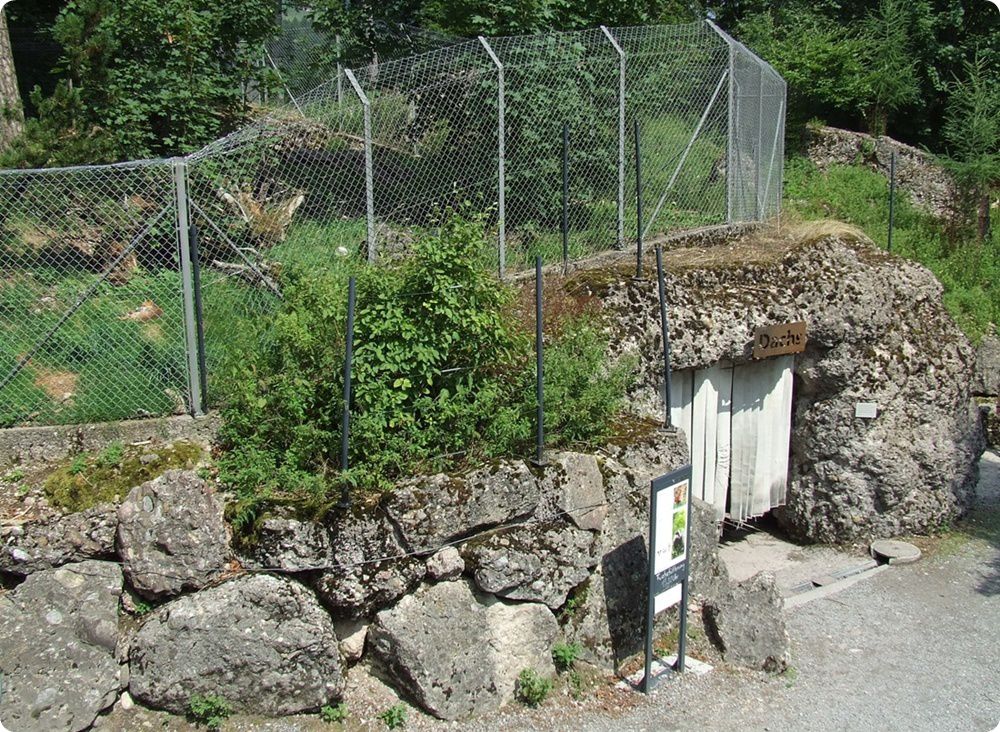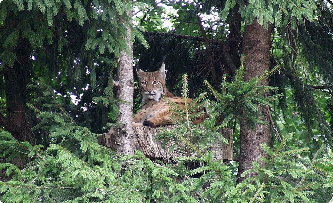 A fenti fotón jobbra a hiúzok, a háttérben a vadmacskák kifutója látható. Ez a feszülten figyelő nőstény szikaszarvas éppen vészjelzést adott le, mert megpillantotta a lombkoronában pihenő hiúzt (lent). Látogatói védőkorlát egyik macskakifutónál sincs elhelyezve, mindössze táblák figyelmeztetnek a benyúlás veszélyére.