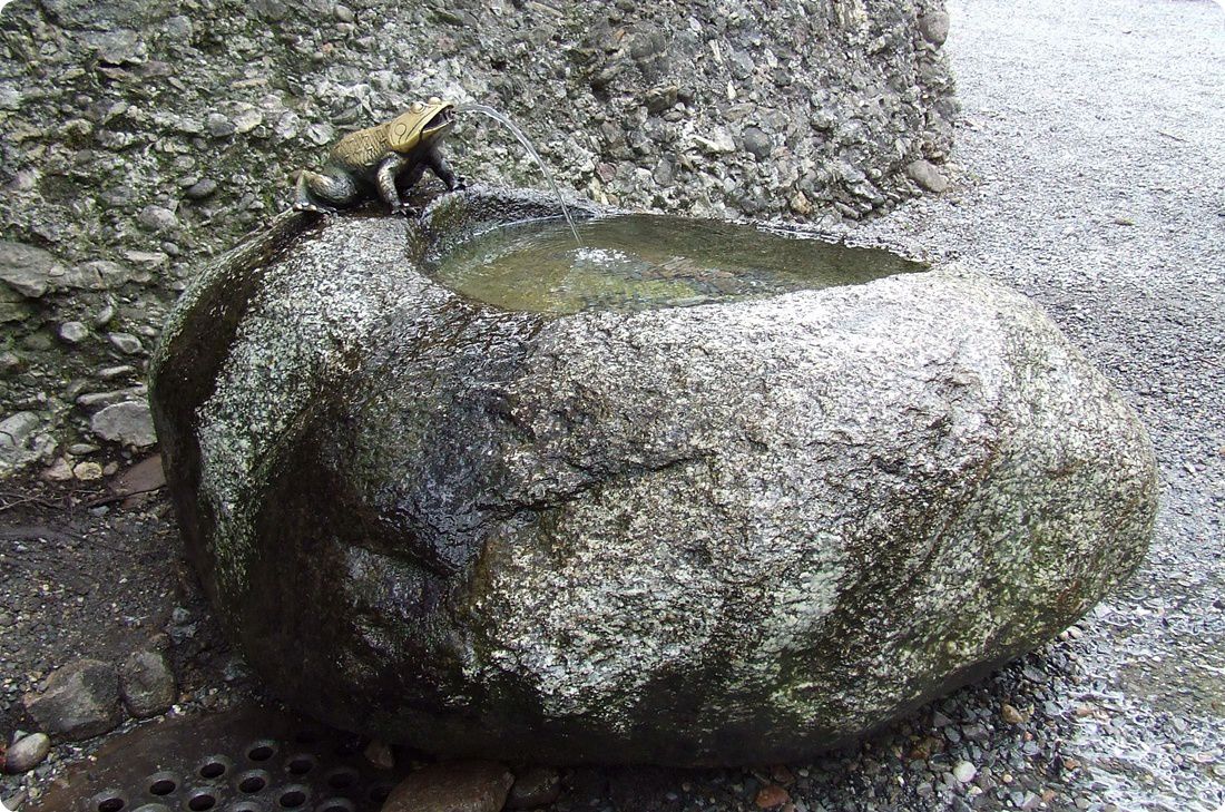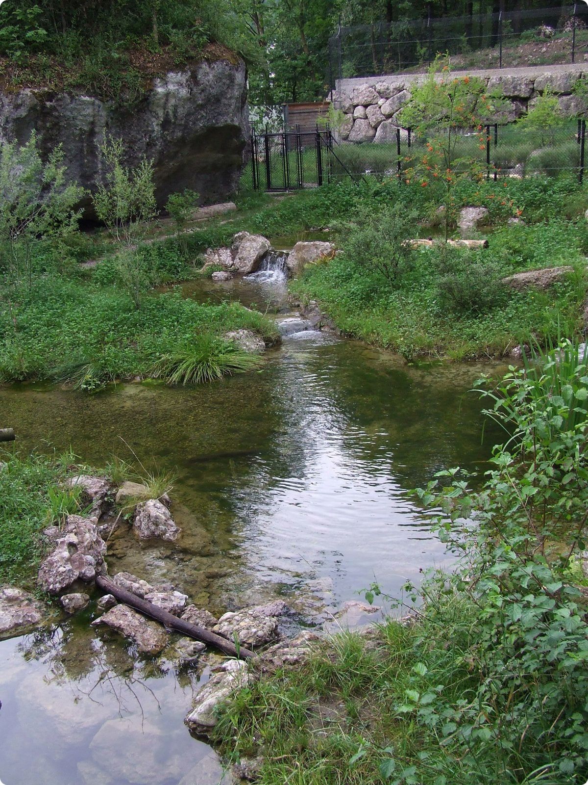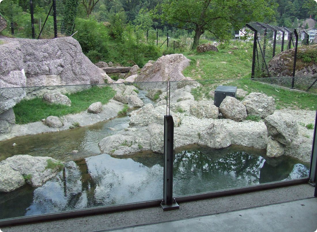 A mesterséges patak két tavat táplál a medve- és farkaskifutón belül. Ezek egyike a megfigyelőhely előtt található.