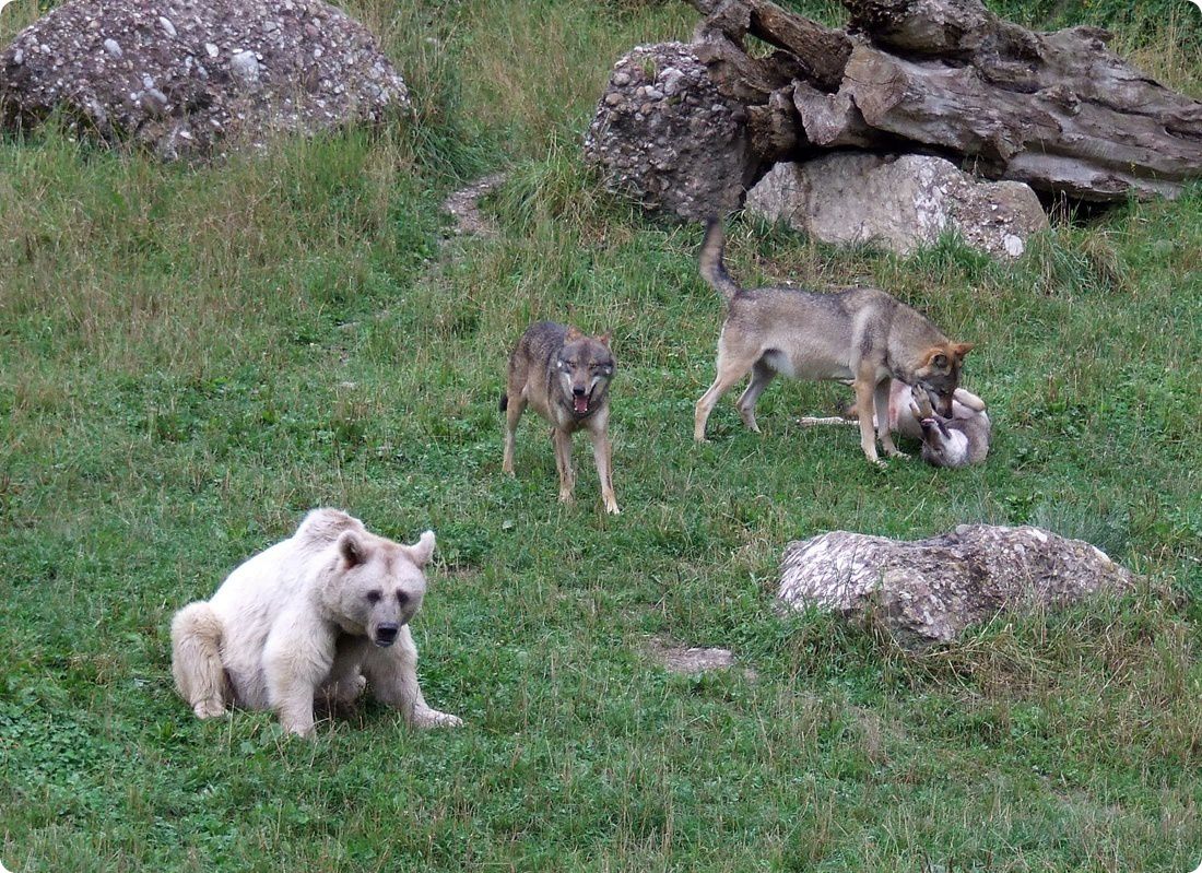 Az állatok rendelkezésére álló terület valamivel nagyobb, mint egy hektár, a következő felosztásban: a két ragadozó által közösen használt terület nagysága 6800 m², ezenkívül két további kifutórésszel csak a medvék bírnak, melyek alapterülete 1260 m² és 1740 m², valamint a farkasok is rendelkeznek egy csak általuk használt területtel, mely egy 960 m² nagyságú kifutót jelent. Ez az elrendezés lehetőséget biztosít nem csupán a fajok közötti, hanem a medvék különzárásra is, melyek felváltva is használhatják az adott területegységeket. A táplálék kifutón történő elrejtése mellett öt „automata-etető” is található a kifutókon, melyek a medvékbe ültetett mikrochip segítségével, az adott egyedet felismerve, időponttól függően táplálékot szór a medvéknek. A medvéket éjszakára a belső, nem látogatható férőhelyekre zárják, elszeparálva az egyedeket, így a farkasok kint tölthetik az éjszakát is.