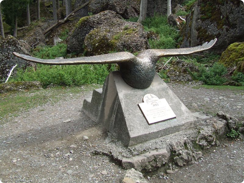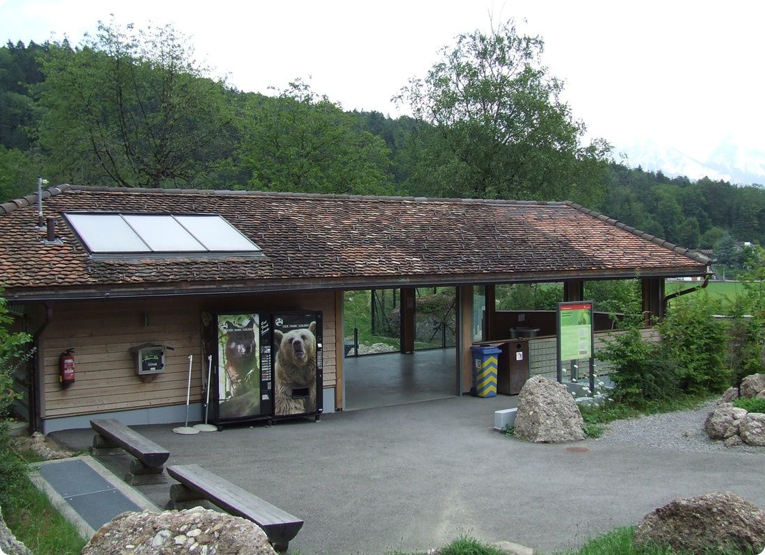 A látogatóközpont bejárata (balra), valamint a korábban említett automata etetőláda a medvék részére (jobbra), melyekből öt található az egyes kifutórészeken
