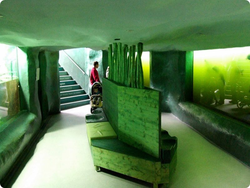 A Nyusztház belülről. Egyik oldalon a pelék és törpeegerek terráriumai láthatóak, másik oldalon a nyusztok kifutójára nézhetünk rá kisebb-nagyobb kémlelőnyílásokon keresztül.