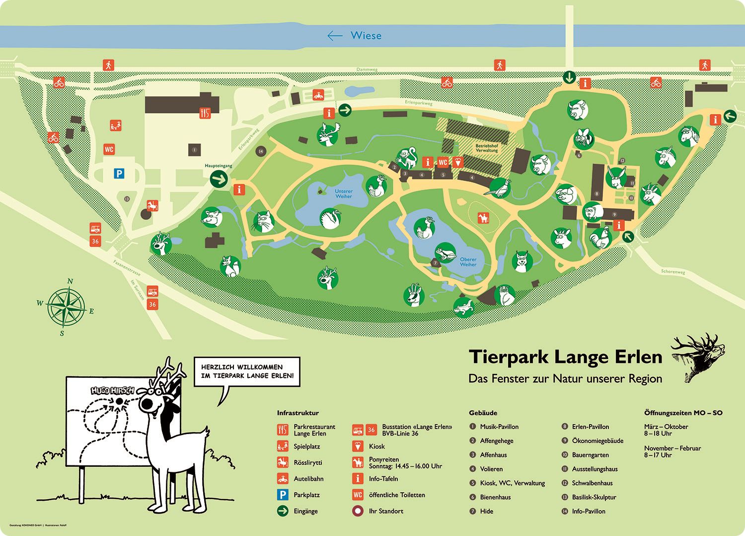 Amennyiben Bázelben járunk, a neves Bázeli Állatkert – Zoo Basel, avagy közismertebb nevén Zolli – megtekintése mellett érdemes látogatást tenni a város Kis Bázel (Kleinbasel) kerületében található, a Wiese folyó déli partján fekvő vadasparkjába. A Tierpark Lange Erlen történetét tekintve meglepő módon három évvel idősebb a Zollinál, 1871-ben nyitotta meg kapuit a bázeli lakosság számára, s egyidős az állatparkot üzemeltető Erlen-Egyesülettel (Erlen-Verein). A vadaspark nevének eredete szintén érdekes: a Langen Erlen egy svájci síkság, a Wiese folyó menti ártéri erdővel, mely Bázel és Riehen között terül el a német-svájci határ mentén. A név a terület jellemzően előforduló fafajára, az enyves égerre utal.