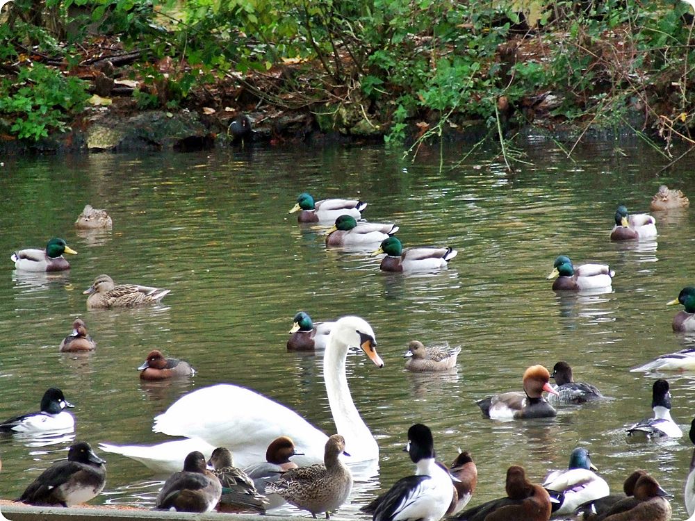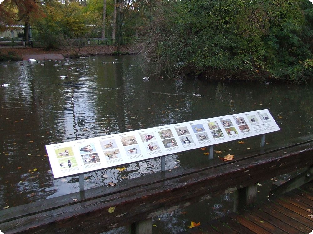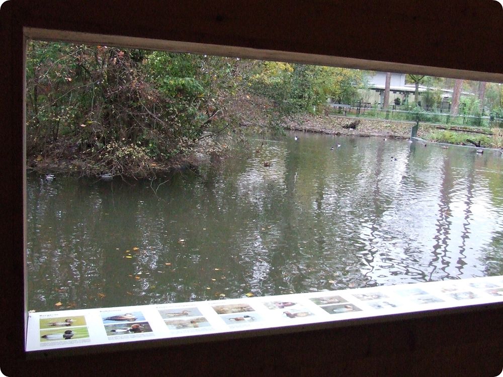 A madár-bemutató másik részét a két központi tó vízimadár-állománya jelenti. A tavakat övező sétautakról és tóparti stégről, de legfőképpen a zergekifutó szomszédságában kialakított madármegfigyelő pavilon faépületéből remek lehetőség nyílik a vízi szárnyasok életének vizsgálatára. Láthatunk itt bütykös hattyút (Cygnus olor), fekete hattyút (Cygnus atratus), kis bukót (Mergellus albellus), nagy bukót (Mergus merganser), szárcsát (Fulica atra), mandarinrécét (Aix galericulata), nyílfarkú récét (Anas acuta), kanalas récét (Anas clypeata), csörgő récét (Anas crecca), fütyülő récét (Anas penelope), tőkés récét (Anas platyrhynchos), böjti récét (Anas querquedula), kendermagos récét (Anas strepera), barátrécét (Aythya ferina), kontyos récét (Aythya fuligula), hegyi récét (Aythya marila), cigányrécét (Aythya nyroca), kercerécét (Bucephala clangula), üstökösrécét (Netta rufina), nyári ludat (Anser anser), kis liliket (Anser erythropus), apácaludat (Branta leucopsis) és bütykös ásóludat (Tadorna tadorna). Az ivari dimorfizmust egyaránt megjelenítő ismertetőtáblák segítségével könnyen azonosíthatóak az egyazon fajú récék hím és nőstény egyedei.