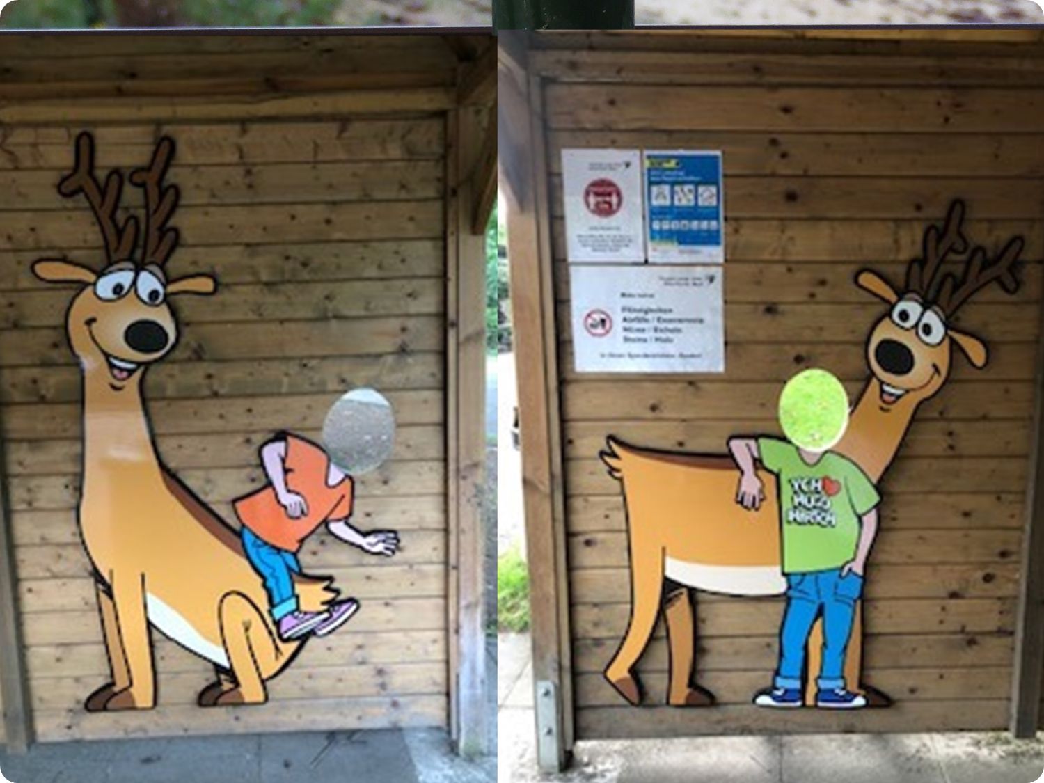A hangulatos sétautak között telepített információs táblarendszer egy visszatérő, gyermekek számára kitalált figurája Hugo Szarvas (Hugo Hirsch), aki játékos formában, tanítva vezeti végig az ifjúságot a parkon. Hugo Szarvas egyben visszautalás a gímszarvasra, mely a vadaspark címerállata is egyben. Ezzel párhuzamban érdemes továbbá megemlíteni, hogy a Lange Erlen-i Vadaspark egykori gazdag szarvasgyűjteménye végett vált ismertté: eurázsiai jávorszarvas (Alces alces alces), európai őz (Capreolus capreolus), pettyes szarvas (Axis axis), szumátrai szambárszarvas (Rusa unicolor equina), mocsári szarvas (Rucervus duvaucelii), japán szikaszarvas (Cervus nippon nippon), Dybowski's szikaszarvas (Cervus nippon hortulorum), Manitoba vapiti (Cervus canadensis manitobensis) és fehérfarkú szarvas (Odocoileus virginianus) egyaránt látható volt a parkban. A gyűjteményi koncepcióváltás után – miszerint honos állatfajok tartására fókuszál az intézmény – a gazdag patásgyűjtemény felszámolásra került, s a natív gímszarvas (Cervus elaphus) mellett mindössze dámszarvasok (Dama spp.) maradtak a gyűjteményben.