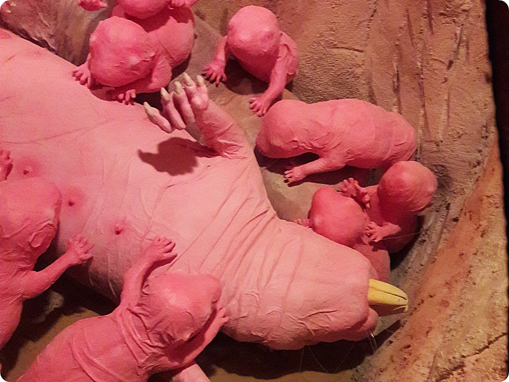Szintén kiemelt látványosság a csupasz turkálók (Heterocephalus glaber) csapata. A Délkelet-Etiópiában és Kenya keleti részének száraz szavannáin, saját maguk ásta, kiterjedt földalatti alagútrendszerekben élő, speciális életmóddal jelelmezhető rágcsálófaj egy különleges, üvegfalú bemutatóban látható. A gyenge fénnyel megvilágított, szobányi méretű „kifutóban” a kamrákból és az azokat összekötő csatornákból álló mesterséges járatrendszer átlátszó elemekből került kiépítésre, így könnyen megfigyelhető a koloniában élő állatok bonyolult szociális élete. E színvonalas bemutatás-technika szintén a régi intézmény egyik szakmai hozadéka, hiszen az egykori Afrikaházban hasonló bemutatóban tekintette meg e fajt a nagyközönség. Az új bemutató ezen felül kiegészül egy diorámával is, ahol a „királynő” gondozza újszülött csemetéit. A felnagyított méretű modellek segítségével könnyebben szemügyre vehetőek a „bizarr” külsejű állatok jellegzetességei.