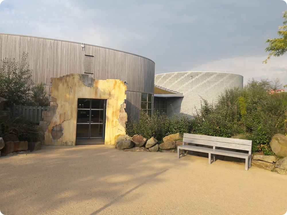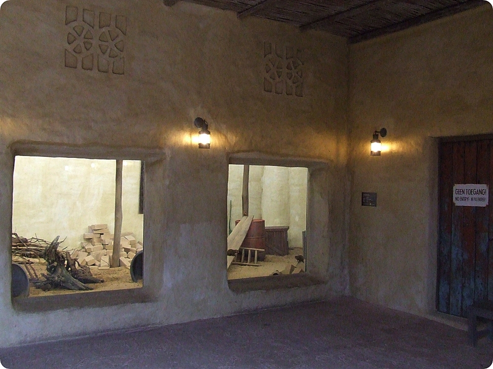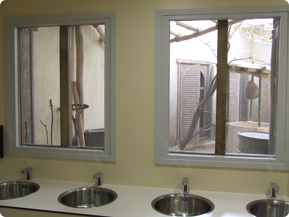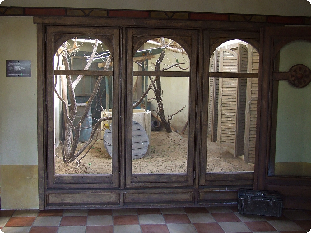 Az állatbemutatók sorát a sarkantyús teknősök (Centrochelys sulcata) ötfős csapatának beltéri kifutója zárja a kijáratnál.