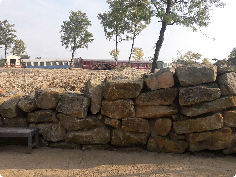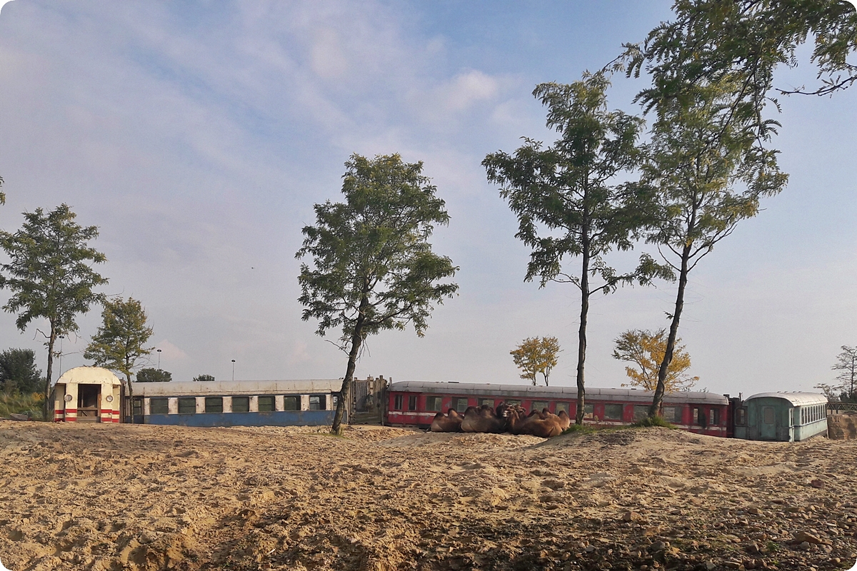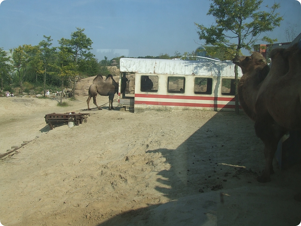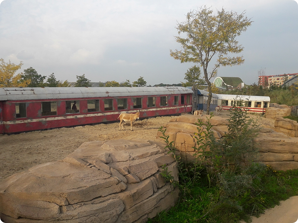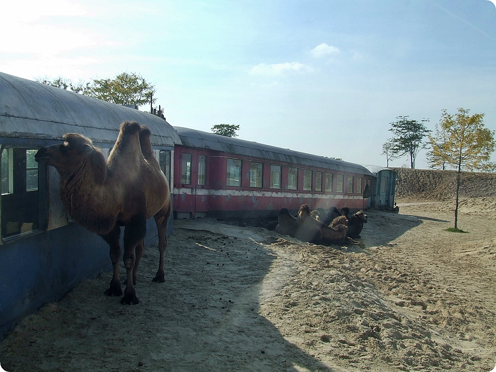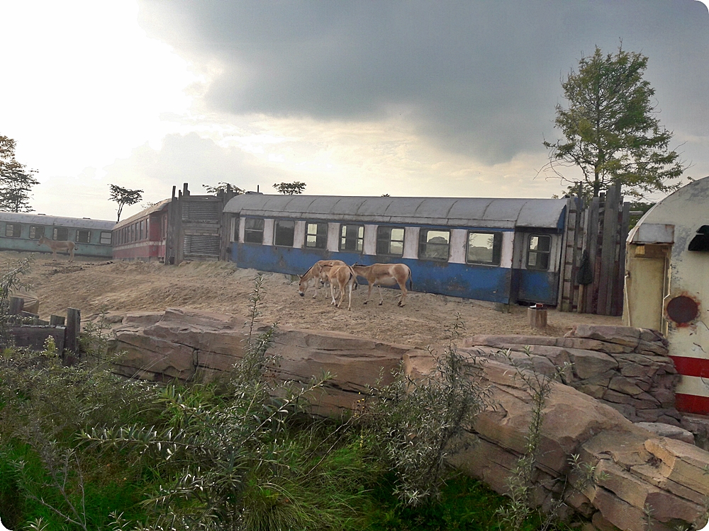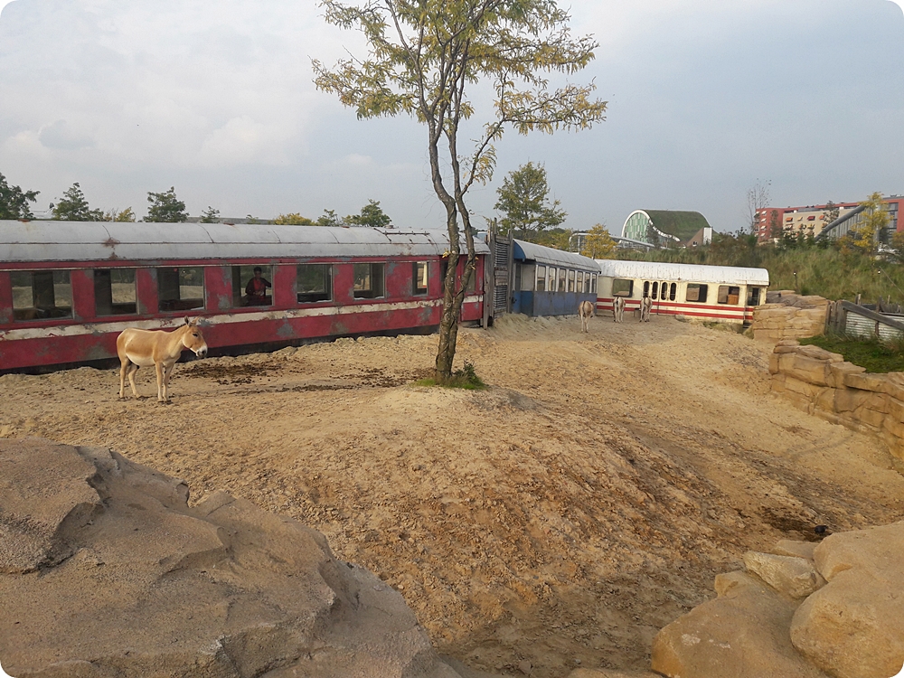 A „kunyhót” hátrahagyva a szafari alatt már részben megismert sivatag-bemutatóhoz juthatunk el. A látványban egyaránt megjelenő fiktív történet szerint a sivatagban kisiklott egy vonat, melynek hátrahagyott személykocsijai ötletes módon kettéosztják a kifutót lehetővé téve az esetleges szeparációt. A vasúti kocsikon továbbá a látogatók is keresztülhaladhatnak, így közelebbről is szemügyre vehetőek a sivatag lakói. Jelenleg a nagyobb kifutórészen élnek együtt a kétpúpú tevék és onagerek, míg 2017-es látogatásom alatt utóbbiak voltak leválasztva a kisebb kifutórészre.