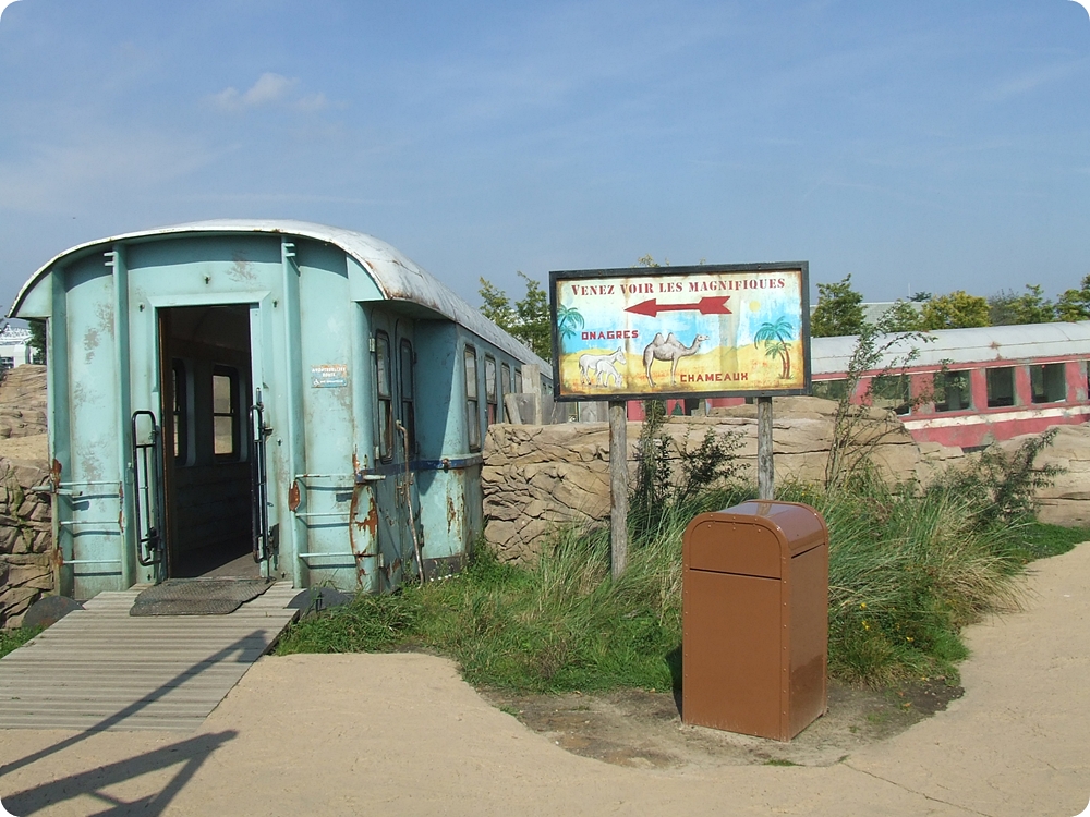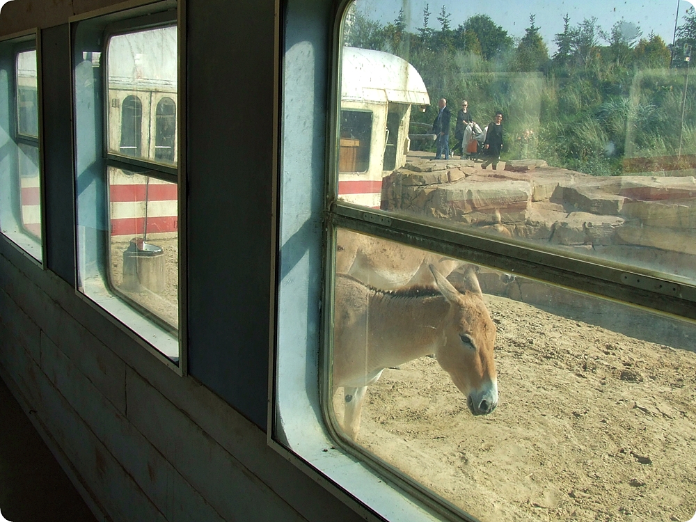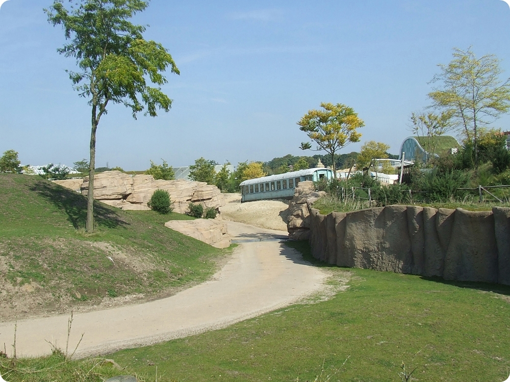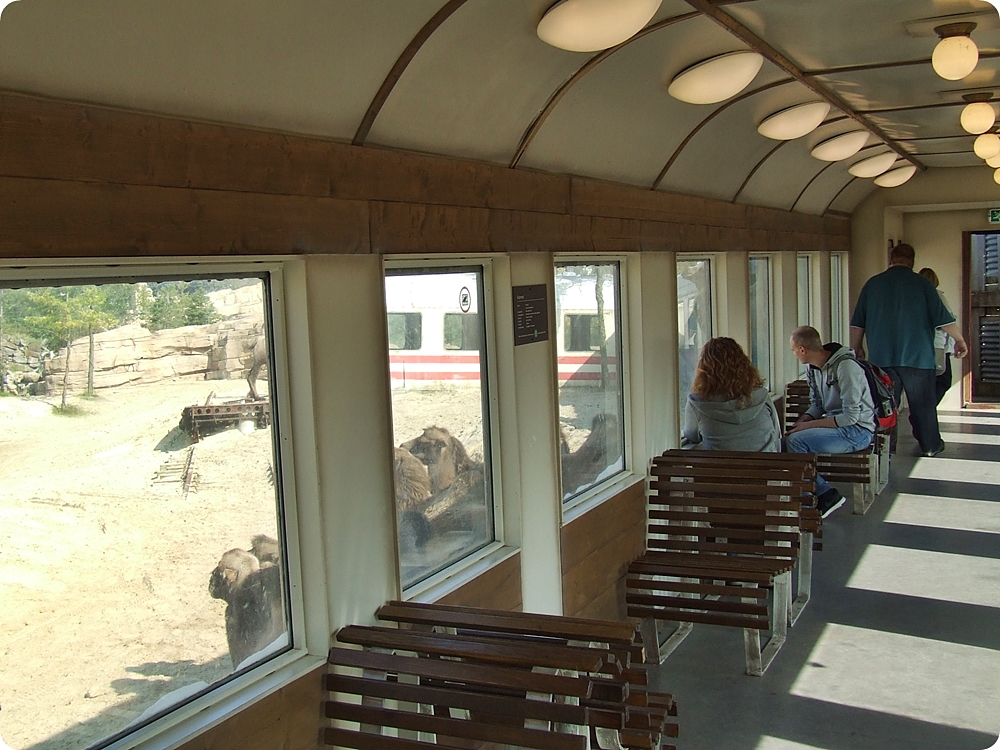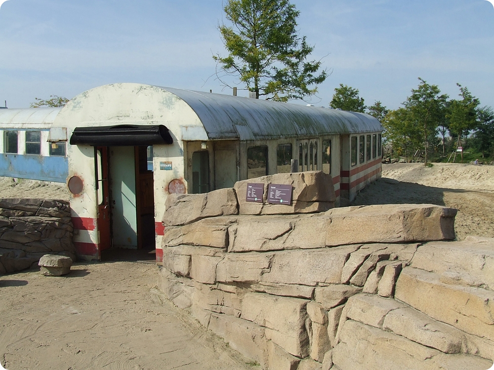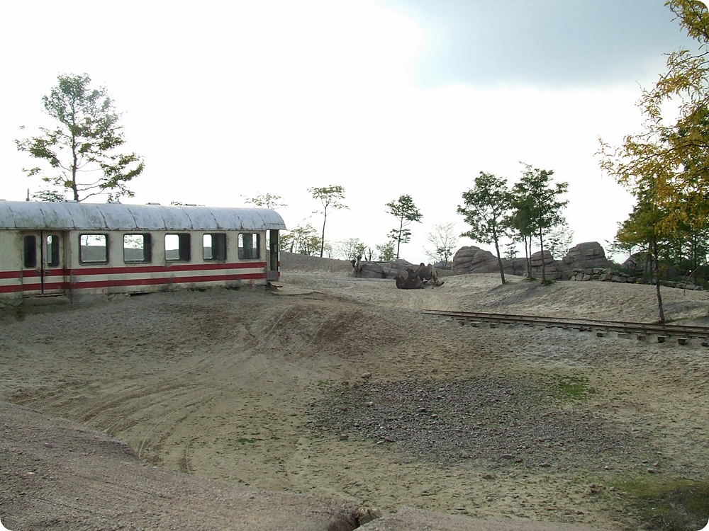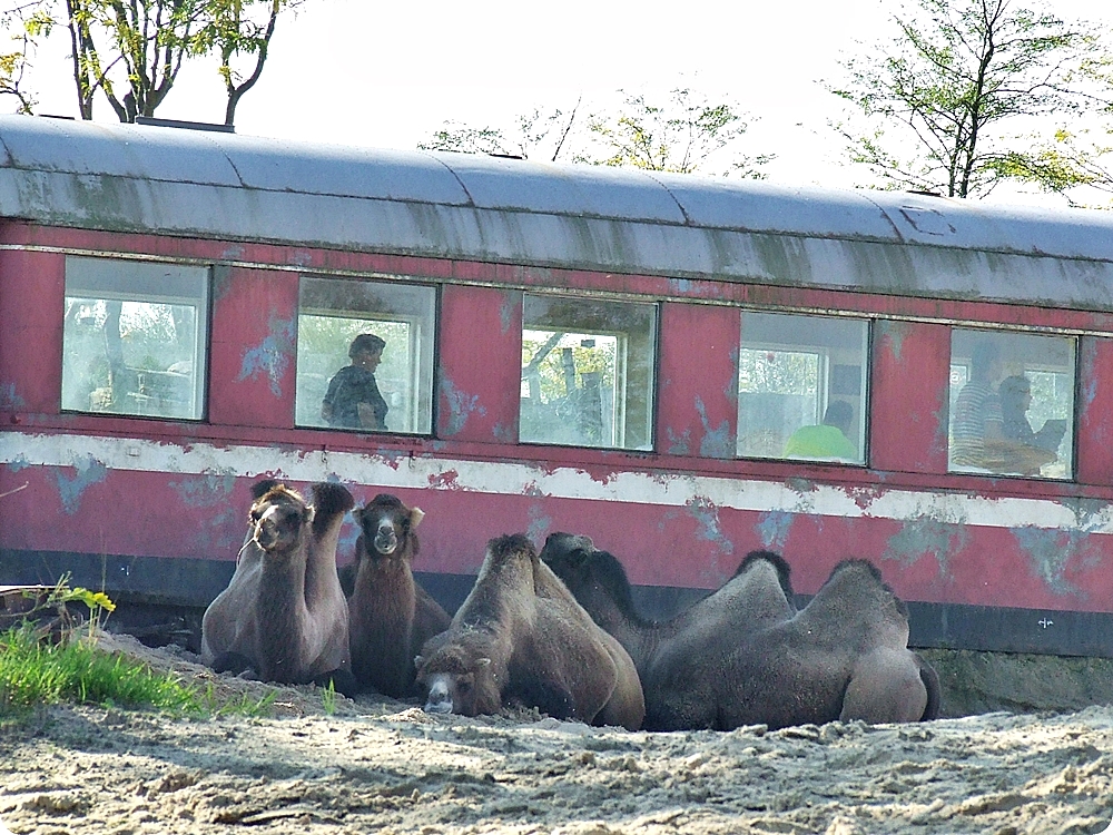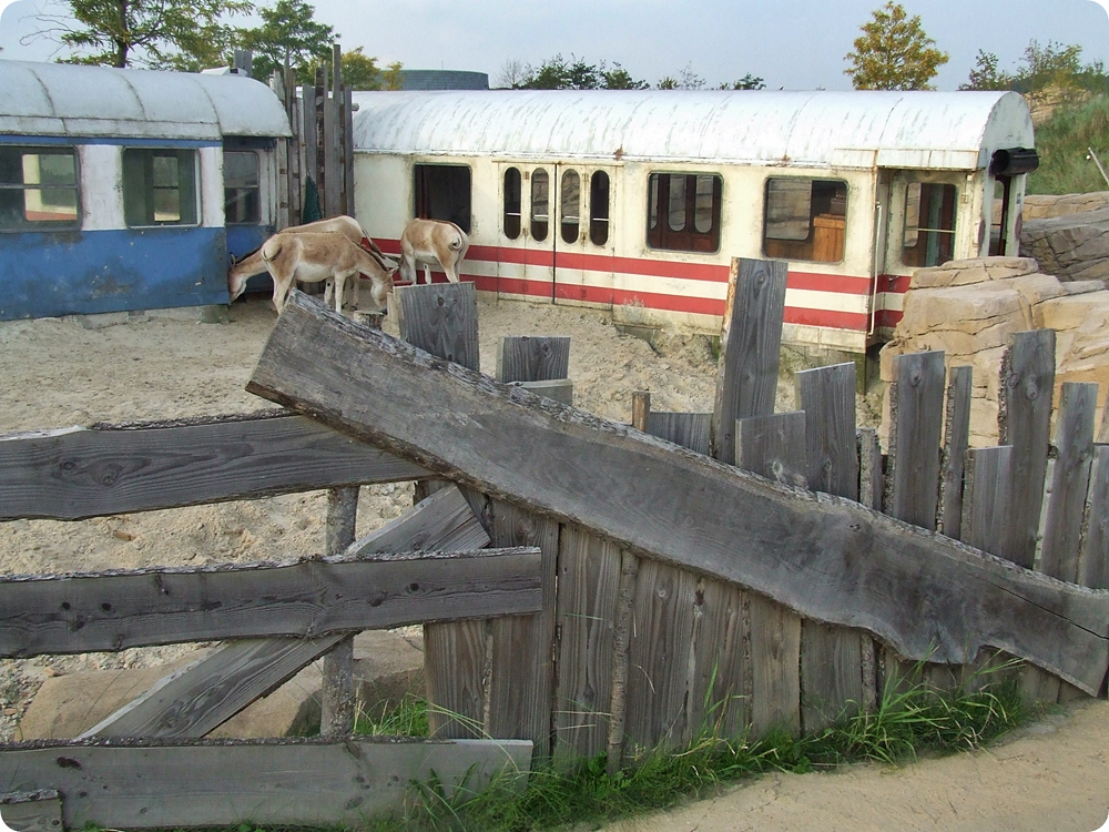 A „kunyhót” hátrahagyva a szafari alatt már részben megismert sivatag-bemutatóhoz juthatunk el. A látványban egyaránt megjelenő fiktív történet szerint a sivatagban kisiklott egy vonat, melynek hátrahagyott személykocsijai ötletes módon kettéosztják a kifutót lehetővé téve az esetleges szeparációt. A vasúti kocsikon továbbá a látogatók is keresztülhaladhatnak, így közelebbről is szemügyre vehetőek a sivatag lakói. Jelenleg a nagyobb kifutórészen élnek együtt a kétpúpú tevék és onagerek, míg 2017-es látogatásom alatt utóbbiak voltak leválasztva a kisebb kifutórészre.