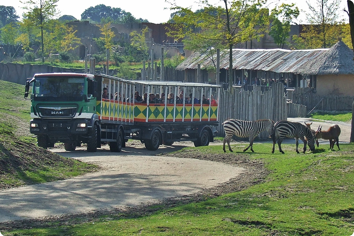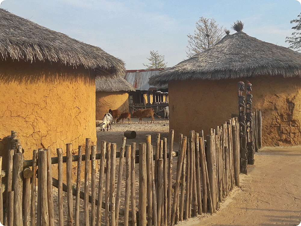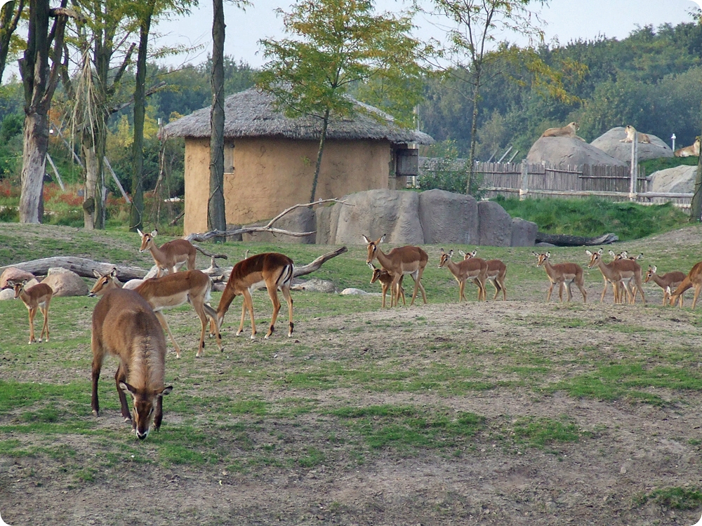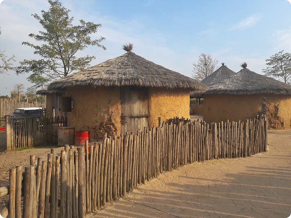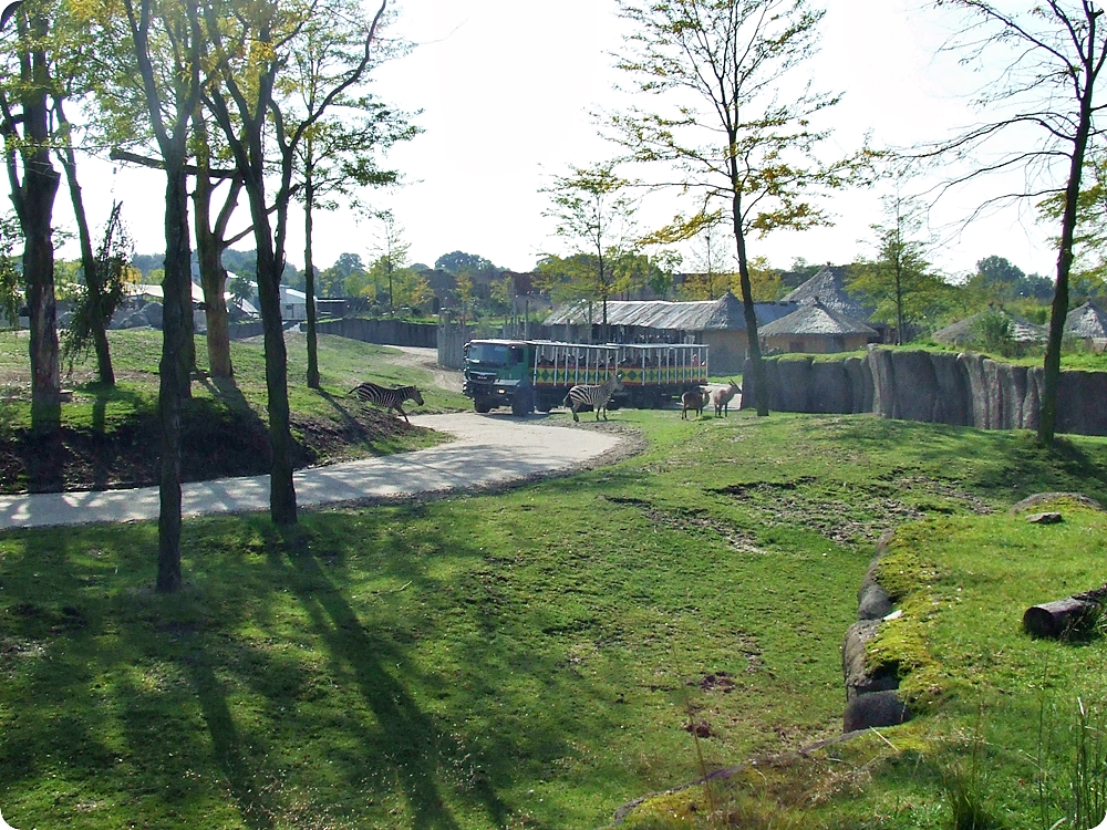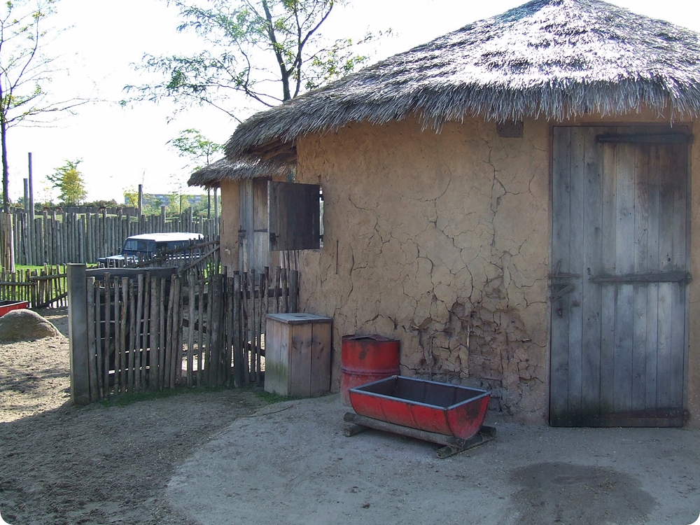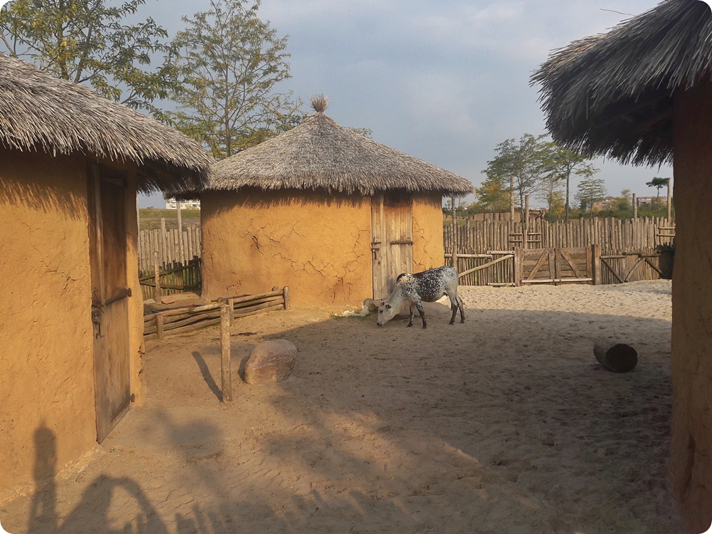 A kanyargós látogatói útvonal a „Zebu-kraal” (Zeboekraal) nevű bemutató irányába vezet bennünket. A „kraal” egy afrikaans (illetve régebbi nevén búr) vagy holland szó, amely eredetileg dél-afrikai falvakban szarvasmarhák vagy más haszonállatok tartására szolgáló nagyjából kör alakú területet jelent, melyet tövises bozótok ágaival, sárfallal vagy egyéb kerítéssel vesznek körbe. Az itt megjelenő település tulajdonképpen egy maszáj „karámfalu”, az az egy „maszáj kraal” másolata. A Kenya déli síkságain és Tanzánia északi részén élő maszájok Kelet-Afrika egyik legismertebb etnikai csoportja. A félnomád életmódjukról, feltűnő öltözetükről és a lakóhelyük nemzeti parkokhoz való közelsége miatt híres nép létfenntartásának és szokásainak középpontjában a szarvasmarha áll. E tematikának megfelelően a nádfedeles agyagkunyhók között kérődző zebukat – itt törpezebukat (Bos primigenius f. taurus) – láthatunk. A háziállatok jelenleg vörös folyamidisznókkal (Potamochoerus porcus pictus) élnek együtt a szavanna mellett.