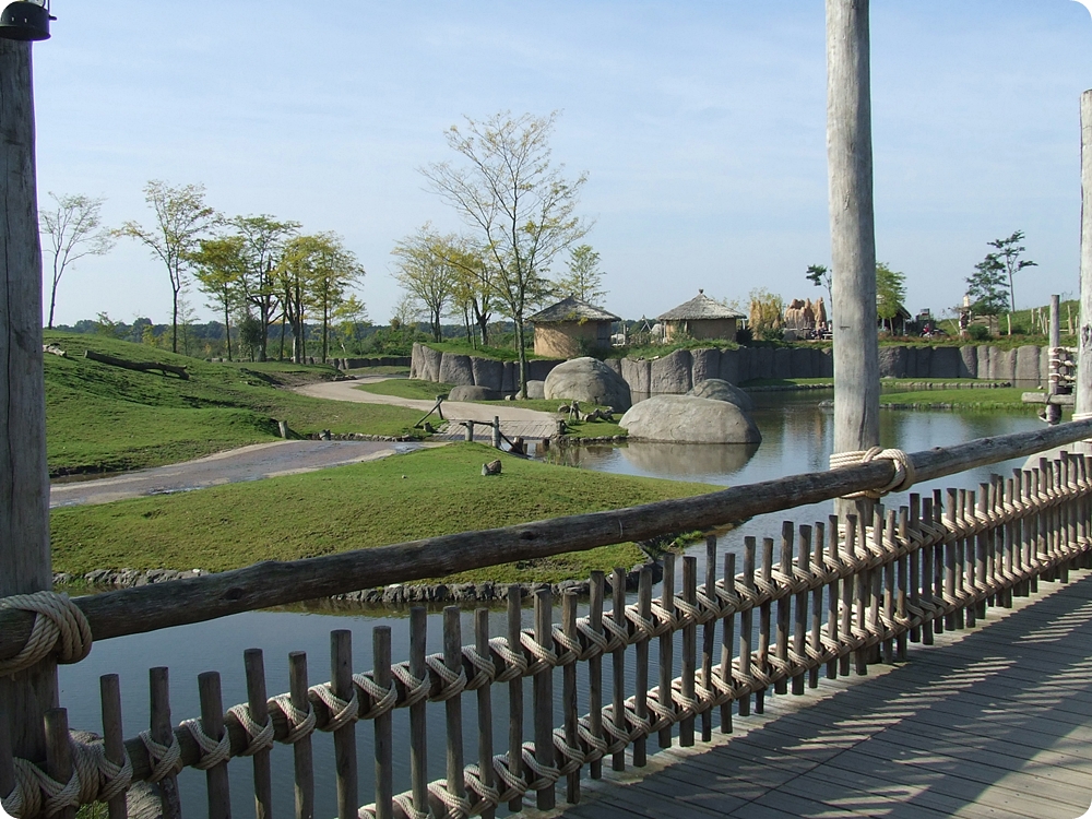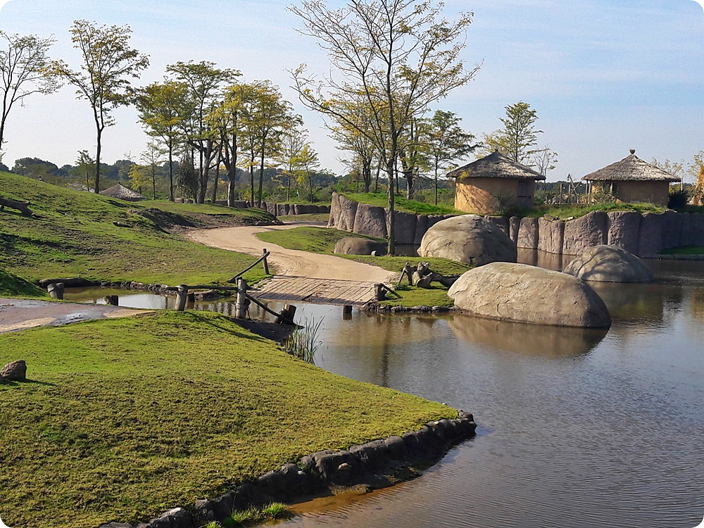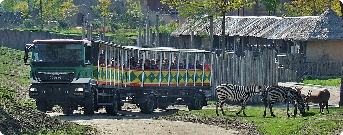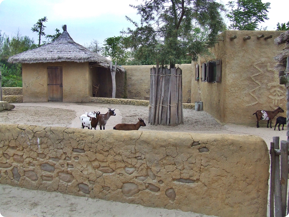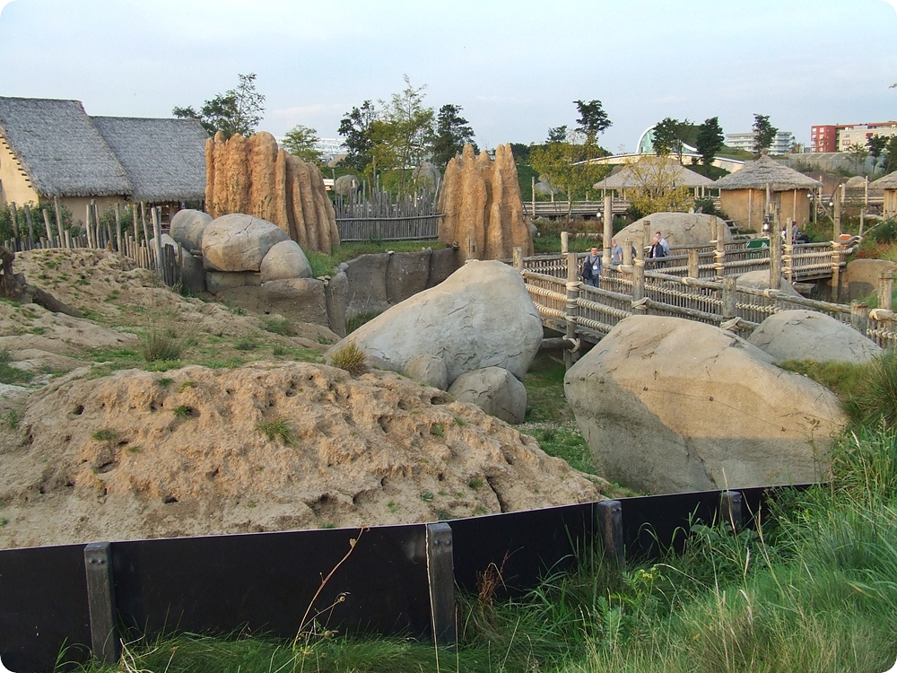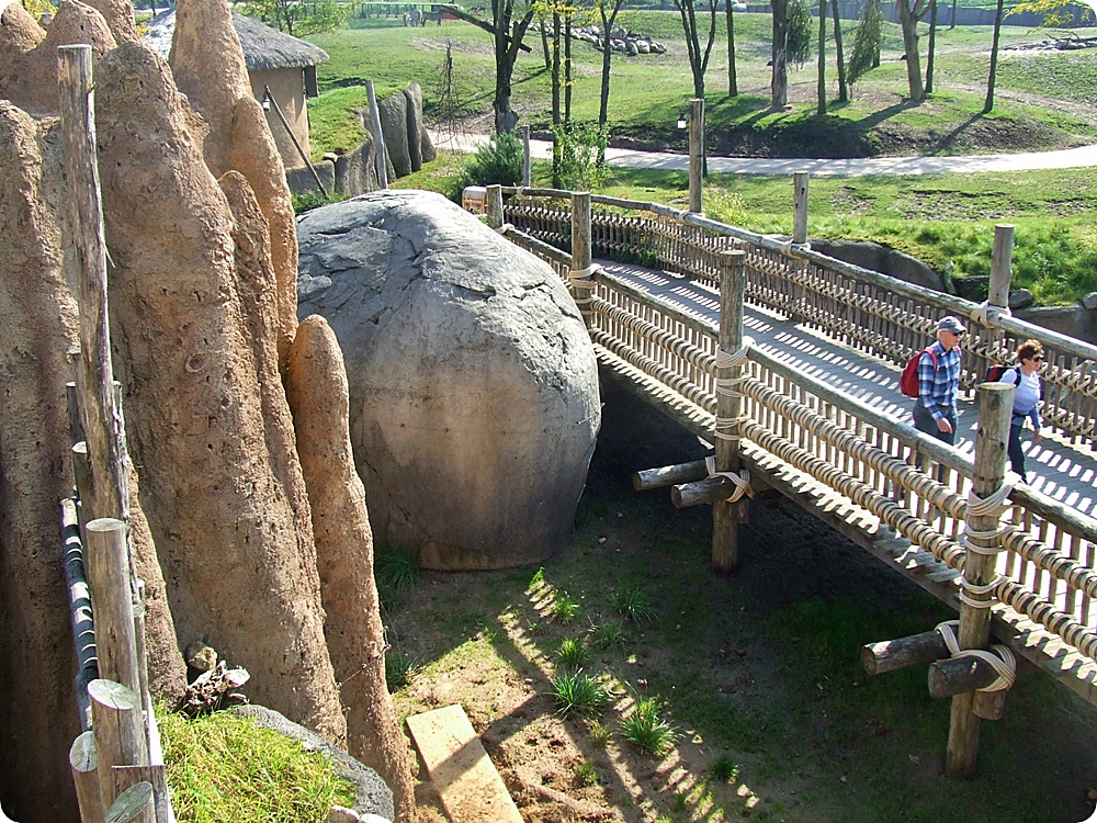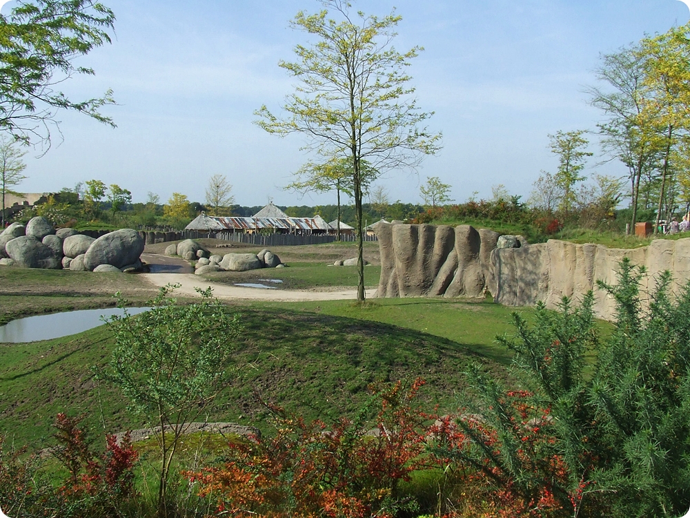 A kanyargós látogatói útvonal a „Zebu-kraal” (Zeboekraal) nevű bemutató irányába vezet bennünket. A „kraal” egy afrikaans (illetve régebbi nevén búr) vagy holland szó, amely eredetileg dél-afrikai falvakban szarvasmarhák vagy más haszonállatok tartására szolgáló nagyjából kör alakú területet jelent, melyet tövises bozótok ágaival, sárfallal vagy egyéb kerítéssel vesznek körbe. Az itt megjelenő település tulajdonképpen egy maszáj „karámfalu”, az az egy „maszáj kraal” másolata. A Kenya déli síkságain és Tanzánia északi részén élő maszájok Kelet-Afrika egyik legismertebb etnikai csoportja. A félnomád életmódjukról, feltűnő öltözetükről és a lakóhelyük nemzeti parkokhoz való közelsége miatt híres nép létfenntartásának és szokásainak középpontjában a szarvasmarha áll. E tematikának megfelelően a nádfedeles agyagkunyhók között kérődző zebukat – itt törpezebukat (Bos primigenius f. taurus) – láthatunk. A háziállatok jelenleg vörös folyamidisznókkal (Potamochoerus porcus pictus) élnek együtt a szavanna mellett.