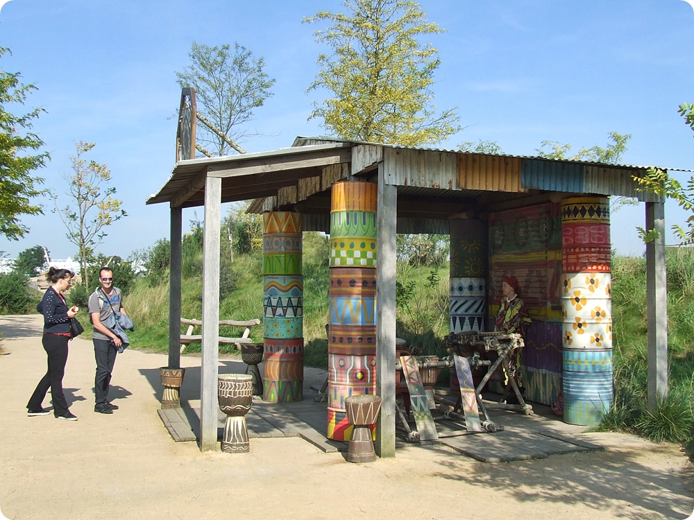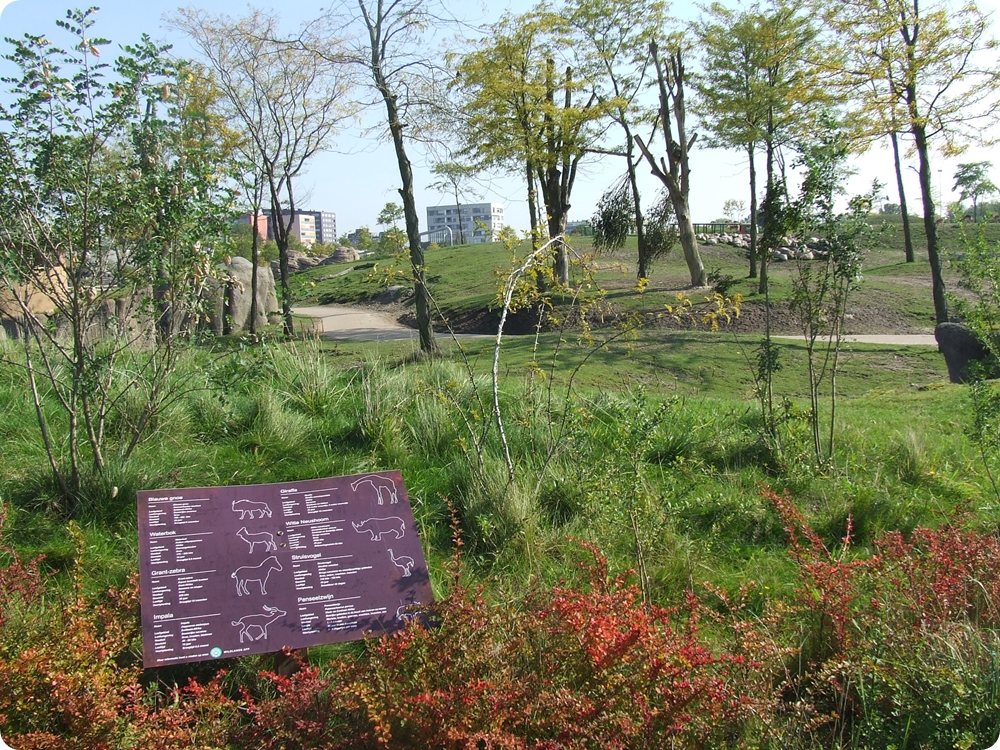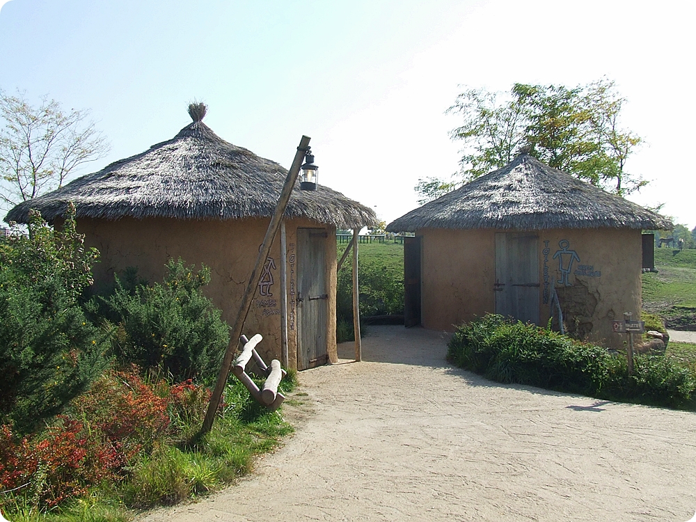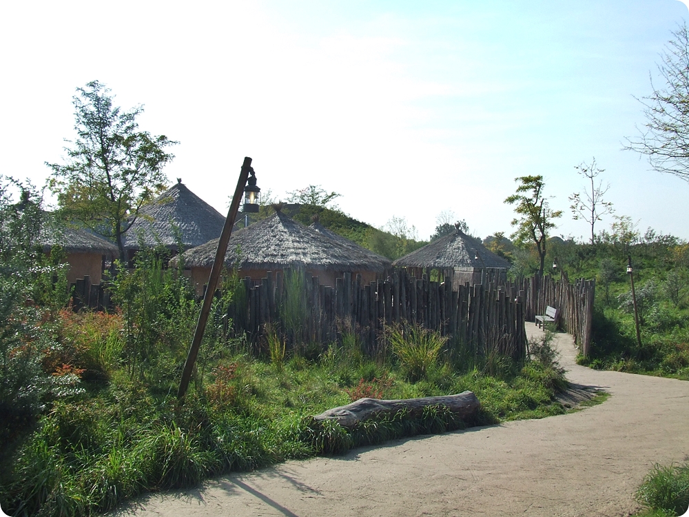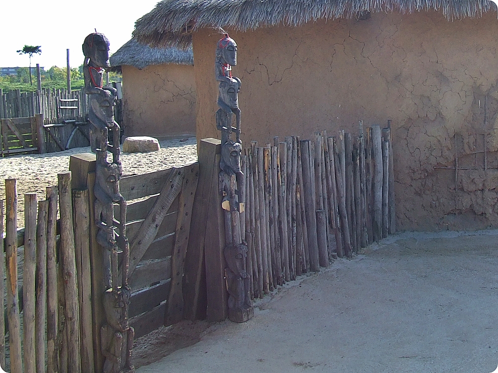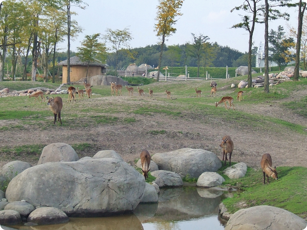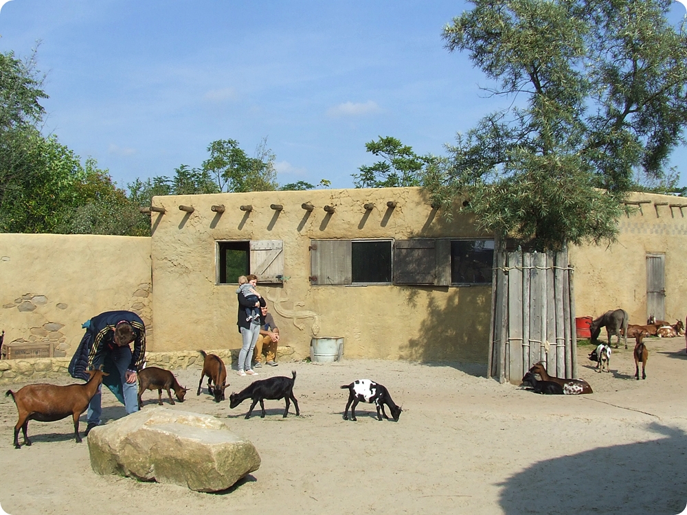 A kanyargós látogatói útvonal a „Zebu-kraal” (Zeboekraal) nevű bemutató irányába vezet bennünket. A „kraal” egy afrikaans (illetve régebbi nevén búr) vagy holland szó, amely eredetileg dél-afrikai falvakban szarvasmarhák vagy más haszonállatok tartására szolgáló nagyjából kör alakú területet jelent, melyet tövises bozótok ágaival, sárfallal vagy egyéb kerítéssel vesznek körbe. Az itt megjelenő település tulajdonképpen egy maszáj „karámfalu”, az az egy „maszáj kraal” másolata. A Kenya déli síkságain és Tanzánia északi részén élő maszájok Kelet-Afrika egyik legismertebb etnikai csoportja. A félnomád életmódjukról, feltűnő öltözetükről és a lakóhelyük nemzeti parkokhoz való közelsége miatt híres nép létfenntartásának és szokásainak középpontjában a szarvasmarha áll. E tematikának megfelelően a nádfedeles agyagkunyhók között kérődző zebukat – itt törpezebukat (Bos primigenius f. taurus) – láthatunk. A háziállatok jelenleg vörös folyamidisznókkal (Potamochoerus porcus pictus) élnek együtt a szavanna mellett.