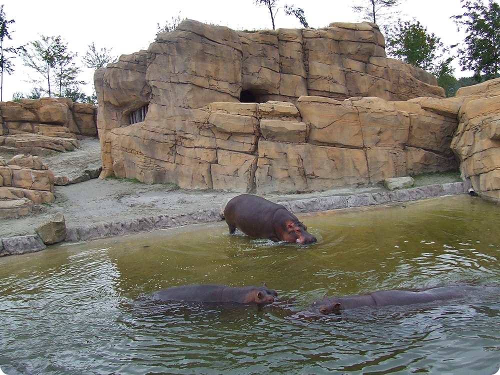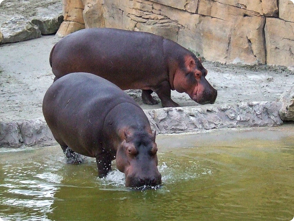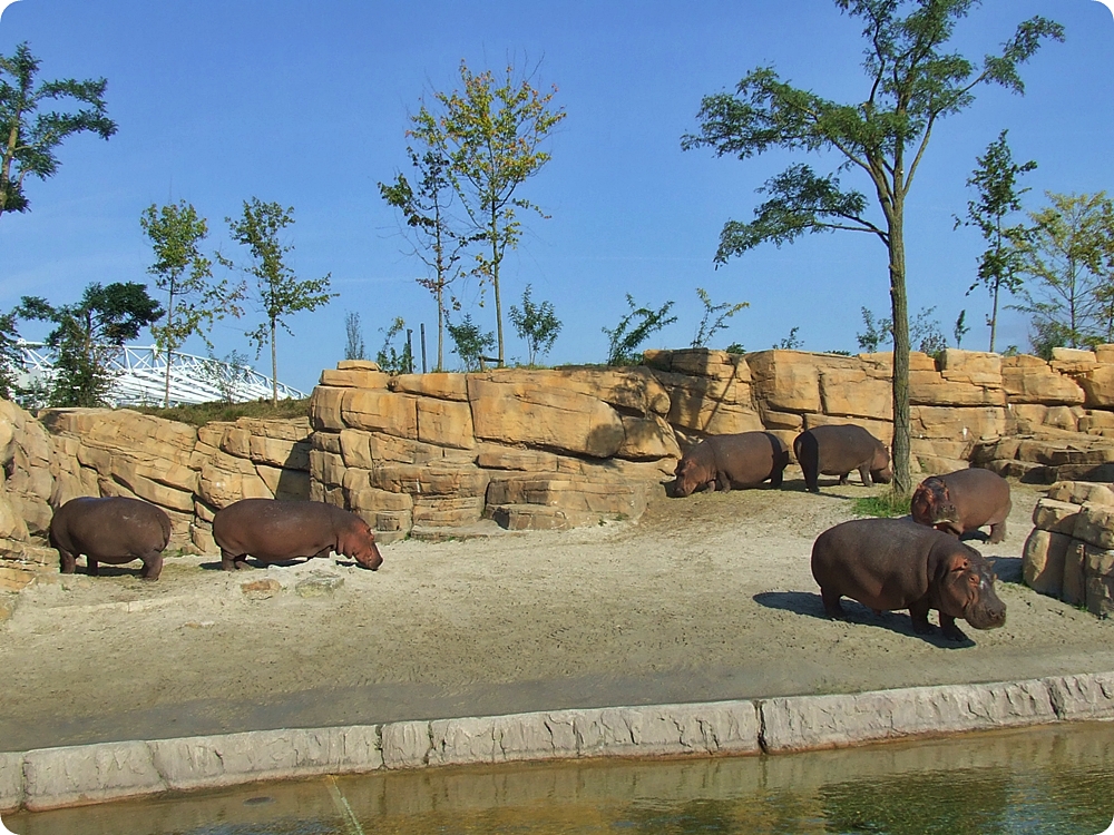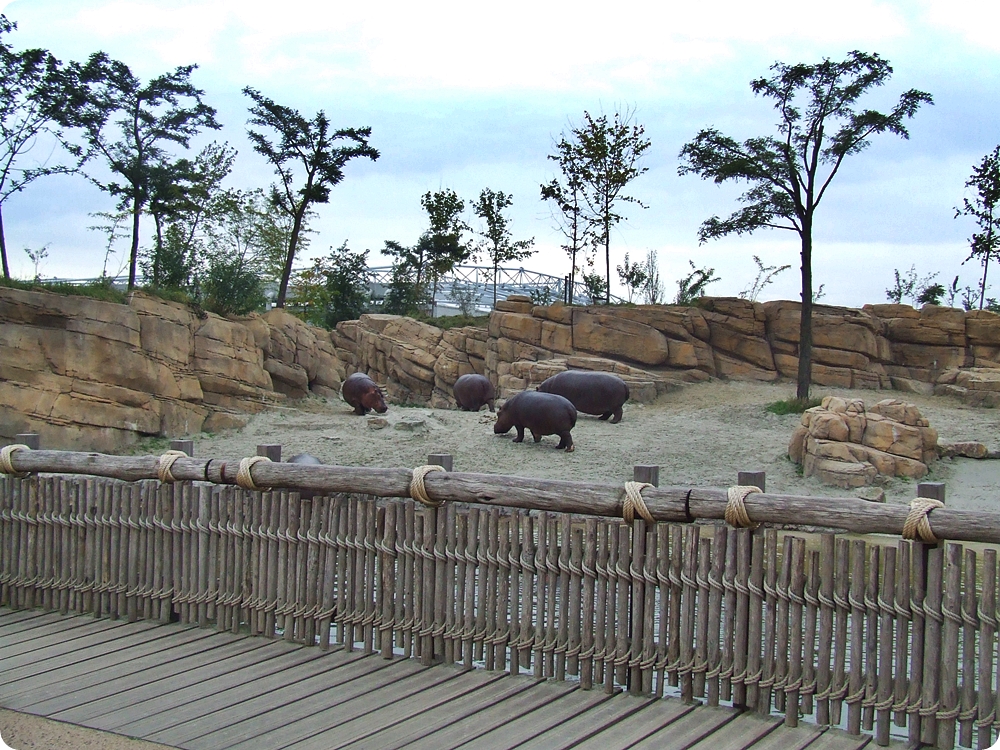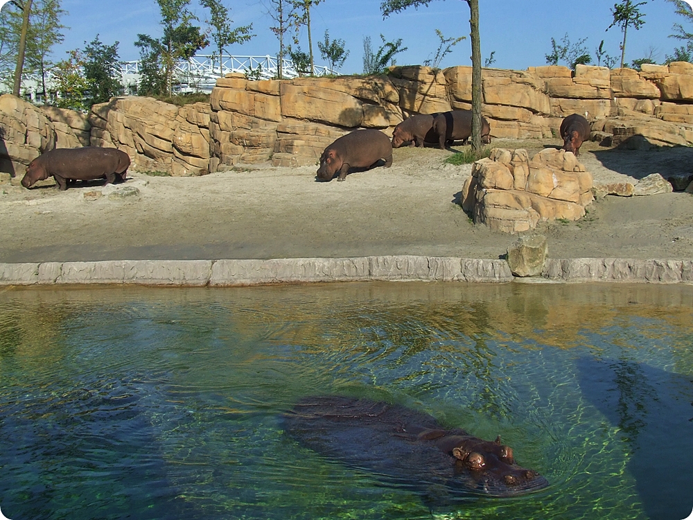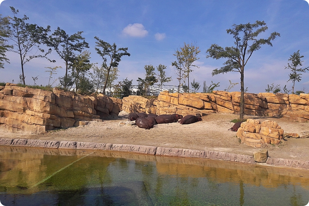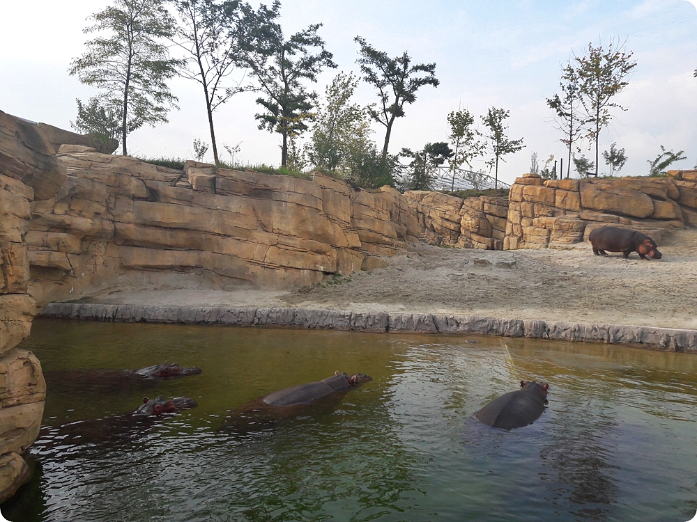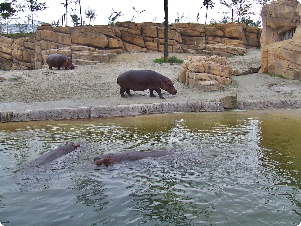 A préri bejárása után ismét „visszarepülünk” Afrikába, ahol a Víziló medence (Nijlpaardenpoel) bemutató lesz a következő állomásunk. A régi állatkert új területi bővítésekor kialakított, előző részben említett nagyszabású pingvinbemutató, a Playa Pinguinos átalakításával kerülhettek új férőhelyükre a park nílusi v. közönséges vízilovai (Hippopotamus amphibius). A vízilótartásnak hosszú hagyománya van Emmenben, az első állat 1947-ben érkezett a régi intézménybe. 1972-ben jegyezték le az első szaporulatot, majd 2008-ig összesen 32 vízilóborjú látta itt meg a napvilágot. Szükséges azonban hozzátenni, hogy az 1990-es évek közepéig viszonylag kevés sikeres felnevelést regisztráltak. Az ezt követő hosszabb időszakban Emmen büszkélkedhetett Európa legnagyobb vízilócsapatával, 2017-es látogatásom során magam is nyolc egyedet számolhattam a kifutón. Az elmúlt években történt állatszállítás és halálozás végett ma azonban „mindössze” öt nőstény lakja a bemutatót. Az emelt kilátópontról való szemlélődés után, a bemutató nagy részét uraló „műszikla-tömegben” lefelé haladva a többtonnás úszóbajnokok víz alatti úszását is megtekinthetjük. A 24 méter hosszan húzódó üveg-betekintőn keresztül ma már tisztább vízben láthatjuk az állatokat: a csapat méretének említett csökkenése, valamint a medencetisztítás és szennyvízkezelés hatékonyságának növelése ma kisebb mértékű biológiai szűréssel, azaz halfajok – amur (Ctenopharyngodon idella) és ponty (Cyprinus carpio) – medencébe történő telepítésével is kiegészül.