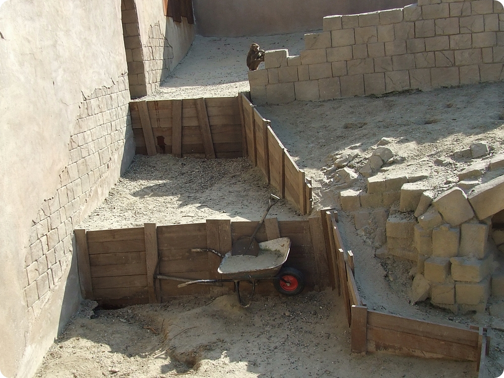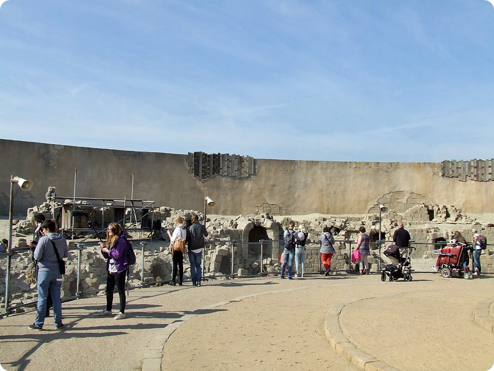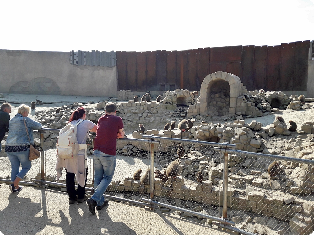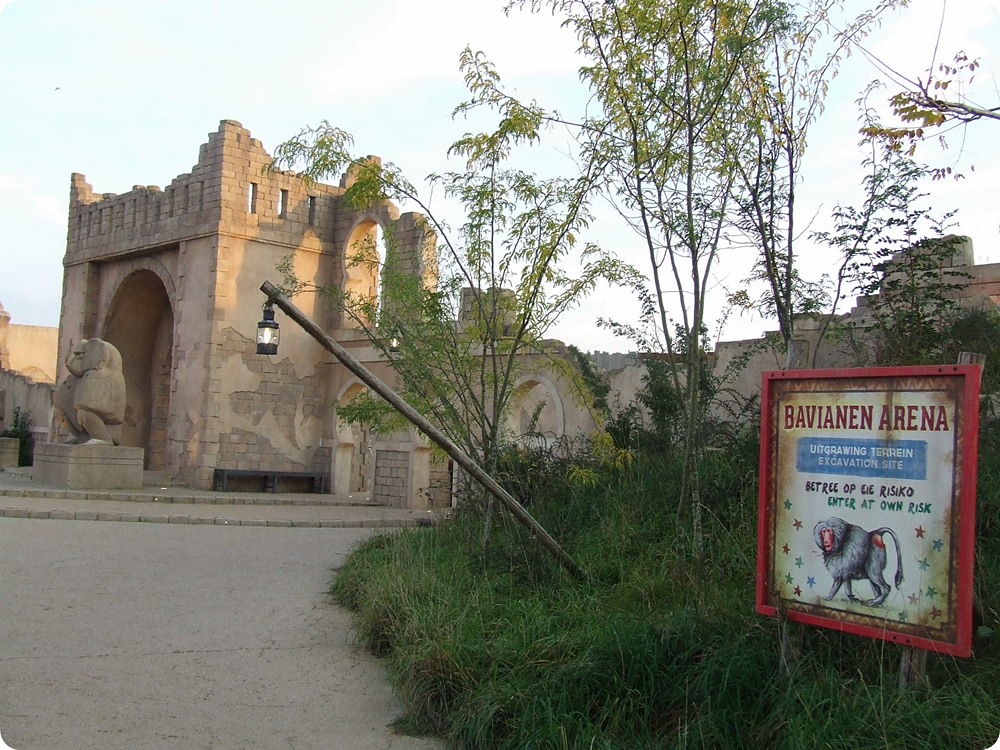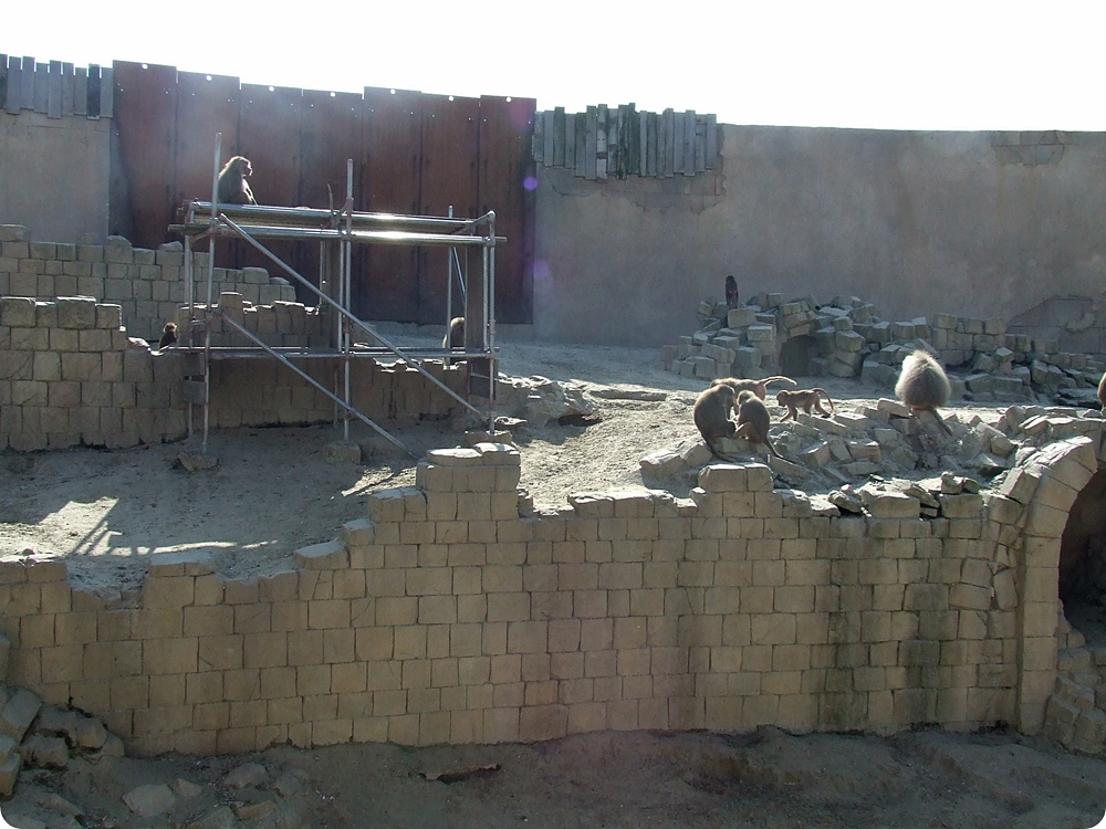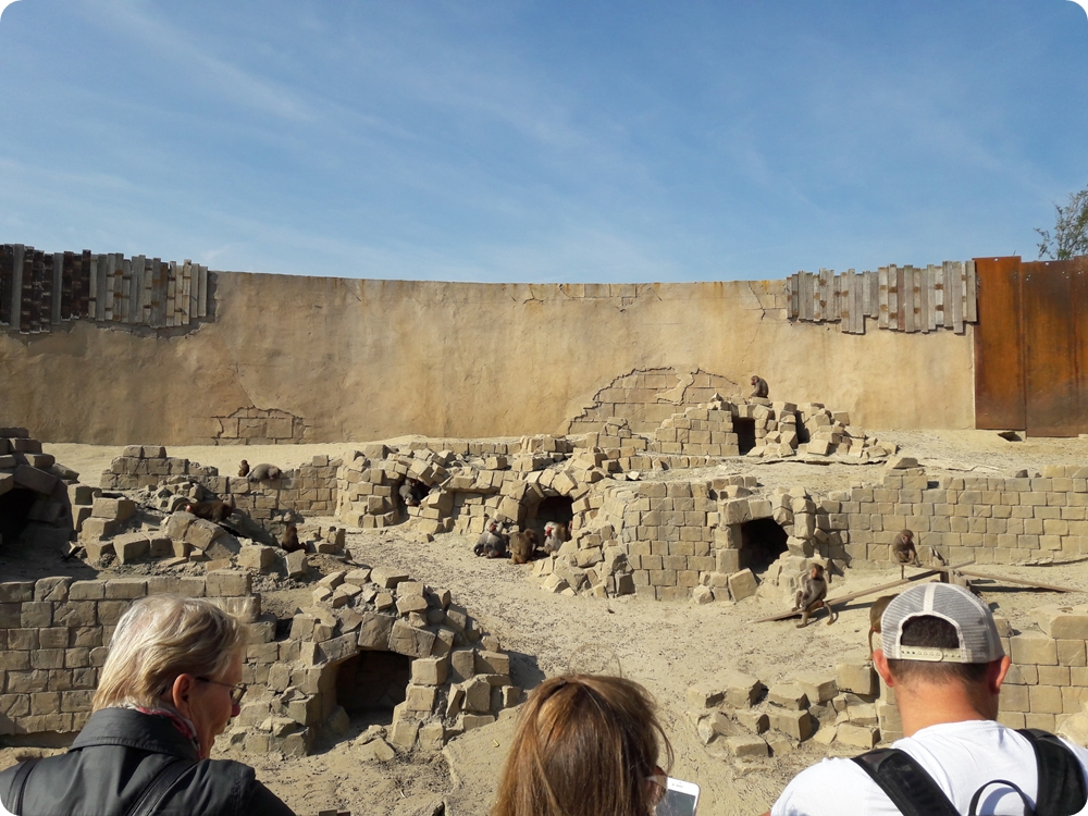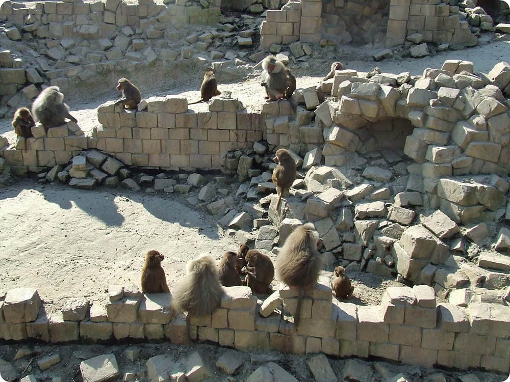 A következő állomás a Pávián aréna (Bavianenarena), ahol a galléros páviánok (Papio hamadryas) jelenleg 126 fős kolóniája kerül bemutatásra. Európában pillanatnyilag csupán a Madridi Állatkert csapata nagyobb néhány példánnyal. A pávián-bemutató egy ősi római amfiteátrum arénáját idézi, ahol éppen régészeti feltárás folyik. A természetben e faj kedveli a sziklás búvóhelyeket, melyet itt az ásatás szám szerint 27, kisebb-nagyobb „kőbunkere” imitál. E mesterséges búvóhelyek egyúttal lehetővé teszik a hatalmas horda háremjeinek és klánjainak megfelelő elkülönülését a meglehetősen egyedinek számító kifutón. Az amfiteátrum romjainak szomszédságában a régészeti feltárás köré szerveződött tábort is megtekinthetjük.