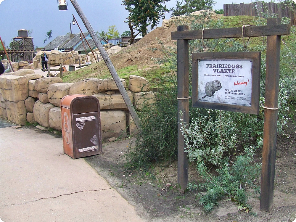Utunkat folytatva egy képzeletbeli állatföldrajzi ugrással Észak-Amerika nagy kiterjedésű füves pusztáira, a prérire érkezünk. A Prérikutya síkság (Prairiedogsvlakte) elnevezésű besétálós bemutató-egység a látogatók egyik kedvence, hiszen a „vadnyugati díszletek” – rozsdás olajoshordók, faládák és lovasszekér – között, a fakorláttal és műsziklával szegélyezett útvonalon bejárható bemutatóban a vendégek között szabadon mozoghat az európai állatkertkek második legnépesebb, jelenleg több mint százfős feketefarkú prérikutya-koloniája (Cynomys ludovicianus). Habár a kíváncsi rágcsálók igen közel engedik magukhoz a vendégeket, az állatok megérintésének tilalmára a bejáratnál elhelyzett nagyméretű tábla hívja fel a figyelmet. Az élmény fokozása végett a bemutatóba történő be- és kilépés szinte észrevétlen marad a látogatók számára: ajtók vagy bármiféle egyéb barrier alkalmazása nélkül, talajba süllyesztett, fektetett, árammal ellátott vasrácsok tartják kifutón belül az állatokat. A módszert sikeresen alkamazzák rotterdami prérikutya-bemutatónál egyaránt, de ez a módszer az alapja a híres apenheul-i főemlőstartásnak egyaránt. A kifutón áthaladva a Préri Kávézó (Prairie Café) vendéglátóegységhez, valamint a mellette kialakított játszótérhez érkezünk, melyek megjelenésükben szintén stílszerűen illeszkednek az igazi „western” hangulathoz. A játszótér egyébiránt egy aranybányát imitál, ahol a gyermekek az aranymosás folyamatát is kipróbálhatják, míg a víztorony ötletes megoldásként csúszdaként is funkcionál.
