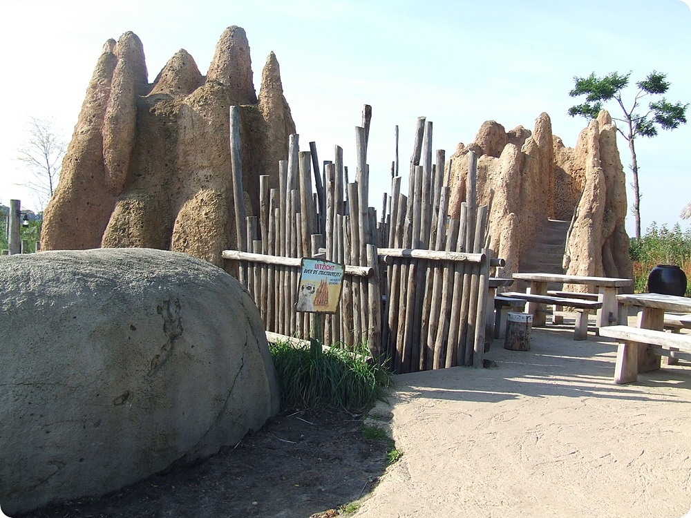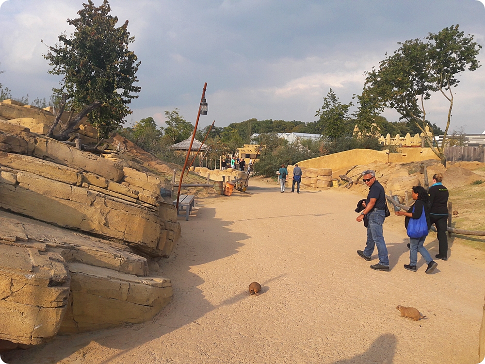 A hídon áthaladva a Kilima Food & Drinks vendéglátóegységhez érkezünk, ahol a szomszédos, kissé bizarr elnevezésű Szurikátagödör (Stokstaartjeskuil) bemutatóban a 16 fős szurikátacsapat (Suricata suricatta) éli mindennapjait. Elmondhatjuk, hogy a láthatóság szempontjából a kifutó igen átgondolt bemutatás-technikával rendelkezik, hiszen három térszintről is megtekinthetőek a méltán népszerű kisragadozók. A kopjék mellett itt további látványelemként jelenik meg két hatalmas műtermeszvár. Ezek egyikének alsó szintjére „lemászva”, kisebb üvegbetekintőkön keresztül remekül megfigyelhetőek az éppen talajszinten tevékenykedő mongúzok. A másik „rovarvár” ezzel ellentétben kilátóként funkcionál, ahol felkapaszkodva remek paroráma nyílik nem pusztán a szurikáták területére, hanem a környező táj egészére egyaránt. A középső térszintről történő szemlélődés lehetőségét a kifutón keresztülhaladó emelt fahíd adja. Az oroszlánok megfigyeléséhez hasonlóan itt is dominál az a hatás, miszerint egy alsó nézőpontból a magasabban elhelyezkedő látvány – esetünkben a sziklákon mozgó kisemlősök – szemlélésekor a horizont alatt eltűnik a zavaró hatást jelentő elemek, például különféle épületek vagy egyéb mesterséges tárgyak látványa.