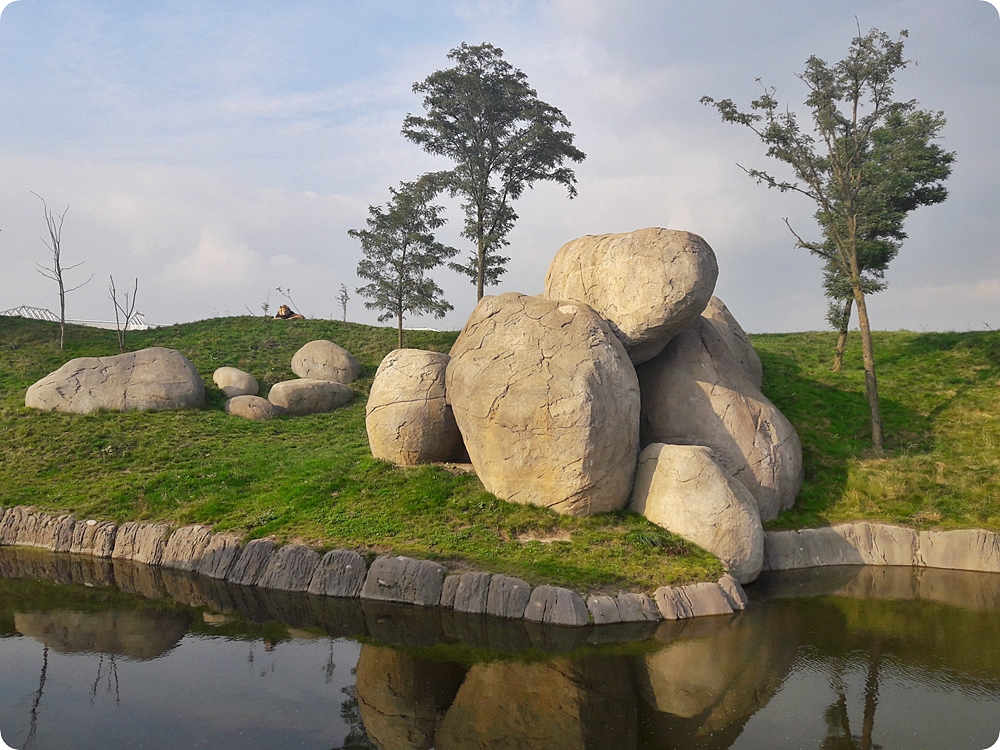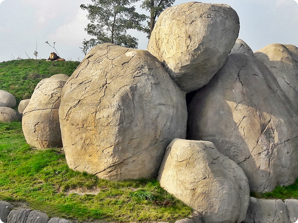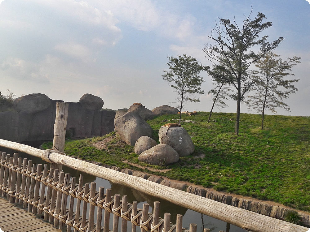 A játszóházat elhagyva, azonban tulajdonképpen már korábban, a víziló-bemutató előtti műszikla-boltívre helyezett tábla alatt áthaladva – a sziklaboltívre függesztett tábla tanúbizonysága szerint – megérkezünk a fiktív, 2018-ban alapított Momma Dunia Nemzeti Parkba (Momma Dunia National Park). A régi emmeni állatkert egyik legkiemeltebb, már-már ikonikusnak számító bemutatójának, a szavannakifutónak az újjászületését láthatjuk további utunk során, kiegészülve e központi kifutó köré rendeződött további bemutatók bejárásával. Tehát az Animazia játékvilágát elhagyva járjuk körbe tematikusan a területet. A centrális fekvésű szavannakifutó egyik oldalán húzódó kiterejedt tórendszer található, melynek a közepén hosszan átívelő, fából készült emelt gyaloghídon vezet tovább utunk. A tó egyben vizesárok funkcióját tölti be a híd jobb oldalán elnyúló, Oroszlánhegy (Leeuwenberg) elnevezésű kifutónál, ahol az oroszlánok (Panthera leo) hétfős családja fogadja a látogatókat. A bemutató elnevezése nem véletlen, hiszen az itt kiépített terjedelmes műszikla-tömeg a kelet-afrikai szavannák jellegzetes, erózió által legömbölyített, elsősorban gránitból keletkezett sziklaformációit, a kopjéket jeleníti meg. Az igen élethűen visszaadott sziklakibúvások kisebb „testvérei” a terület közelebbi és távolabbi pontjain, szomszédos kifutóin – így a szavannán és szurikátakifutón is – egyaránt előtűnnek, egységes tájképet alkotva a panorámában. Az oroszlánkifutó tava – amelybe jászkeszegek (Leuciscus idus) kerültek telepítésre – a gyaloghíd teljes hosszában határolóelemként funkcionál, és üvegbetekintő alkalmazása nélkül meglehetősen nagy távolságot tart a nagyragadozók és látogatók között. Habár az oroszlánok „testközelből” történő megfigyelése nem lehetséges, ezt kompenzálja a távoli, magas sziklákon pihenő oroszláncsalád idilli látványa.