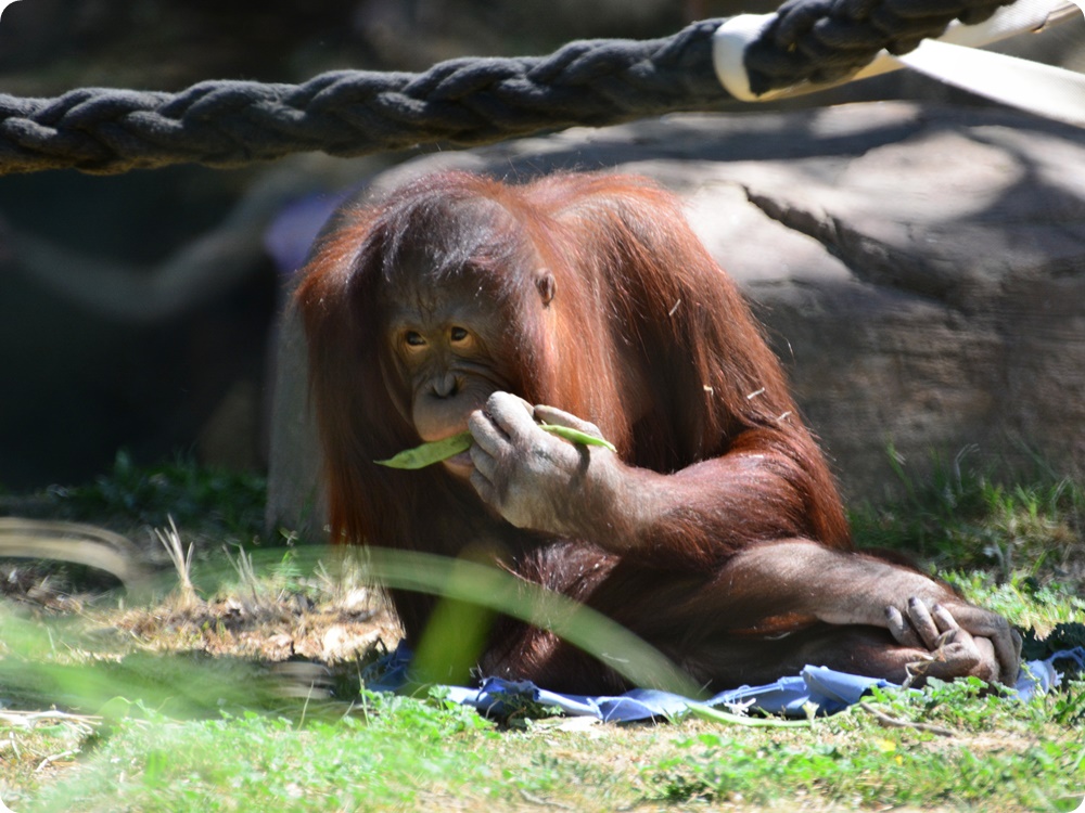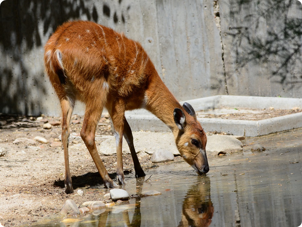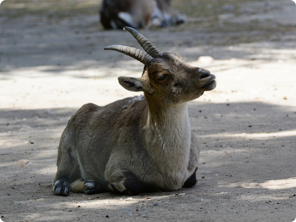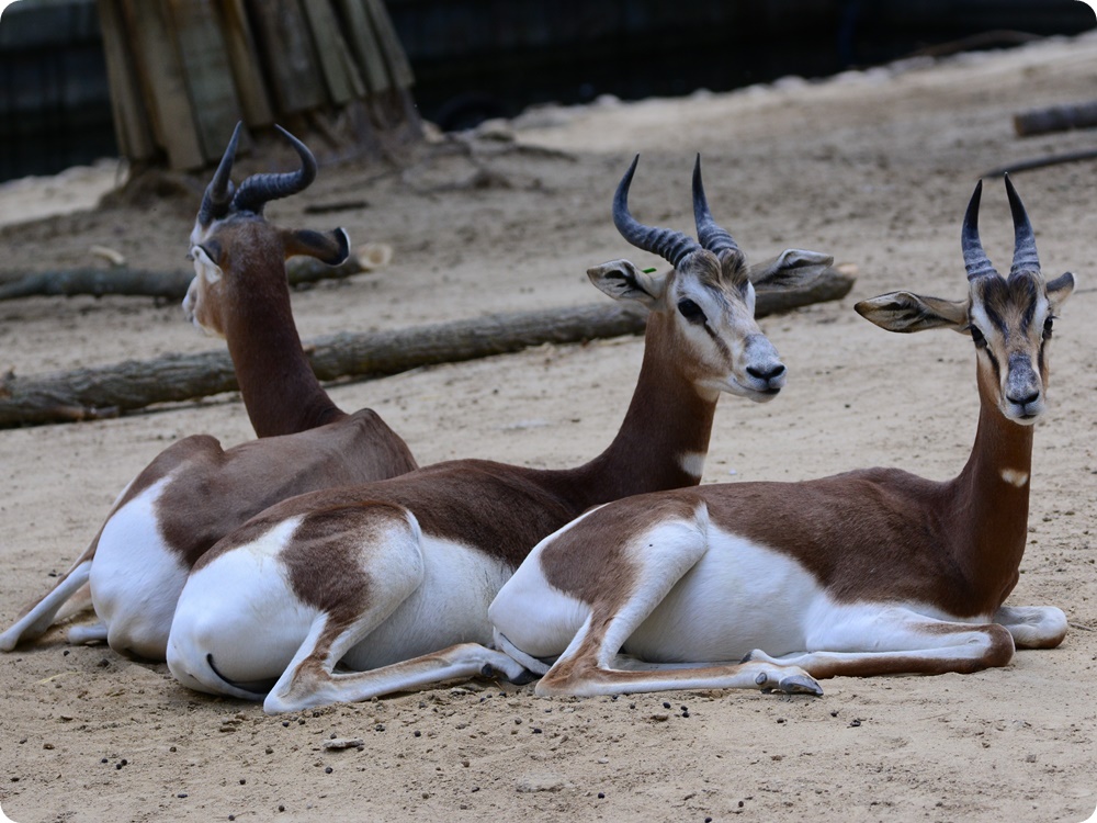 Az állatkert középső részén főként olyan állatfajok kifutói helyezkednek el, melyek nem illeszkednek szorosan a földrajzi alapú koncepcióba. Egy betonistálló körül kialakított, vizesárokkal határolt kifutórendszerben vörös bivalyok (Syncerus caffer nanus), illetve Mhorr-gazellák (Nanger dama mhorr) élnek, utóbbiak nílusi ludakkal (Alopochen aegyptiaca) osztoznak a területen. Itt találjuk a borneói orangutánok (Pongo pygmaeus) és fehérkezű gibbonok (Hylobates lar) dróthálóval határolt közös kifutóját. Az itt élő főemlősöket a belső férőhelyek irányából, egy lépcsőn leereszkedve üvegfalon keresztül is megtekinthetjük. A közelmúltig az állatkert bemutatott egy Európában igen ritkán tartott gibbonfajt, a Müller-gibbont (Hylobates muelleri) is, az utolsó állat 2022-ben pusztult el, így sajnos lemaradtam erről a zoológiai kuriózumról. A közelben található, nem túl bizalomgerjesztő külsejű majomház csimpánzok (Pan troglodytes) és mandrillok (Mandrillus sphinx) belső férőhelyeinek ad otthont. A csimpánzok külső kifutója felülről is fedett, rácsok és üvegfal kombinációjával határolt ketrec, tágasnak közel se mondható, de élő növények teszik változatosabbá. A mandrillok külső kifutói talán az állatkert legelszomorítóbb férőhelyei, a múlt század szemléletét idéző, rácsos, leromlott állagúak. Remélem, rövidesen átalakításra kerül ez a modern állattartásra jelenlegi formájában alkalmatlan komplexum. A terület egyik legizgalmasabb élményét a szahara dorkaszgazellák (Gazella dorcas osiris) jelentették: az állatkertben egyébként is ritka gazellafaj nagy csapata él vizesárokkal határolt, tágas kifutóban, de különösen azért emlékezetesek számomra, mert látogatásomkor egy éppen akkor született gazellaborjú első lépéseit sikerült megörökítenem.