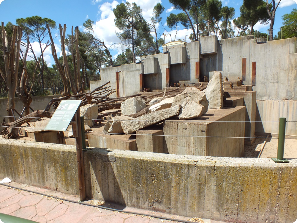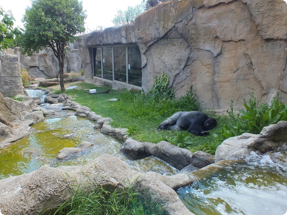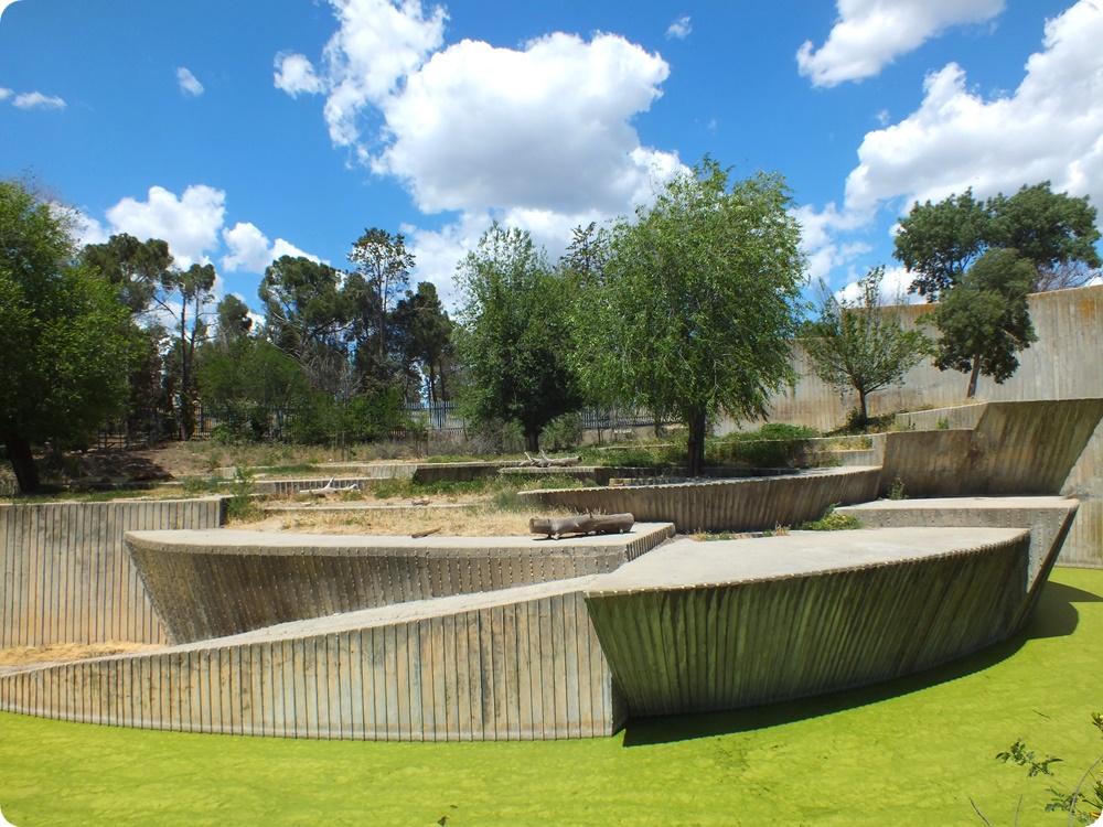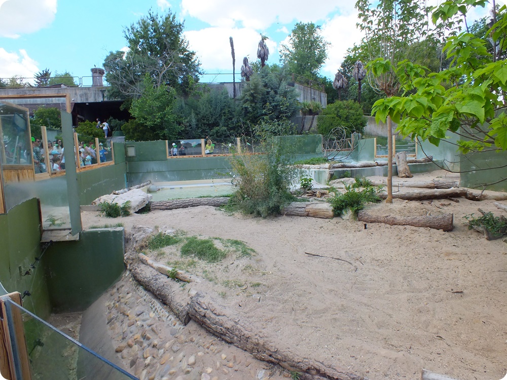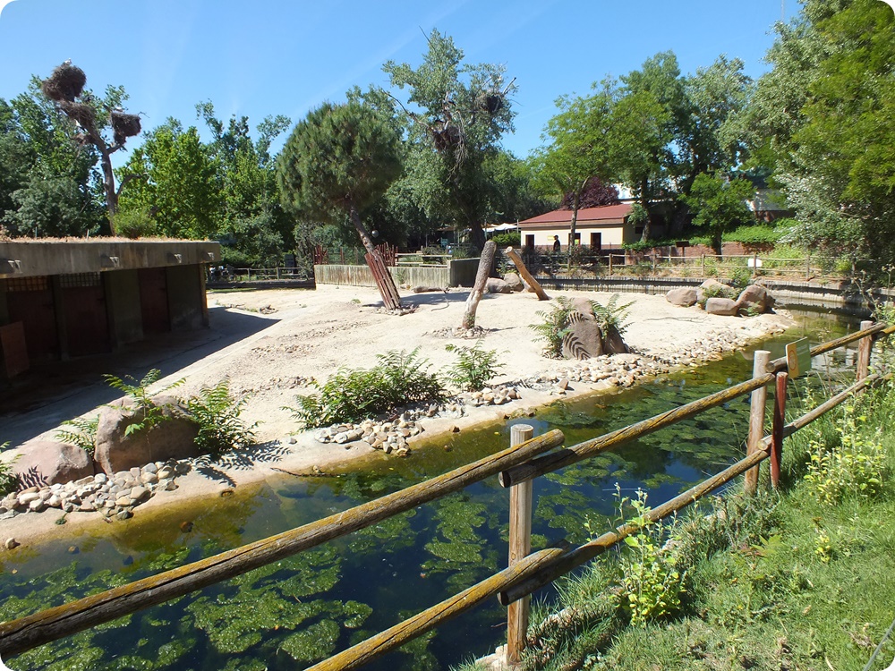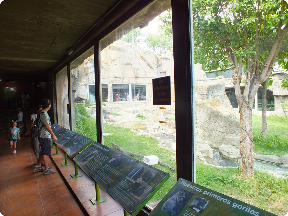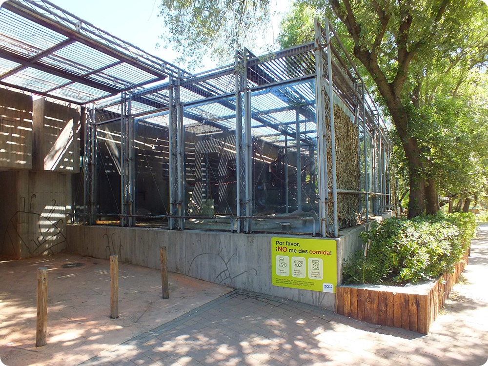 A síkvidéki nyugati gorillák (Gorilla gorilla gorilla) kifutója az egyik legfurcsább, amit eddig láttam. Keskeny, hosszan elnyúló, fűvel borított külsőjük kicsi alapterületű (konkrét adatot sajnos nem találtam a méretére vonatkozóan), ráadásul gyakorlatilag mindenféle mászóalkalmatosságot nélkülöz. Madridban 1976 óta foglalkoznak gorillákkal, az első kölyök 1988-ban született. Érdekesség, hogy a jelenlegi hattagú gorillacsapat egyik tagja az 1996-ban Budapesten született Gorka. Nem kell messzire menni egy másik régi ismerős kedvéért: az óriásvidrák (Pteronura brasiliensis) tágasnak mondható, de nem túl szemet gyönyörködtető kifutójának egyik lakója a korábban évekig Budapesten élő Cora.