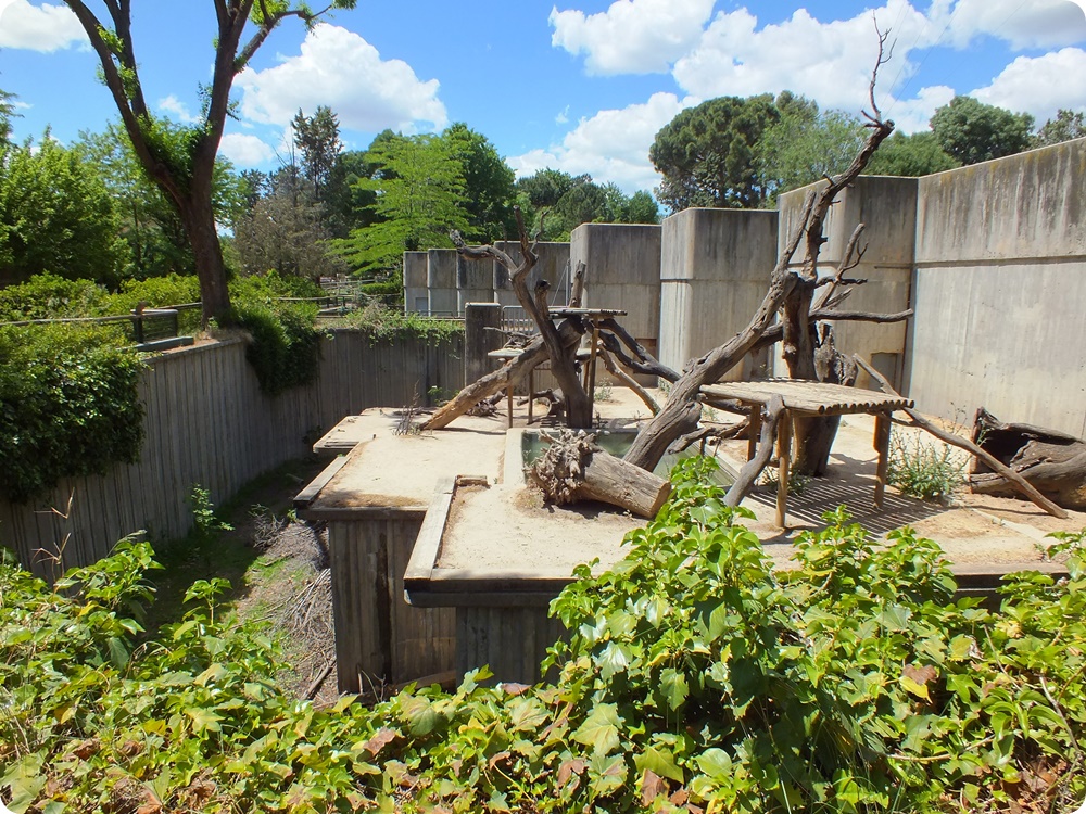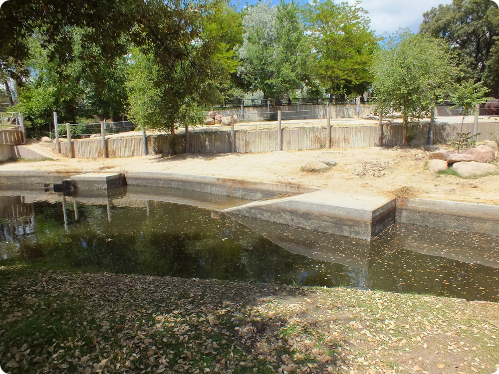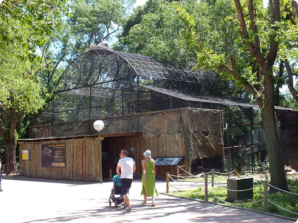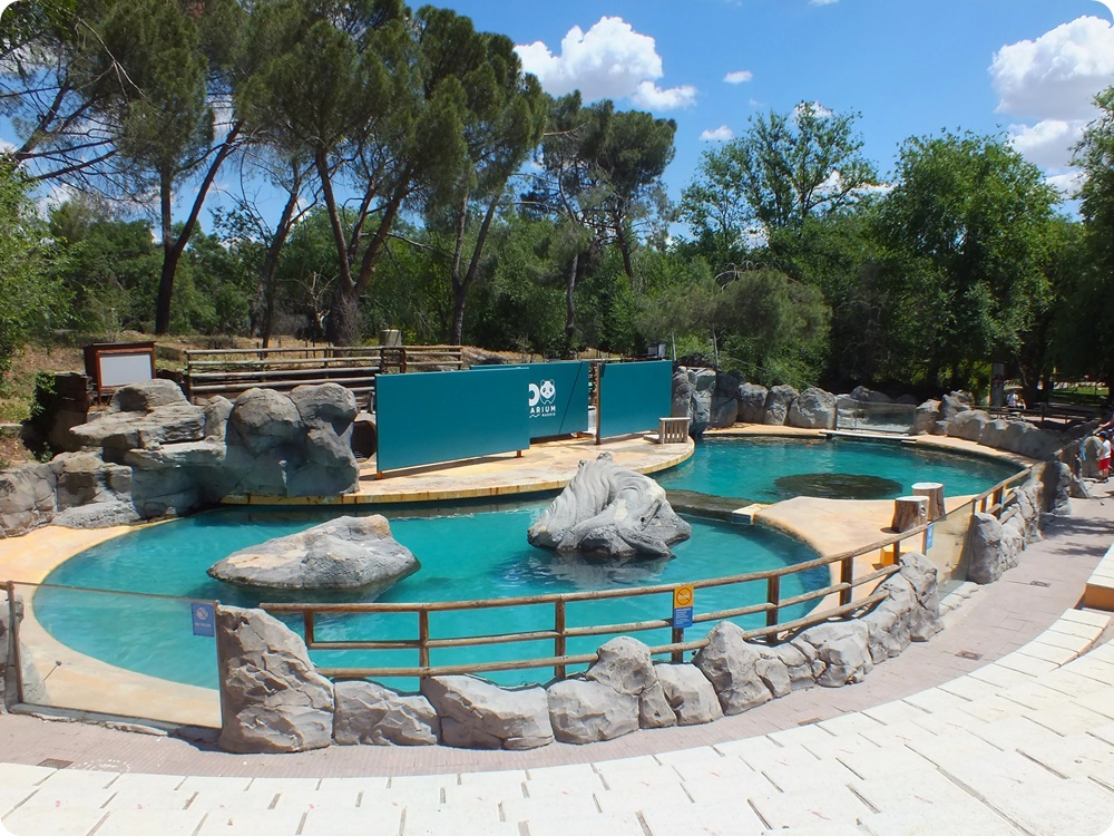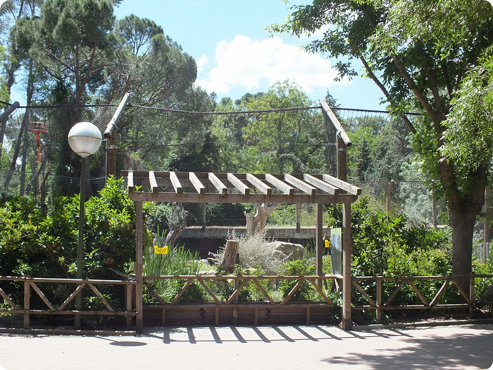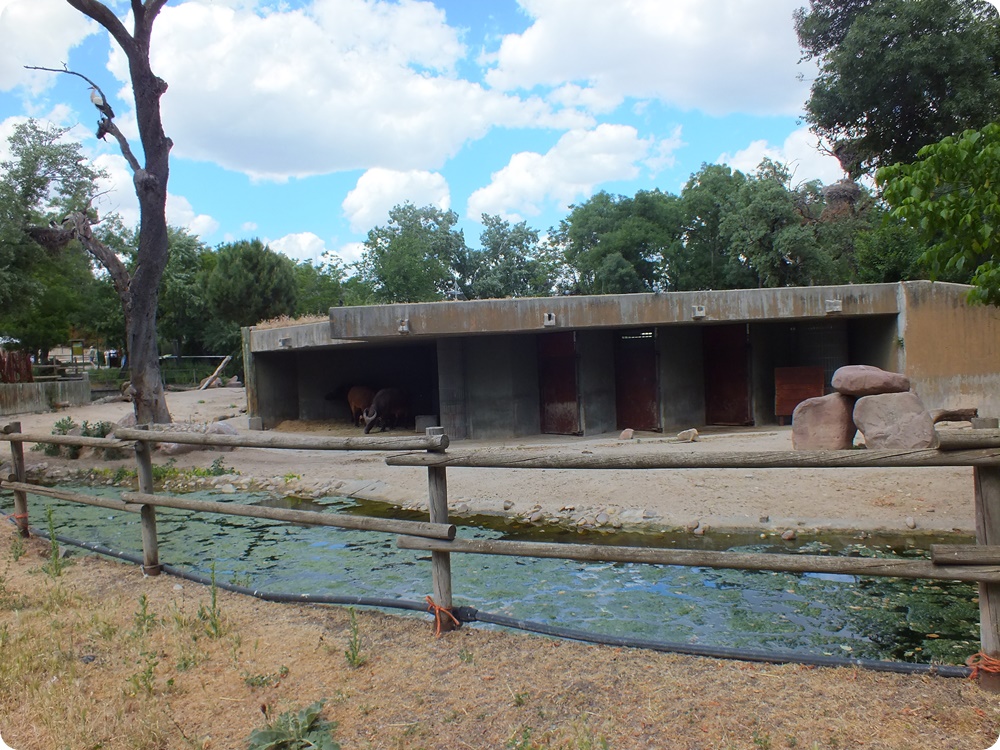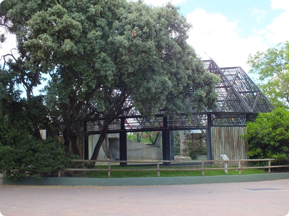 A síkvidéki nyugati gorillák (Gorilla gorilla gorilla) kifutója az egyik legfurcsább, amit eddig láttam. Keskeny, hosszan elnyúló, fűvel borított külsőjük kicsi alapterületű (konkrét adatot sajnos nem találtam a méretére vonatkozóan), ráadásul gyakorlatilag mindenféle mászóalkalmatosságot nélkülöz. Madridban 1976 óta foglalkoznak gorillákkal, az első kölyök 1988-ban született. Érdekesség, hogy a jelenlegi hattagú gorillacsapat egyik tagja az 1996-ban Budapesten született Gorka. Nem kell messzire menni egy másik régi ismerős kedvéért: az óriásvidrák (Pteronura brasiliensis) tágasnak mondható, de nem túl szemet gyönyörködtető kifutójának egyik lakója a korábban évekig Budapesten élő Cora.