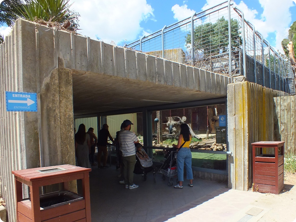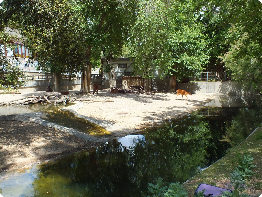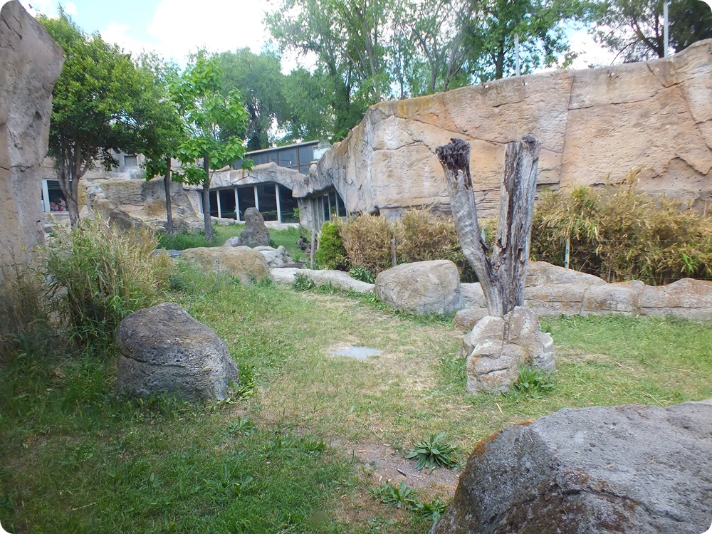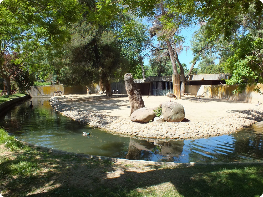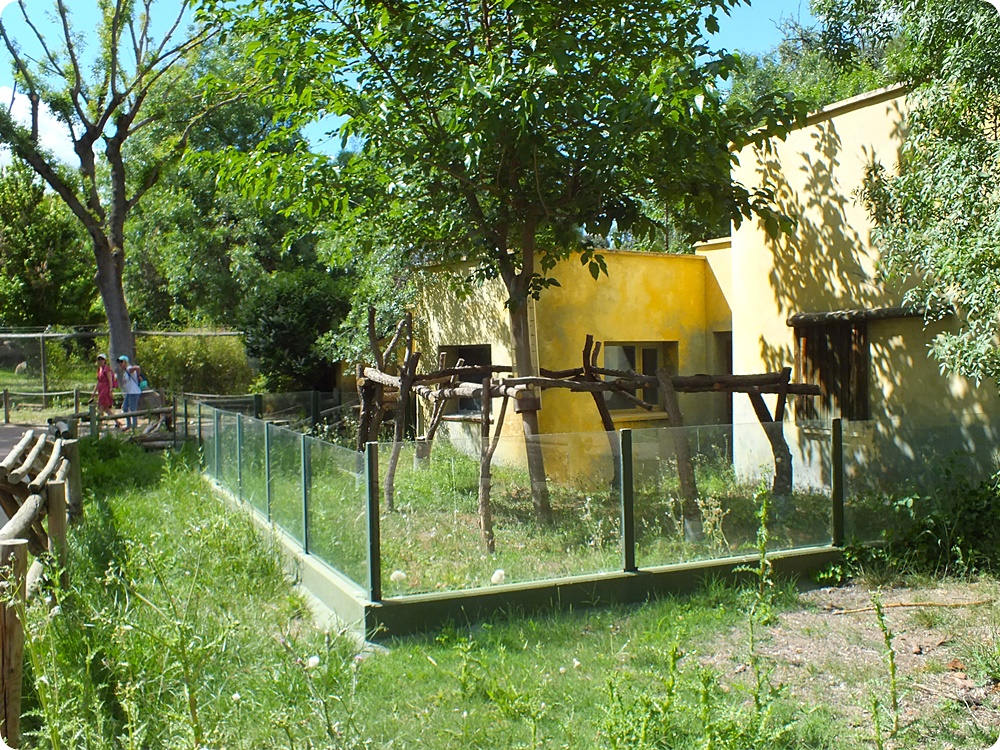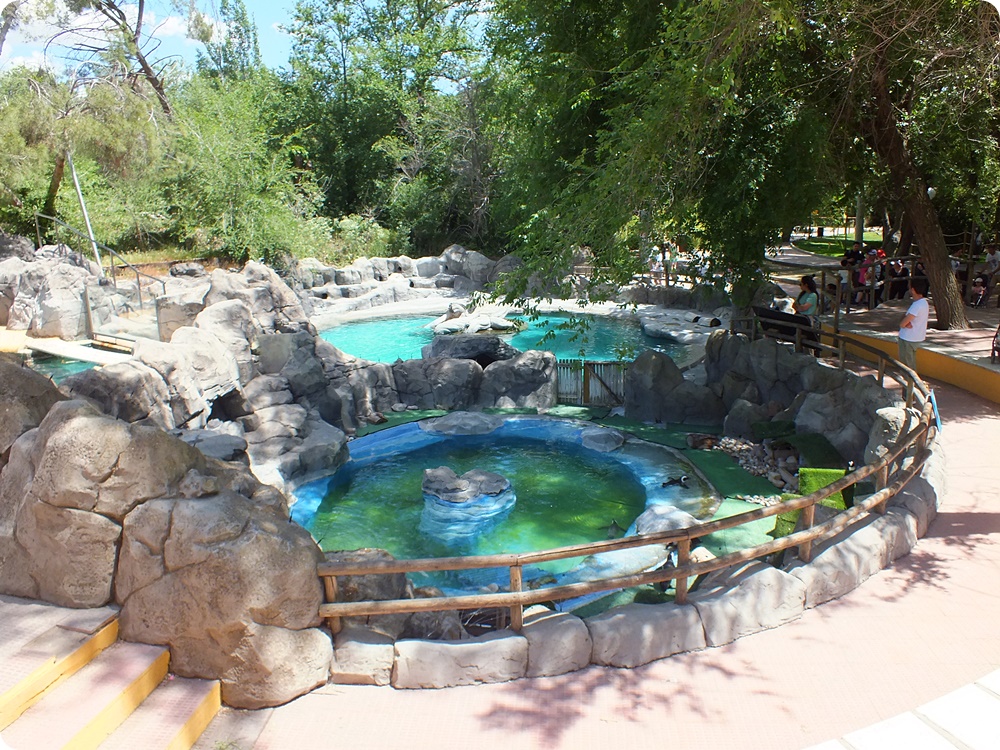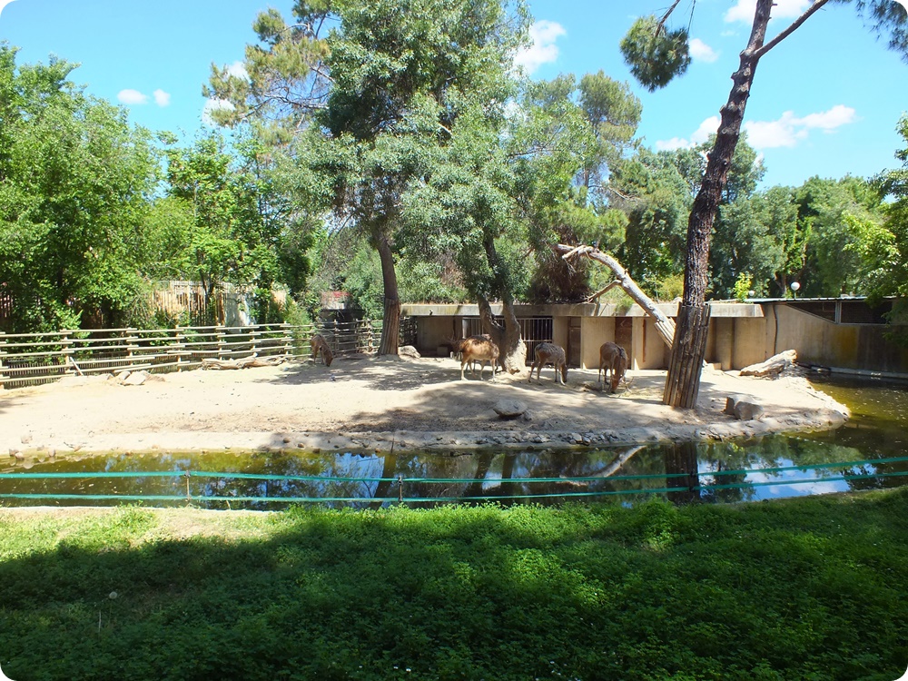 A síkvidéki nyugati gorillák (Gorilla gorilla gorilla) kifutója az egyik legfurcsább, amit eddig láttam. Keskeny, hosszan elnyúló, fűvel borított külsőjük kicsi alapterületű (konkrét adatot sajnos nem találtam a méretére vonatkozóan), ráadásul gyakorlatilag mindenféle mászóalkalmatosságot nélkülöz. Madridban 1976 óta foglalkoznak gorillákkal, az első kölyök 1988-ban született. Érdekesség, hogy a jelenlegi hattagú gorillacsapat egyik tagja az 1996-ban Budapesten született Gorka. Nem kell messzire menni egy másik régi ismerős kedvéért: az óriásvidrák (Pteronura brasiliensis) tágasnak mondható, de nem túl szemet gyönyörködtető kifutójának egyik lakója a korábban évekig Budapesten élő Cora.