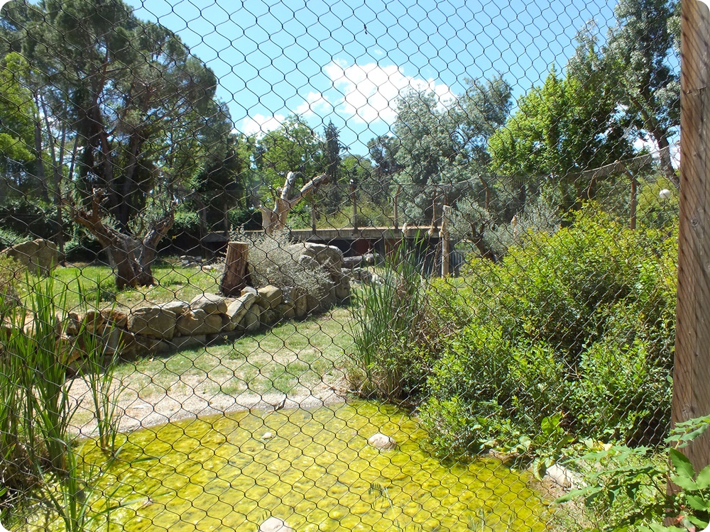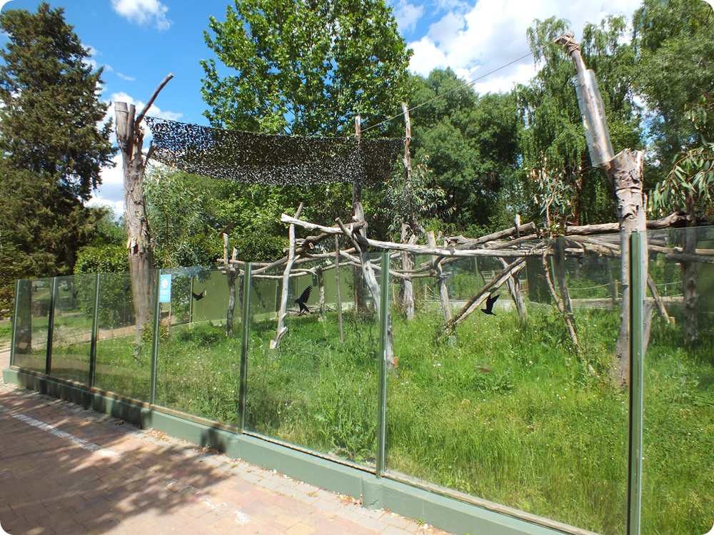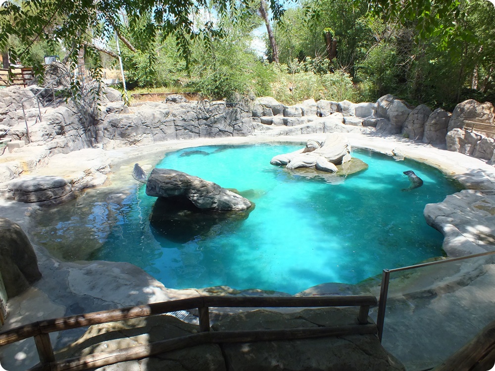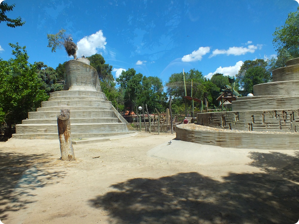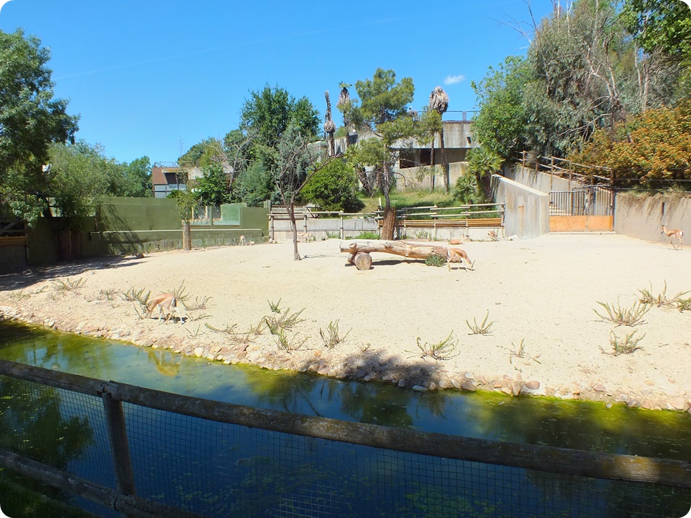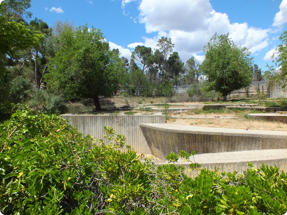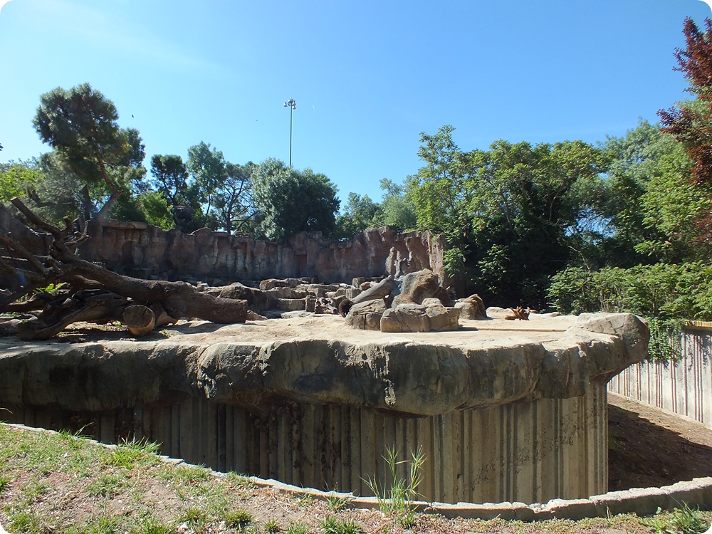 A síkvidéki nyugati gorillák (Gorilla gorilla gorilla) kifutója az egyik legfurcsább, amit eddig láttam. Keskeny, hosszan elnyúló, fűvel borított külsőjük kicsi alapterületű (konkrét adatot sajnos nem találtam a méretére vonatkozóan), ráadásul gyakorlatilag mindenféle mászóalkalmatosságot nélkülöz. Madridban 1976 óta foglalkoznak gorillákkal, az első kölyök 1988-ban született. Érdekesség, hogy a jelenlegi hattagú gorillacsapat egyik tagja az 1996-ban Budapesten született Gorka. Nem kell messzire menni egy másik régi ismerős kedvéért: az óriásvidrák (Pteronura brasiliensis) tágasnak mondható, de nem túl szemet gyönyörködtető kifutójának egyik lakója a korábban évekig Budapesten élő Cora.