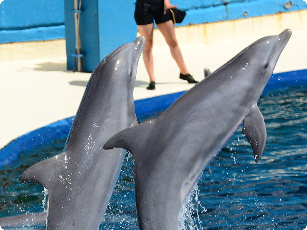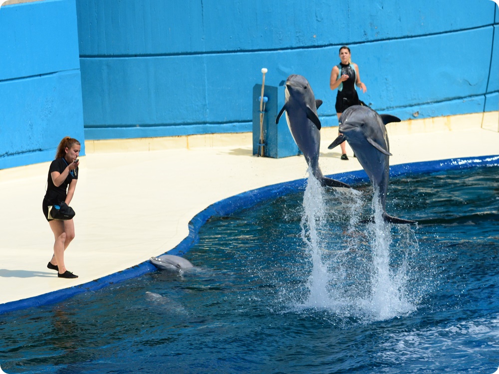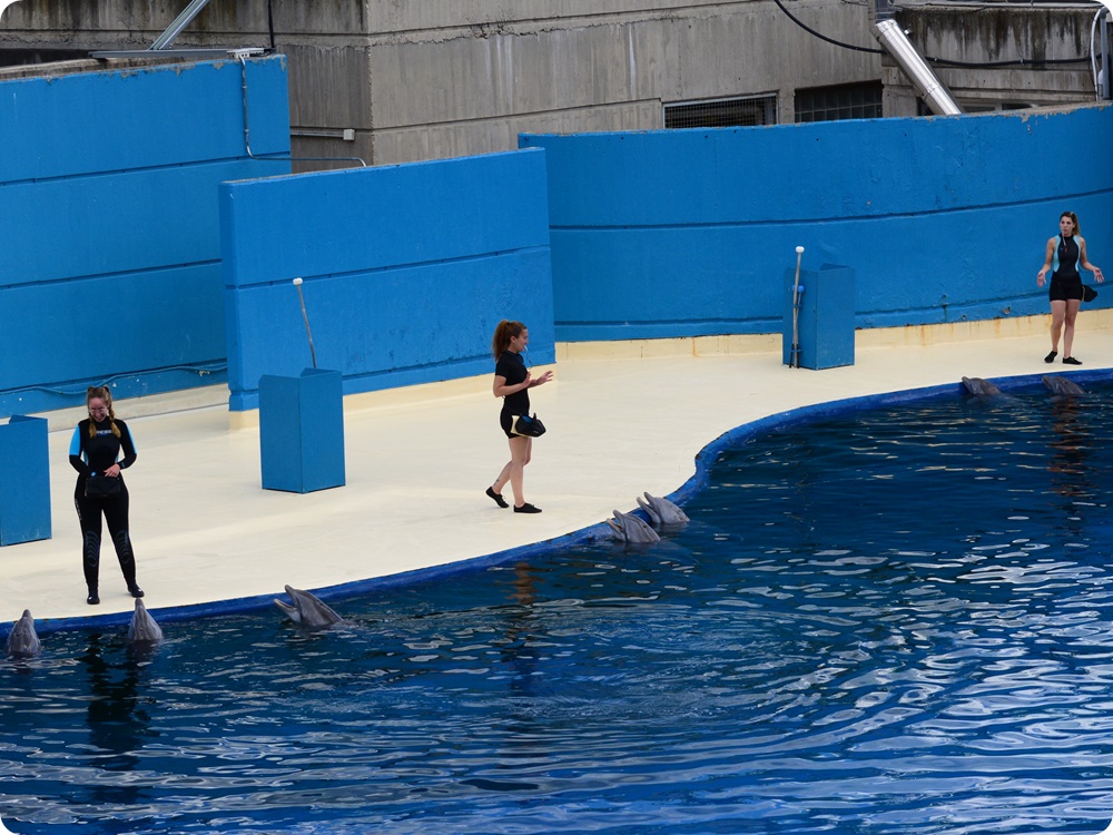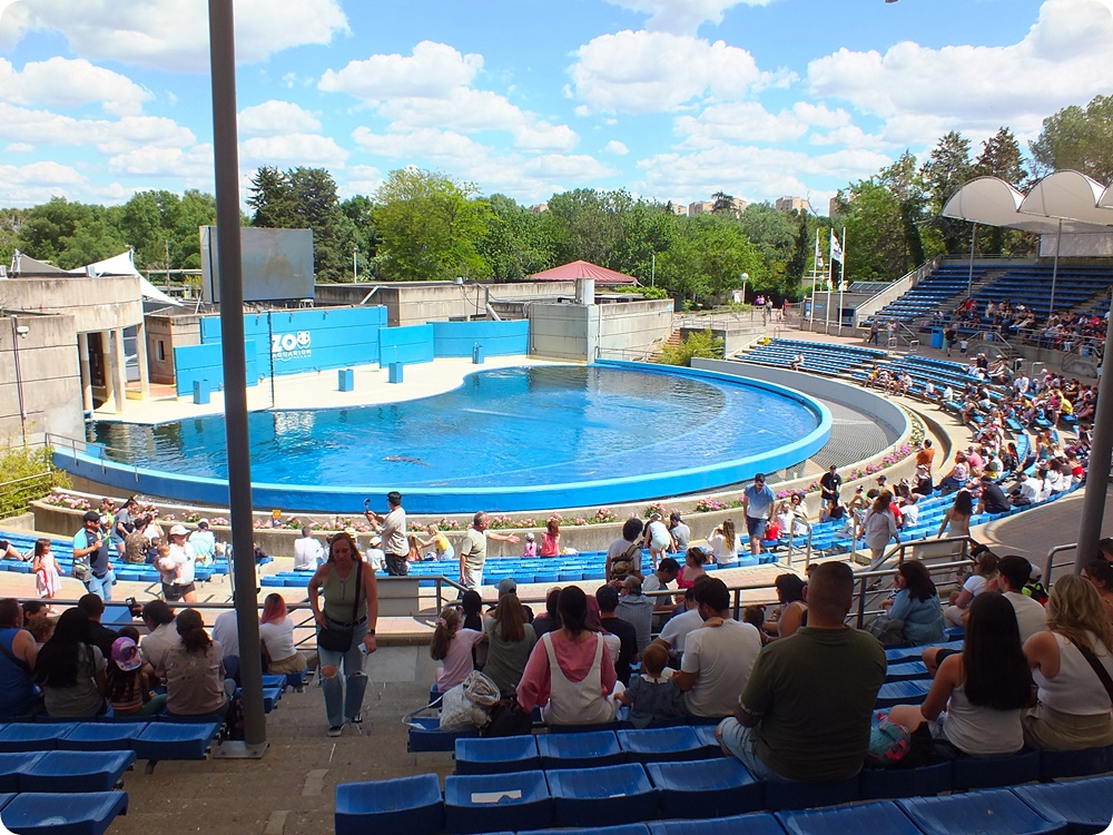 Az állatkert nevezetessége az 1987-ben épült delfinárium. A delfintartás szakmai berkekben is megosztó téma, én magam az állatkertek feltétlen híve vagyok, mégis mindig vegyes érzések fognak el a delfináriumok láttán. A látogatóknak láthatóan nincsenek hasonló aggályaik, a delfinek bemutatói töretlen népszerűségnek örvendenek. A madridi delfinmedence az egyik legkisebb az eddig általam látottak közül. Látogatásomkor 8 palackorrú delfin (Tursiops truncatus) szórakoztatta a lelátókon összegyűlt közönséget. Hasonló népszerűségnek örvend a madárbemutató is, melyen számos érdekes faj is szerepet kap, többek között az állatkertekben nem túl gyakori lármás rétisas (Haliaeetus vocifer) is.