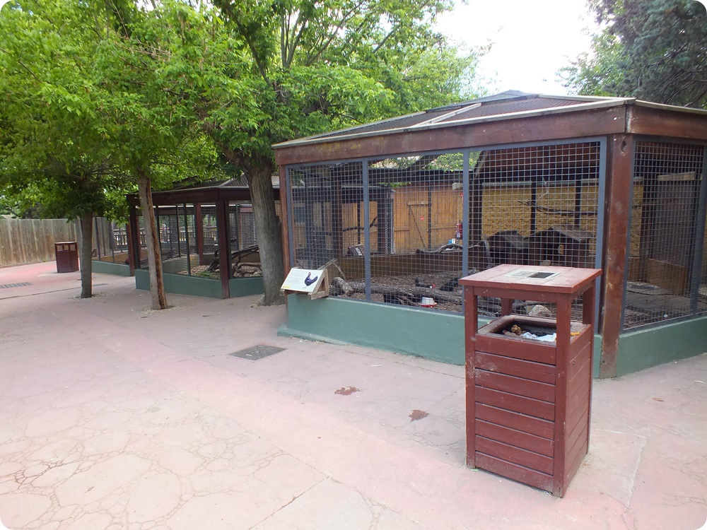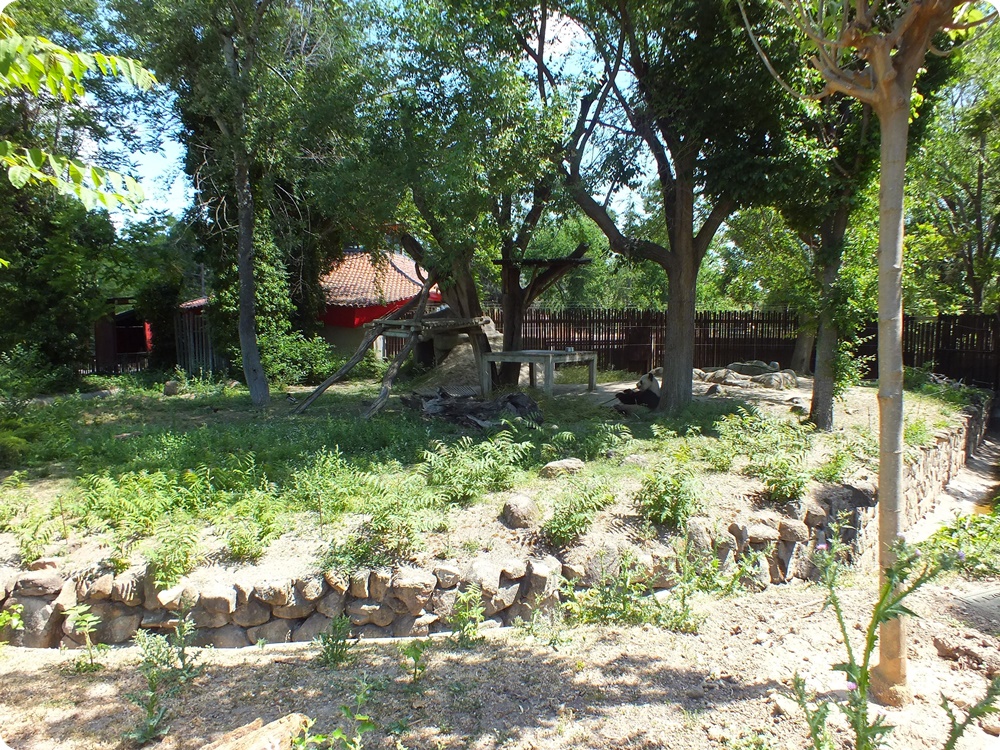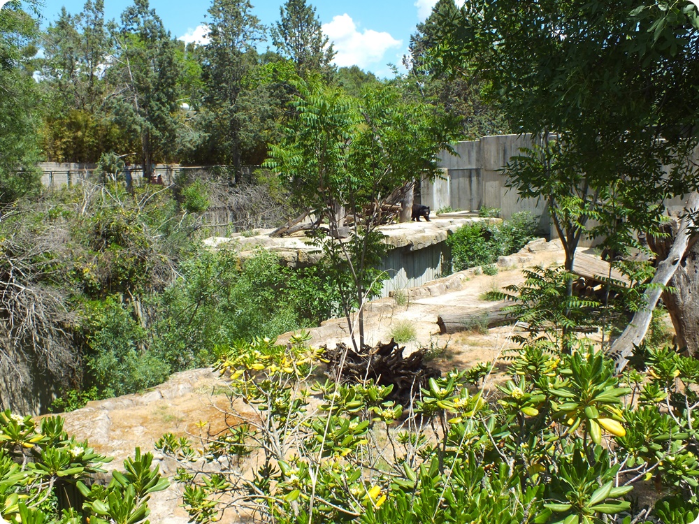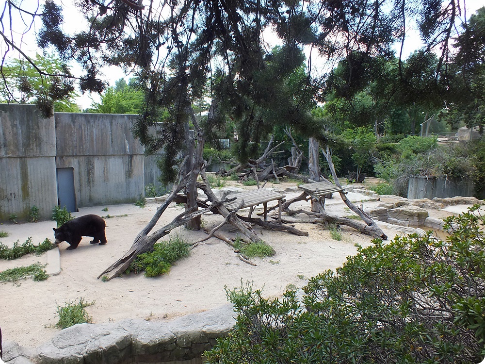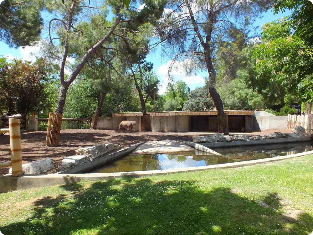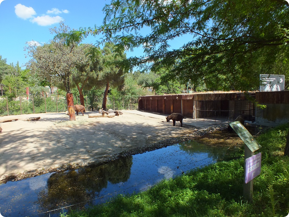 A múlt egyik mementójaként emelkedik ki a környezetéből az ázsiai medvék kifutórendszere. A férőhelyek kialakítása a 70-es éveket idézik: számos betonból épült, kis területű kifutó, a látogatóktól árokkal elválasztva. Ma két fajt tekinthetünk meg itt: a ritka maláj medvéket (Helarctos malayanus), illetve a régebben számos állatkertben tartott, manapság lassanként szintén állatkerti ritkasággá váló örvös medvét (Ursus thibetanus). Bár a férőhelyeket számos mászóalkalmatossággal rendezték be, ezek nem leplezhetik a beton sivárságát. Egyedül az örvös medve kifutója mutat némileg vonzóbb képet, a beültetett növények, fák, cserjék sokat javítanak a kifutó megjelenésén. A medvekifutók közelében találjuk a kert szépen kialakított, állatsimogatóval kombinált háziállatbemutatóját, melyben a spanyol fajtákat is megtekinthetünk. Furcsa módon itt kapott helyet a viszonylag ritkán látható, Európában jelenleg 17 helyen bemutatott fehérkarmú vércsék (Falco naumanni) röpdéje is. A medvekifutók szomszédságában terül el a Dél-Amerika kifutó, ahol közönséges tapírok (Tapirus terrestris), guanakók (Lama guanicoe) és nagy marák (Dolichotis patagonum) élnek, de mellettük sörényes hangyász (Myrmecophaga tridactyla) is látható a területen.