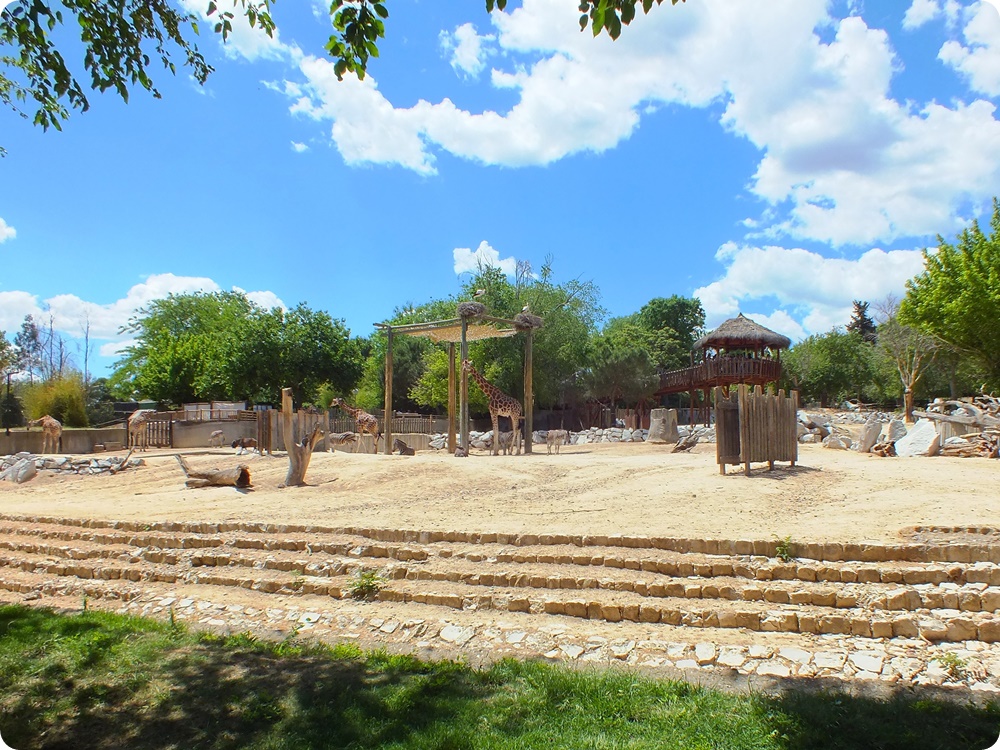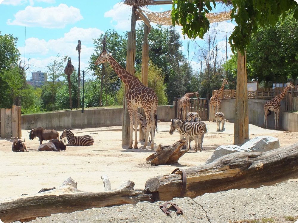 Az állatkert bejárattól legtávolabb eső részén nagyrészt Afrikában honos állatfajokat helyeztek el, de itt található a kétpúpú tevék (Camelus bactrianus) és jakok (Bos grunniens) férőhelye is. Egy nagy szavannakifutóban Rothschild-zsiráfok (Giraffa camelopardalis rothschildi) és Chapman-zebrák (Equus quagga chapmani) osztoznak az állatkerti ritkaságnak számító fehérfarkú gnúkkal (Connochaetes gnou). Egy kilátóból a zsiráfok szemmagasságából csodálhatjuk az itt élő állatokat, már ha hajlandóak vagyunk az itt összegyűlő embertömegbe küzdeni magunkat. A sörényes juhok (Ammotragus lervia) kifutója megint csak jó példa az állatkertre az 1970-es években jellemző „betonmániára”: el se akarom képzelni, hogy a lépcsőszerűen kanyargó betonteraszok mennyire melegedhetnek fel a nyári hőségben, akárcsak az innen nem messze található, hasonlóan „szemet gyönyörködtető” páviánkifutó esetében. A fajtábla nemes egyszerűséggel „páviánként” hivatkozik az itt lakó majmokra, Papio sp. tudományos névvel. Feltételezésem szerint hibrid állatokról lehet szó, galléros páviánra (Papio hamadryas) emlékeztető jegyekkel. A nílusi vízilovak (Hippopotamus amphibius) viszonylag nagy medencével és a legtöbb általam eddig látott vízilókifutóhoz képest nagy szárazföldi területtel rendelkező férőhelyet birtokolnak, bár viszonylag kevés árnyékos résszel, így forró napokon kevéssé tudják kihasználni a kifutó területét. A szélesszájú orrszarvúk (Ceratotherium simum simum) néhány dorkaszgazellával (Gazella dorcas osiris) osztoznak egy több irányból megtekinthető, részben vizesárokkal határolt kifutón. Az afrikai állatok bemutatóit a szitutungák (Tragelaphus spekii) kifutója zárja.
