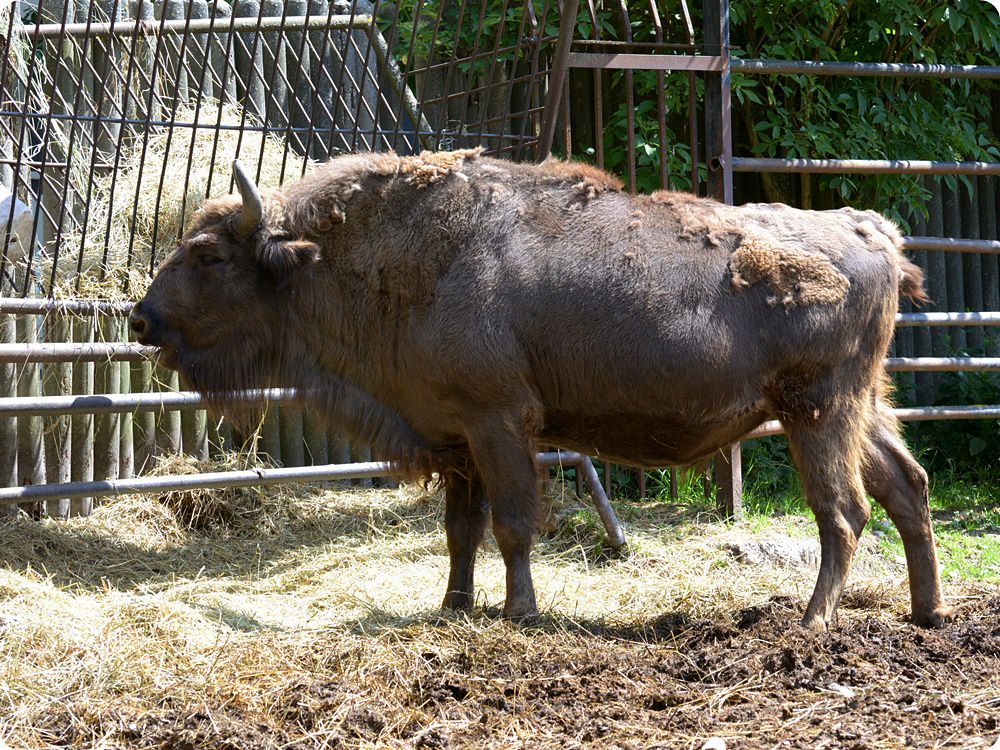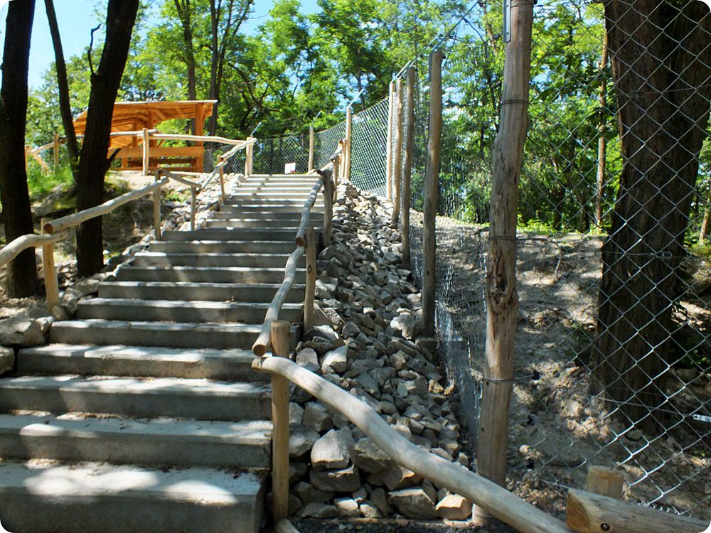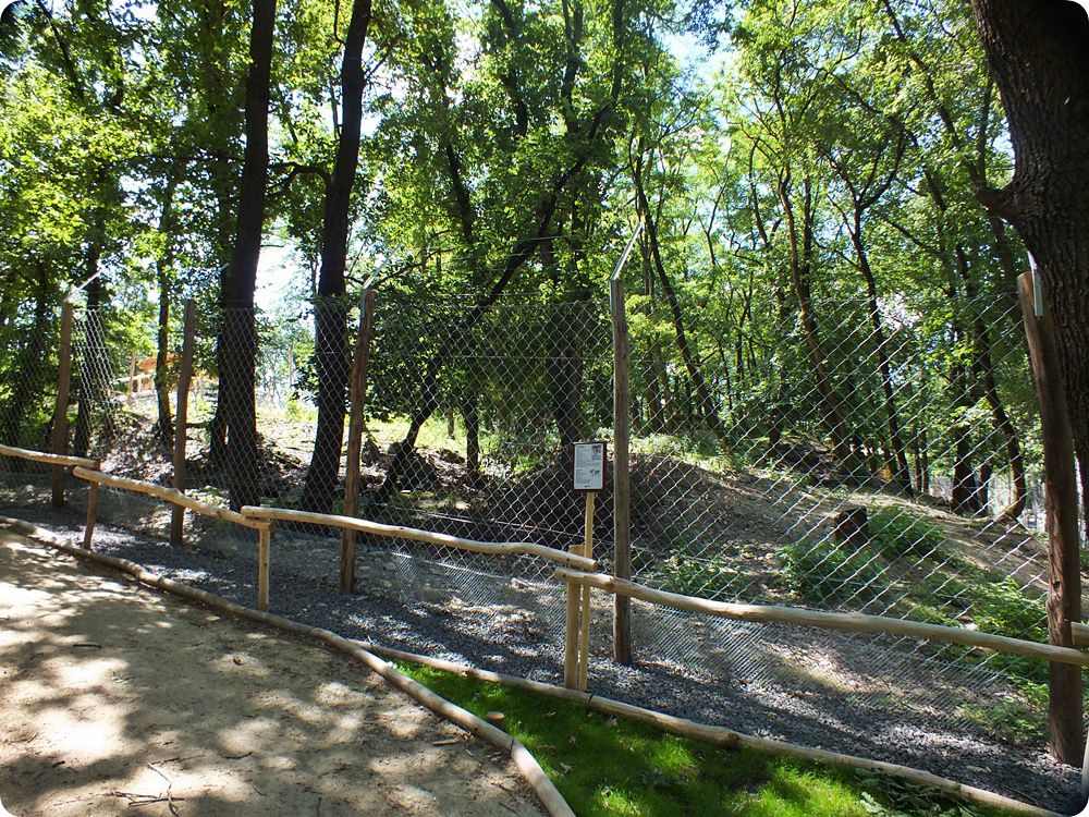 A hurokszerűen elágazó út mentén alakították ki a szürke farkasok (Canis lupus) modern, minden igényt kielégítő kifutóját. A korábban Dávid-szarvasok (Elaphurus davidianus) által birtokolt területet több évig tartó előkészület és a szükséges pénzösszeg összegyűjtését követően 2017-ben vehették birtokba új tulajdonosaik. A nagy, dróthálóval határolt erdőrész szükség esetén több kisebb részre osztható. A népes falkát egy, a kifutó kerítése fölé magasodó kilátóból is megfigyelhetjük. Mellettük terül el az európai bölények (Bison bonasus) erdővel borított, dombos birodalma. Sajnos a kifutóra elég rossz a rálátás, a terület egy részét gyakorlatilag nem is lehet látni – ez persze a bölényeket kevésbé zavarja. A hurokszerűen visszakanyarodó ösvény túloldalán egykor mocsári szarvasokat (Rucervus duvaucelii) láthattunk, sajnos ez a faj is kikerült a kert gyűjteményéből, helyükre gímszarvasok (Cervus elaphus) kerültek.