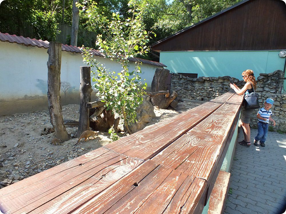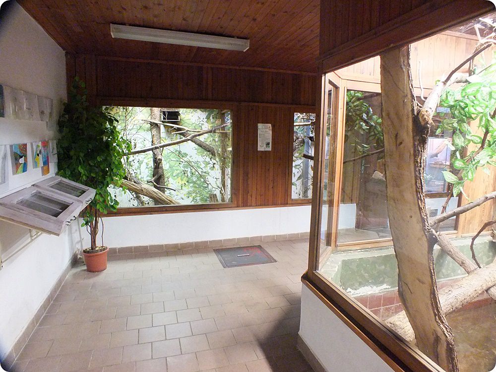 A bejárattól balra, egy emelkedőn felkapaszkodva találjuk az első bemutatót: a népes, e sorok írásakor 13 példányt számláló szurikátacsapat (Suricata suricatta) tágas kifutóját. Az állatokat derékmagasságú fal választja el a látogatóktól. A kifutótól balra találjuk a Terrárium felújított épületét. Itt különféle gekkófajok, teknősök, kígyók, illetve tompaorrú krokodilok (Osteolaemus tetraspis) mellett az egyik terráriumban törpe lajhármakit (Nycticebus pygmaeus) is láthatunk.