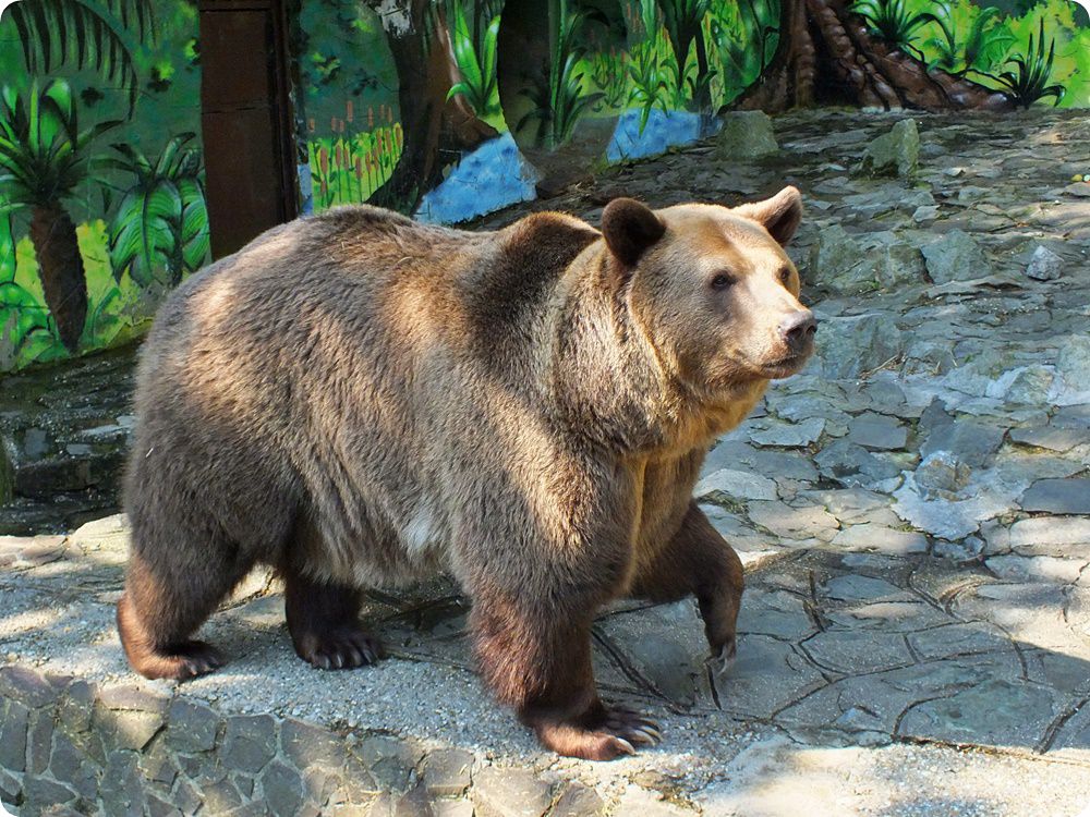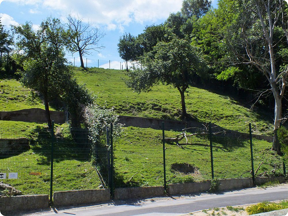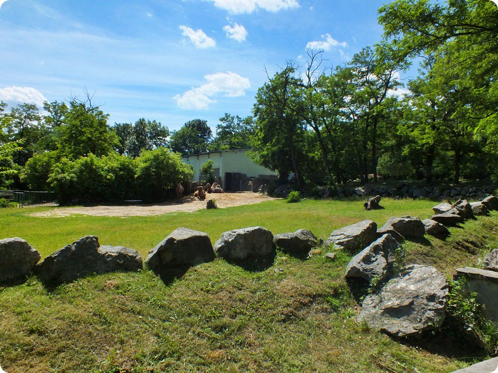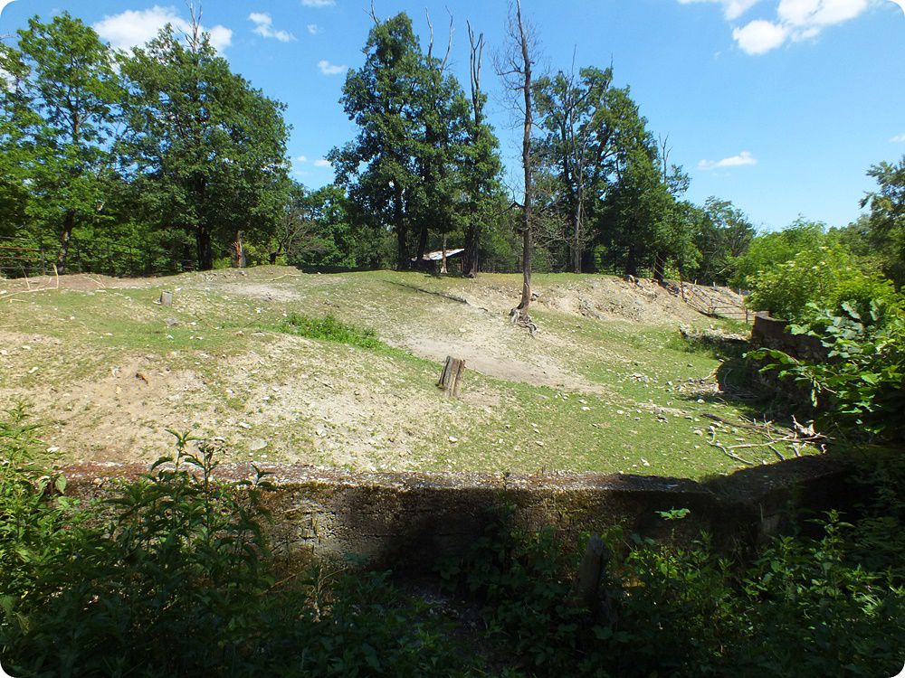 Továbbhaladva egy tágas, lankás, domboldalra épült füves-fás kifutóhoz érünk. Bár a kert egyik leglátványosabb férőhelyével van dolgunk, lakói kissé csalódást keltően kameruni törpekecskék (Capra hircus). Így még nagyobb a kontraszt a két szomszéd kifutóval: a két, árokkal határolt férőhely a kert jelenleg egyetlen barnamedvéjének (Ursus arctos) lakhelye. A betonból épült apró külső kifutók és a köztük elhelyezkedő, a látogatók elől elzárt belső között egy folyosó teremt összeköttetést, így a medve választhat a három terület között, aki legtöbbször a nyugodt, hűvös belsőt választja inkább, így a látogatók ritkán láthatják az állatot a kifutón. Az idejétmúlt, 20. század közepét fémjelző színvonalú férőhely helyett a közeljövőben nagy, futballpálya méretű, erdős kifutót szeretnének építeni, jelenleg adományokat gyűjtenek ennek finanszírozására.