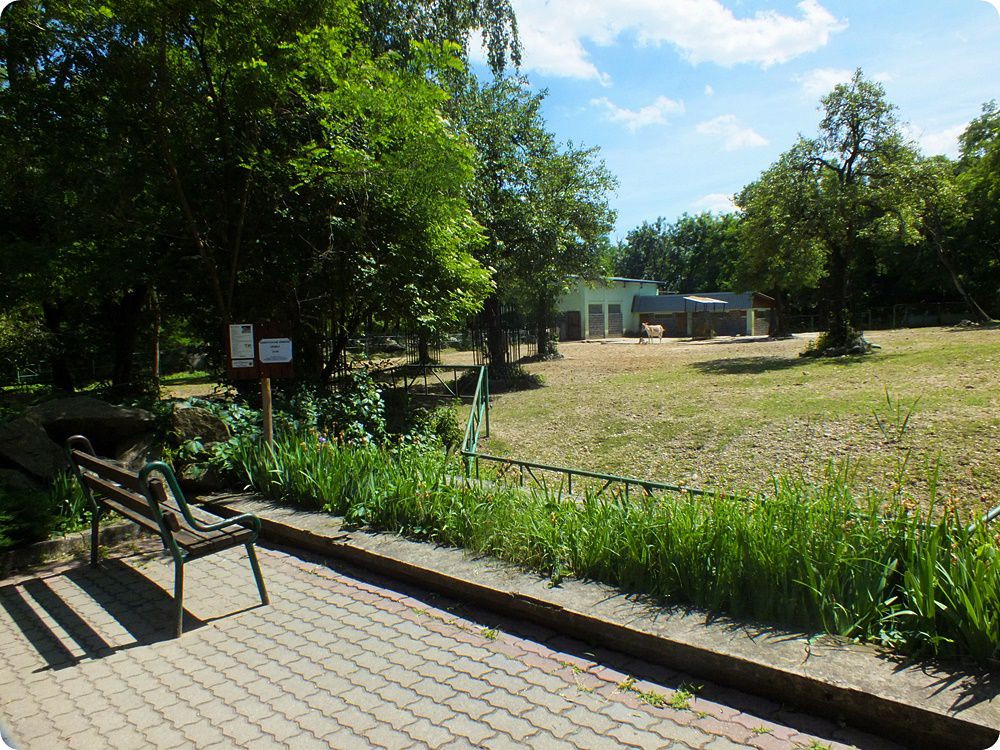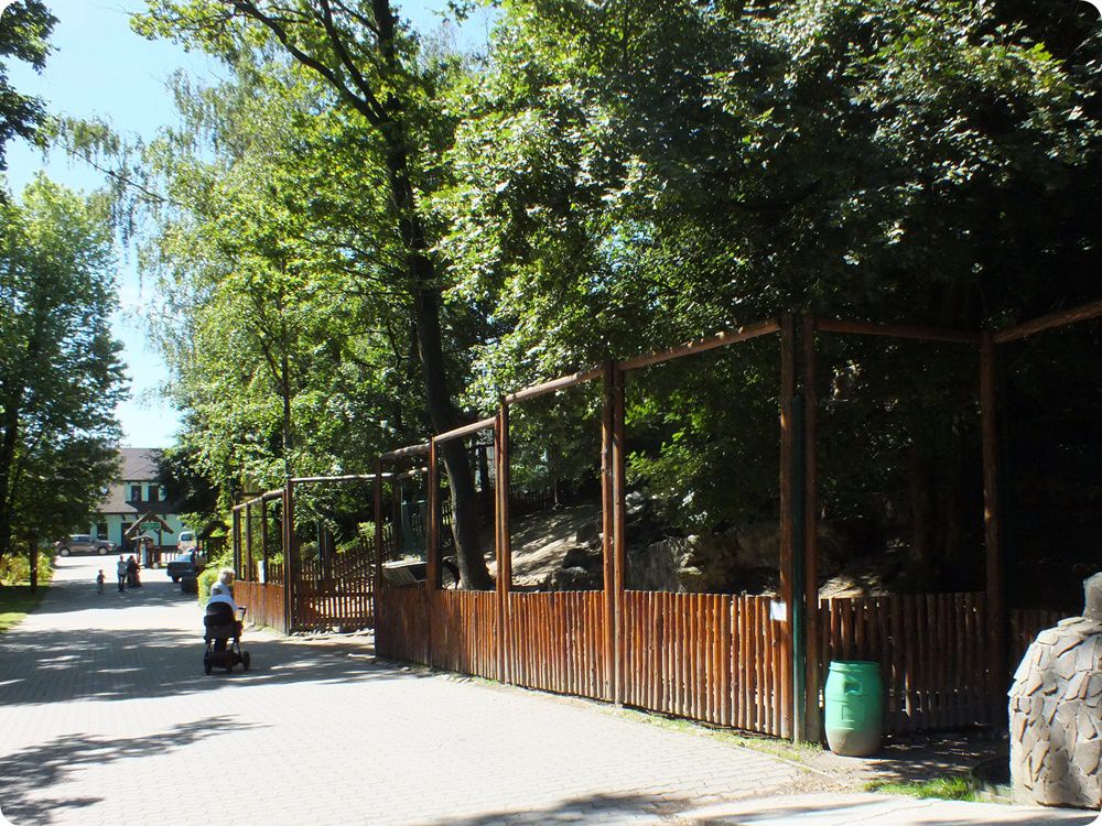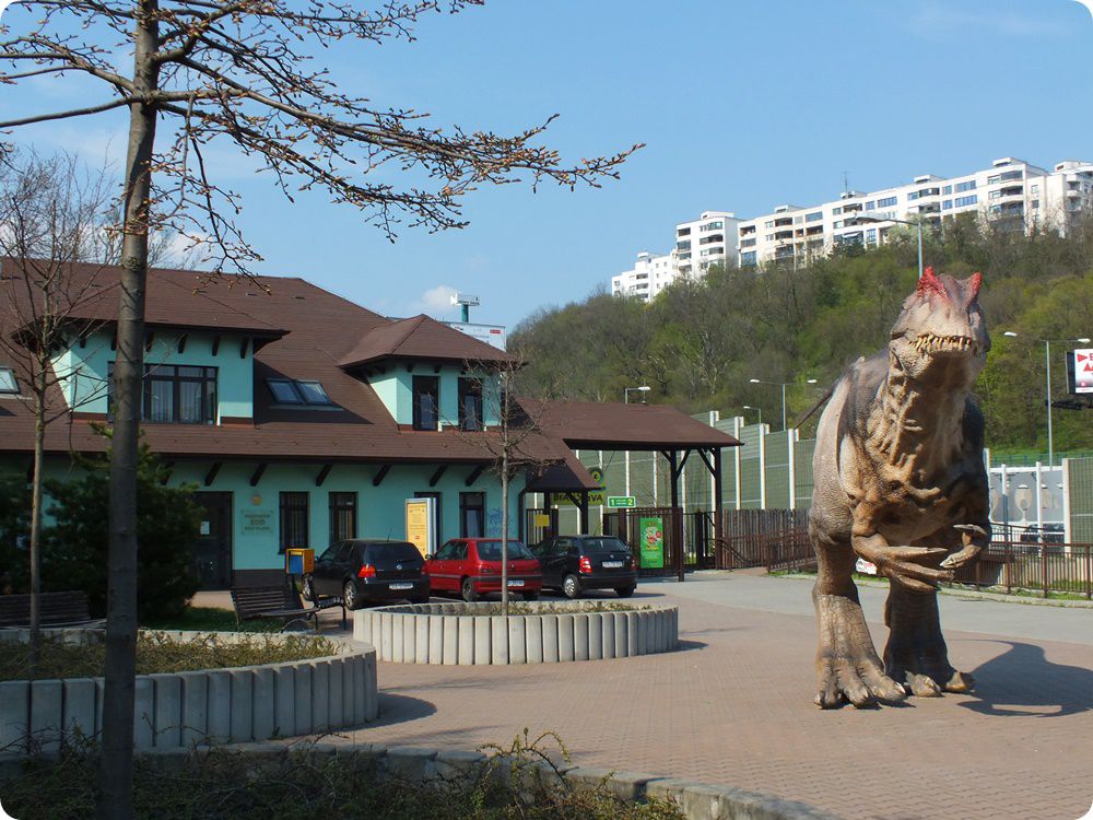 Utunkat a Dinopark felé vezető úton folytatjuk. A pozsonyi állatkert korábban híres volt hegyi patások tartásában és tenyésztésében elért eredményeiért. Egészen néhány évvel ezelőttig az állatkert büszkeségei közé tartoztak a pödröttszarvú kecskék (Capra falconeri) és a núbiai kőszáli kecskék (Capra nubiana), sőt ez utóbbiak törzskönyvét (ESB) egy ideig Pozsonyban vezették. Ma már egyik faj se látható az állatkertben, egykori, domboldalra épült kifutóikat vietnámi szikaszarvasok (Cervus nippon pseudaxis) csapata népesíti be. Ezután elhaladunk a vörösorrú ormányosmedvék (Nasua nasua) mellett. Itt sajátos megoldással éltek a tervezők: a koatik korábbi, apró ketreceit megtartották, de megteremtették a lehetőséget, hogy az állatok a nagyobb, mászási lehetőségekkel jobban ellátott kifutóba is kijárhassanak. A szomszédos röpdében skarlát íbiszek (Eudocimus ruber) és afrikai kanalasgémek (Platalea alba) láthatóak. Korábban a madarak téli férőhelye is megtekinthető volt, azonban a látogatók okozta stressz (különösen az üveg kopogtatása) több madár elhullásához vezetett, ezért az épületbe tekintő üvegablakot befedték, így a látogatók nem tudják megközelíteni. Kisebb röpdékben különböző papagájfajok: ausztrál királypapagájok (Alisterus scapularis), pirosszárnyú papagájok (Aprosmictus erythropterus) és Pennant-papagájok (Platycercus elegans), illetve rhododendronrigók (Turdus dissimilis) laknak. Sajnos a sötét ketrecek és a sűrű drótháló miatt alig láthatóak a madarak, fényképezésükre pedig még kevesebb esély van. Továbbhaladva elérjük a Dinopark a Jurassic Parkban látható kapura hajazó bejáratát. A hatalmas, erdős területen elhelyezett évről évre bővülő számú, élethű kialakítású modellek némelyike mozog is. Az érdeklődők kis 3D-s moziba is beülhetnek. Botanikai érdekesség a szintén itt megtekinthető, élő kövületként számon tartott sárkányfenyő (Wollemia nobilis) egy kisebb példánya.