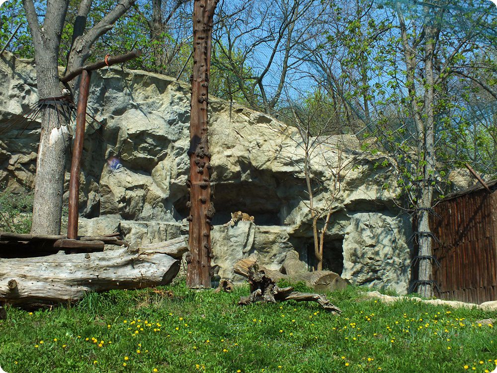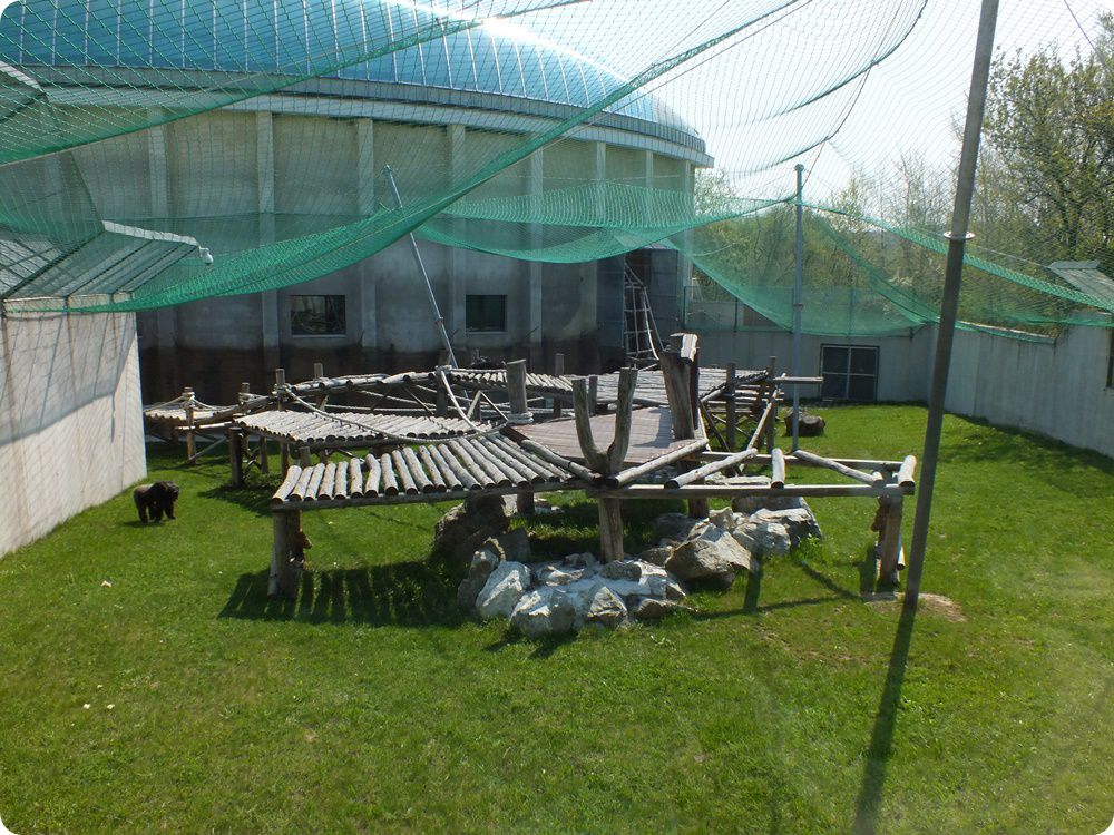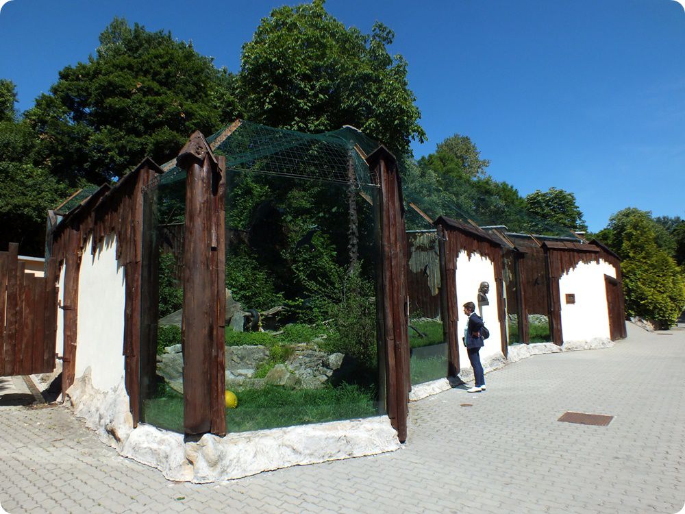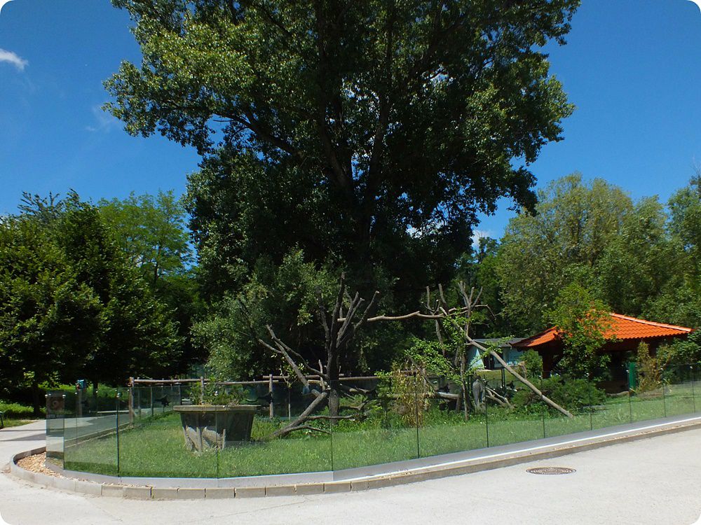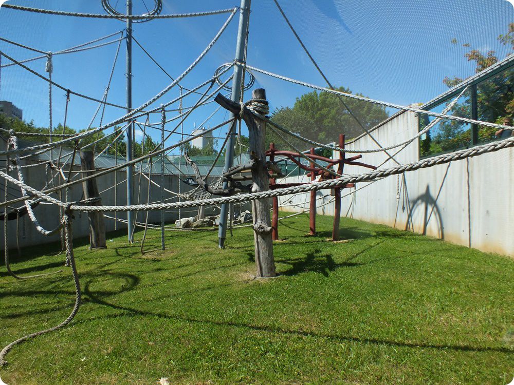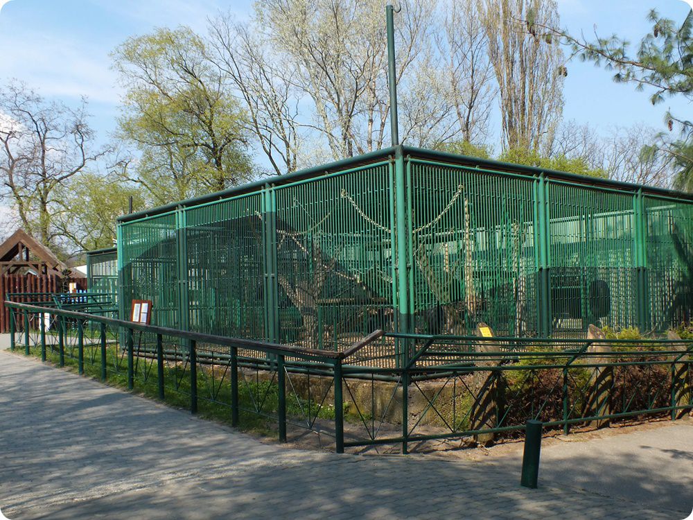 A Főemlősháztól nem messze vastag rácsokkal határolt ketreccsoportot találunk. Jelenleg a nagyobb férőhelyben berber makákók (Macaca sylvanus) élnek, míg a kisebb ketrec lakói aranyarcú gibbonok (Nomascus gabriellae). Utóbbiak az ideálisnak nem mondható körülmények ellenére rendszeresen szaporodnak. A rácsok vastagságából hamar rájövünk: a ketrec eredetileg csimpánzok tartására szolgált.