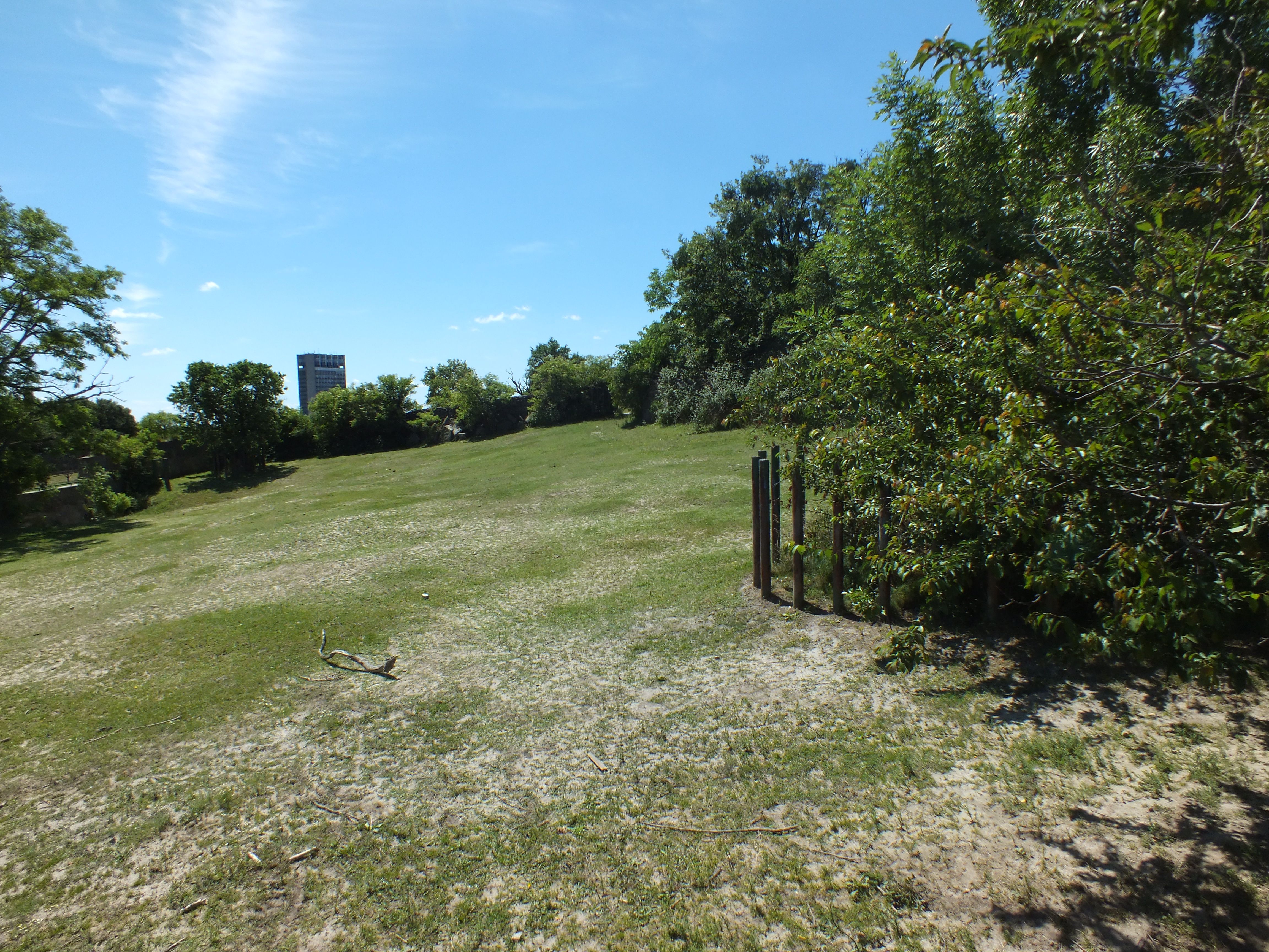 A dombra felvezető út során szembesülünk először a jelenleg kihasználatlan terület méretével: több száz méteren keresztül sétálunk úgy, hogy egyetlen kifutó se kerül az utunkba. Ez a tervek szerint nem marad sokáig így: a kert ide tervezi egy nagy Afrika-szavanna bemutató megépítését, itt kapnak majd új kifutót a kert zsiráfjai is. Az állatkert magasan fekvő területeihez egy látványos, a főbejáratnál mutatósabb, állatszobrokkal díszített kapun keresztül lépünk be. A déli szélesszájú orrszarvúk (Ceratotherium simum simum) kifutója véleményem szerint az állatkert egyik legjobbja: a tágas, növényekkel gazdagon díszített terület szükség esetén három részre választható, melyek egyenként is elérik egy átlagos orrszarvúkifutó méretét. A több helyen elhelyezett betekintőknél betonfal vagy sekély szárazárok felett áttekintve csodálhatjuk meg a két vastagbőrűt. Az orrszarvúkkal szemben, dróthálóval körülkerített egyszerű kifutóban lámákat (Lama glama), alpakákat (Vicugna pacos) és nandukat (Rhea americana) tartanak. Itt alakították ki az emuk (Dromaius novaehollandiae) és a vörös óriáskenguruk (Osphranter rufus) kunyhószerű faépítményből megtekinthető férőhelyét. Utóbbiból jelen pillanatban csak két példányt tartanak: a korábbi nagyobb csapat rejtélyes betegségnek esett áldozatul – feltételezhetően a közelben folyó építkezés okozta stressz végzett velük.