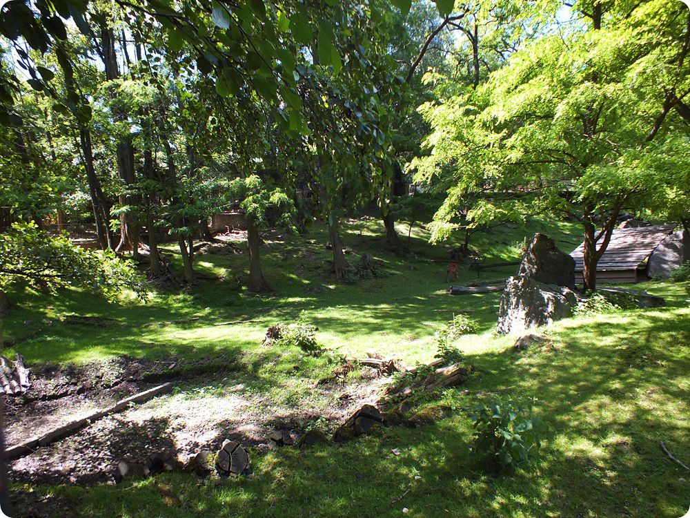 A kert ezen területén fekvő többi kifutót láthatóan megviselte az idő, igencsak megértek a felújításra. Az indokolatlanul vastag, rozsdás dróthálóval körülhatárolt területeken lapátfülű kutyák (Otocyon megalotis), Reeves-muntyákszarvasok (Muntiacus reevesi) és dámszarvasok (Dama dama) élnek. Itt találjuk a farkasok (Canis lupus) viszonylag nagy területű, de a rozsdás dróthálóval elcsúfított, négy részre osztott egykori kifutórendszerét is, melyet az új, modern farkaskifutó átadását követően két-két szomszédos terület összekötésével csíkos hiénák (Hyaena hyanea) kaptak meg. Néhány évvel ezelőttig az egyik rekesz lakója egy hiénakutya (Lycaon pictus) volt, időközben lemondtak e faj tartásáról. A hurokszerűen kanyarodó ösvény a struccok (Struthio camelus) és a Przsevalszkij-lovak (Equus caballus przewalskii) mellett vezet vissza az orrszarvúkifutóhoz. Korábban egy keskeny erdei ösvényt is választhattunk, ez ma már a látogatók számára nem járható, így kénytelenek vagyunk visszatérni a Főemlősházig vezető úthoz.