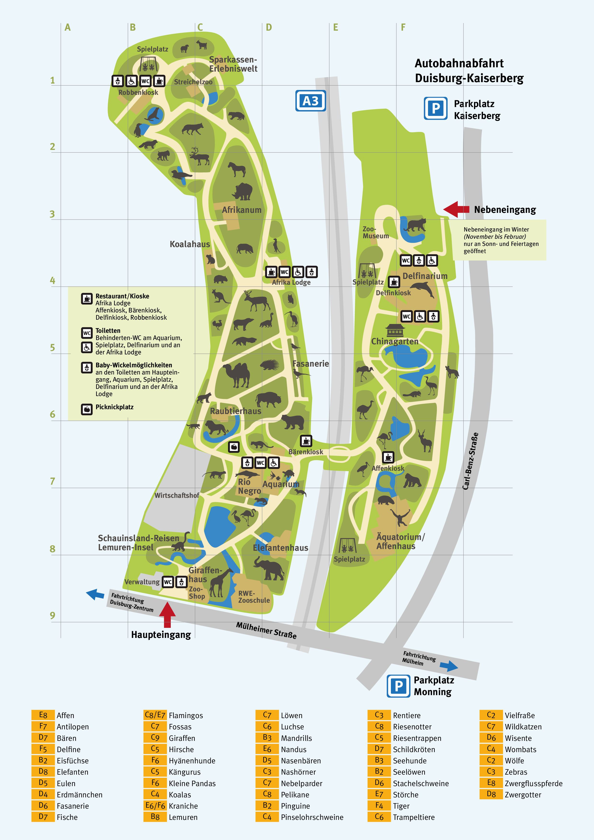 1994-ben költöztek Duisburgba az első koalák, melyek egy évvel később már szaporodtak is. A fejlődés folyamatos, napjainkban is sorra készülnek az új állattartóhelyek Duisburgban. Legutóbb, 2014-ben a hiúzok (Lynx lynx) és a vadmacskák (Felis silvestris) vehették birtokba felújított kifutóikat. Napjainkban mintegy 300 állatfaj 2500 egyedét gondozzák az állatkertben.