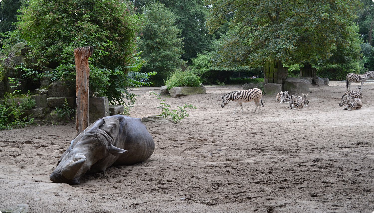 A zebrákkal közös férőhelyen lakik az állatkert szélesszájú orrszarvúbikája (Ceratotherium simum simum), mely jelenleg az egyetlen orrszarvú Duisburgban. Ott jártamkor még egy idős nőstény is lakója volt az állatkertnek, akivel sajnos nem sikerült összeszoktatni az újonnan érkezett hímet: a nőstény testét több csúnya, a bika támadásaitól származó seb borította, végül a két állatot felváltva engedték ki a kifutóra a zebrák közé.