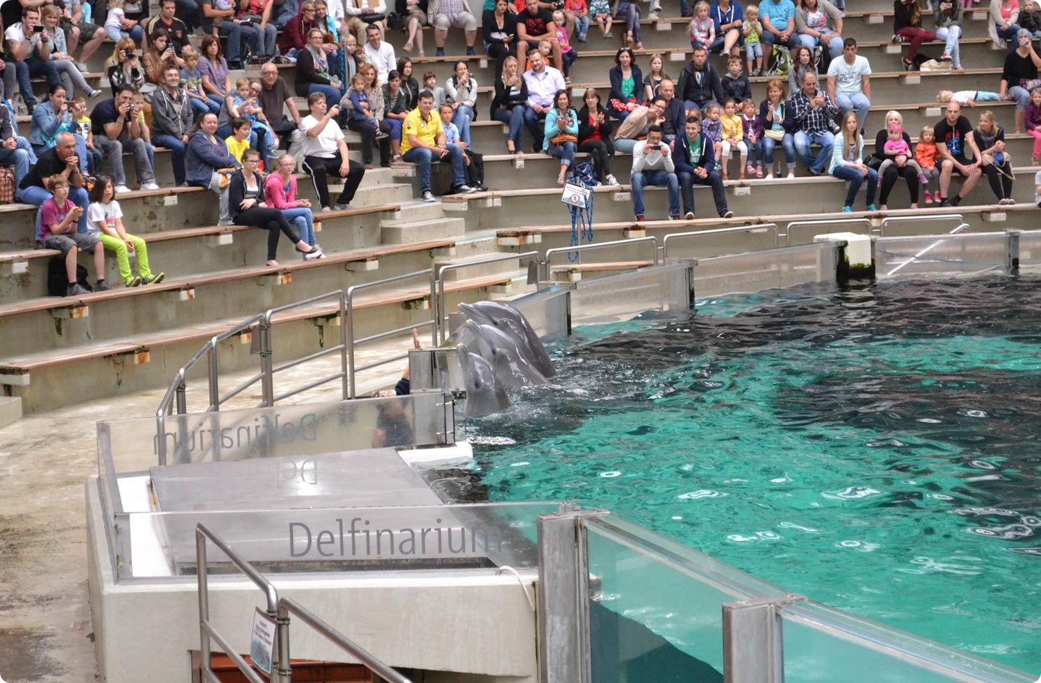 A delfin-show az egyik legnépszerűbb program az állatkert kínálatában.