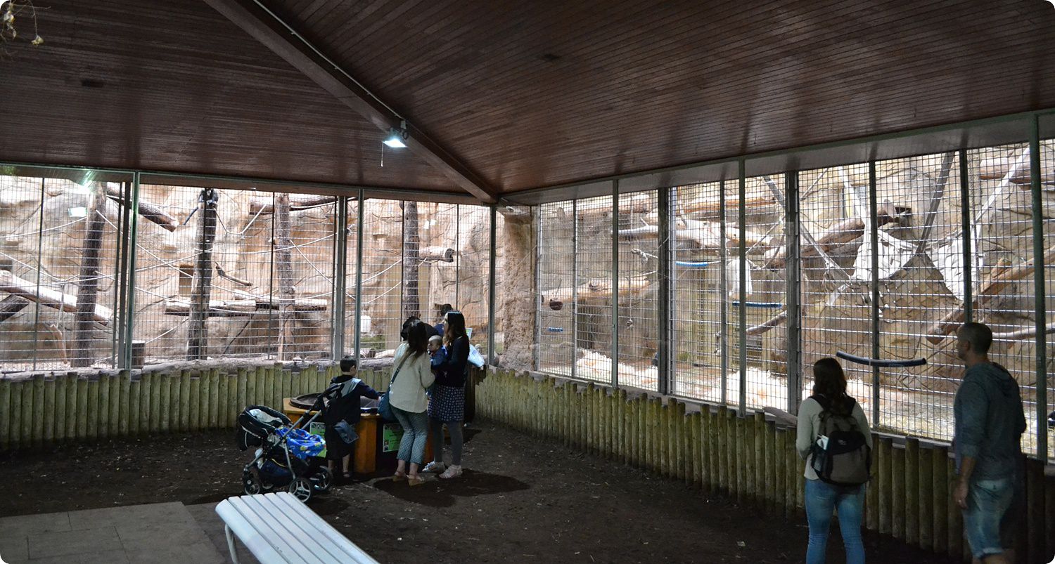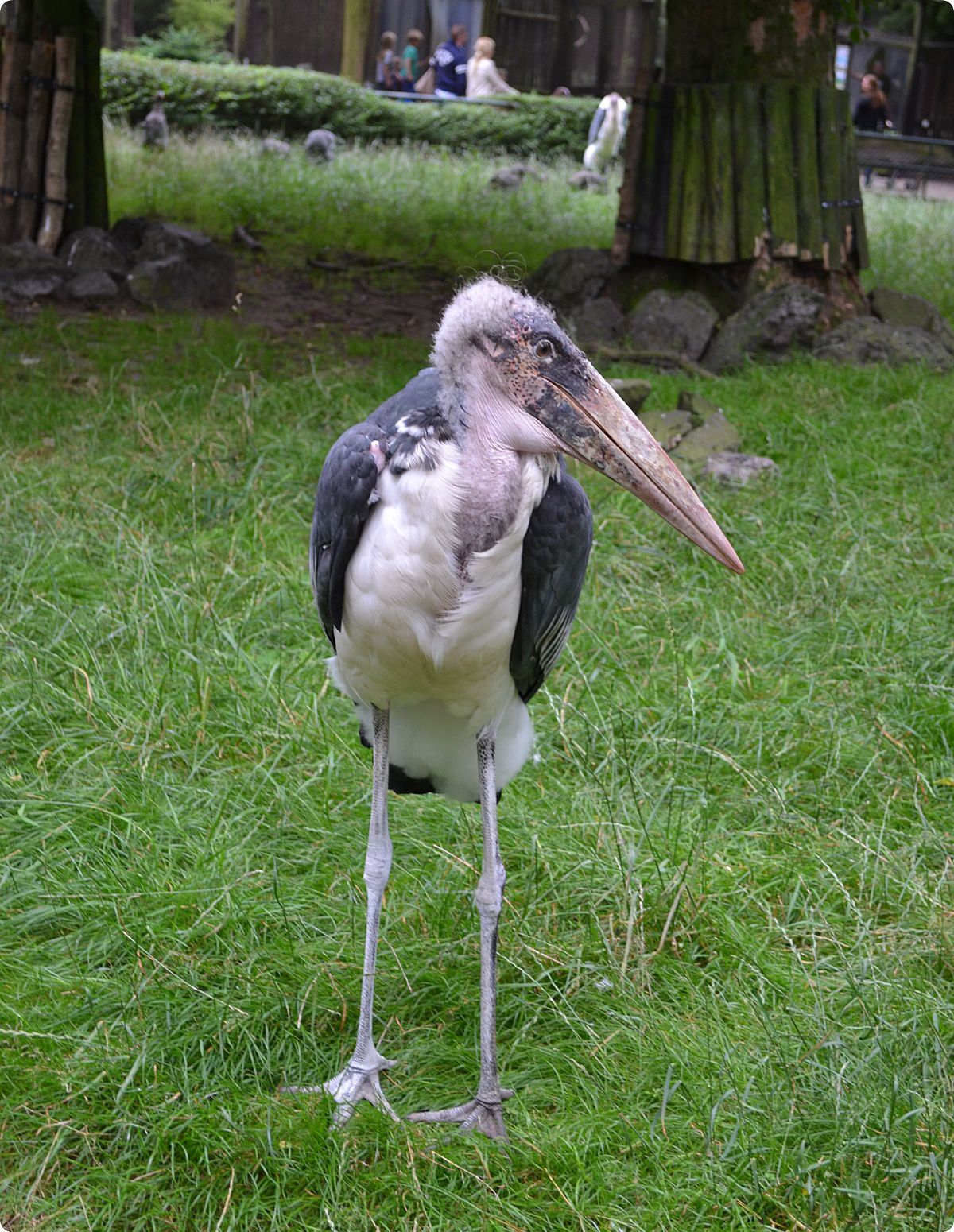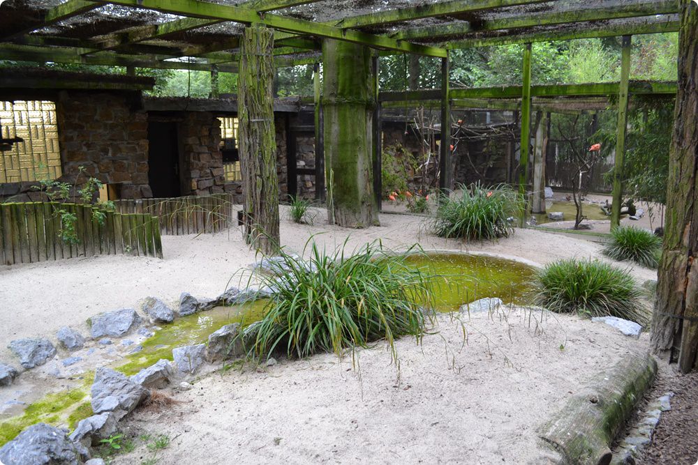 A képen látható kifutóban különös életközösség lakik: a szökés ellen csonkolt szárnyú marabuk (Leptoptilos crumeniferus) és fakó keselyűk (Gyps fulvus fulvus), gyöngytyúkok (Numida meleagris) és fehérfarkú sülök (Hystrix indica) lakják a kifutót. Az állatkert területén szabadon közlekedő pávák (Pavo cristatus) is előszeretettel megfordulnak itt.
