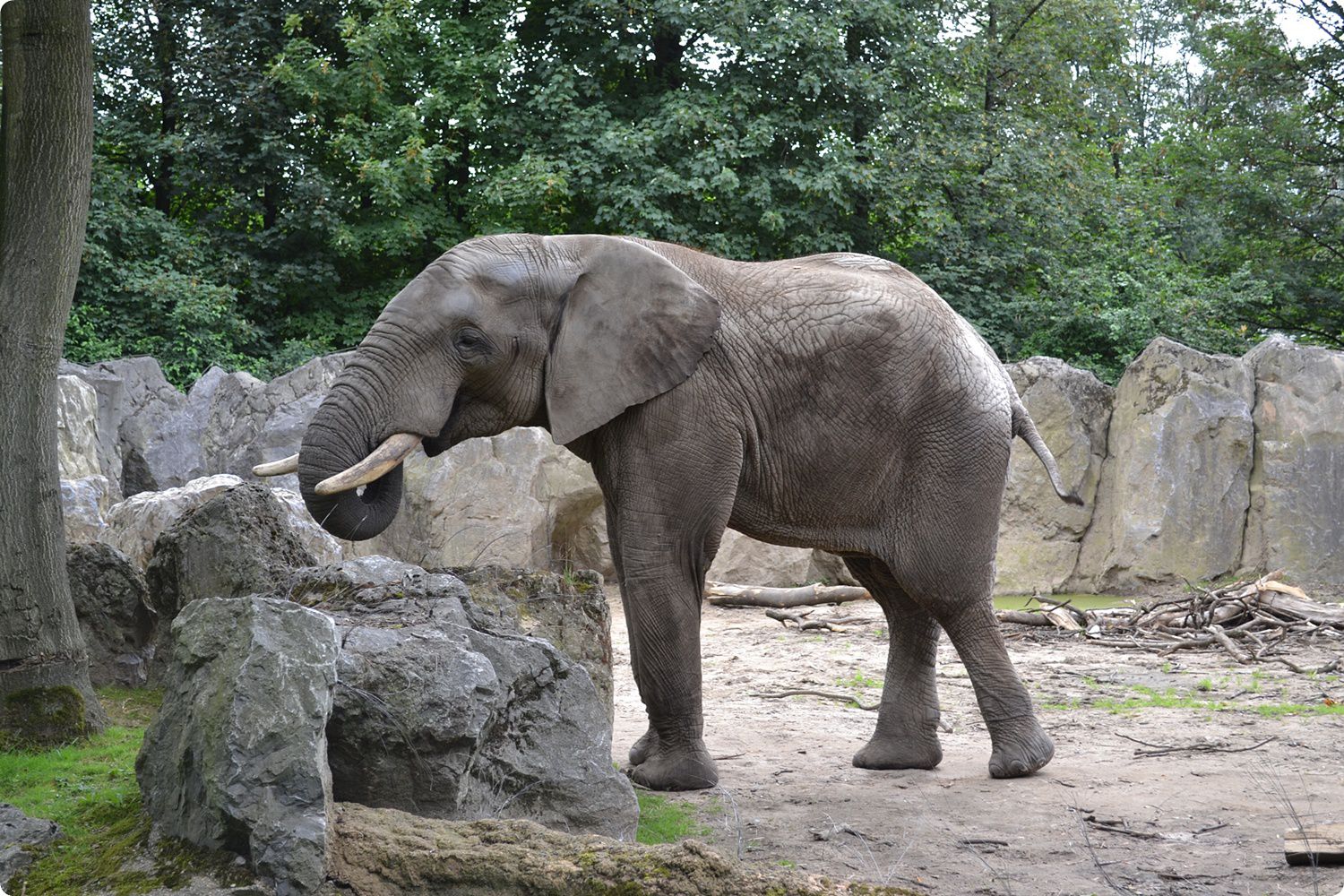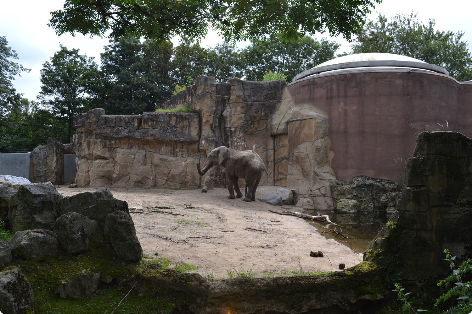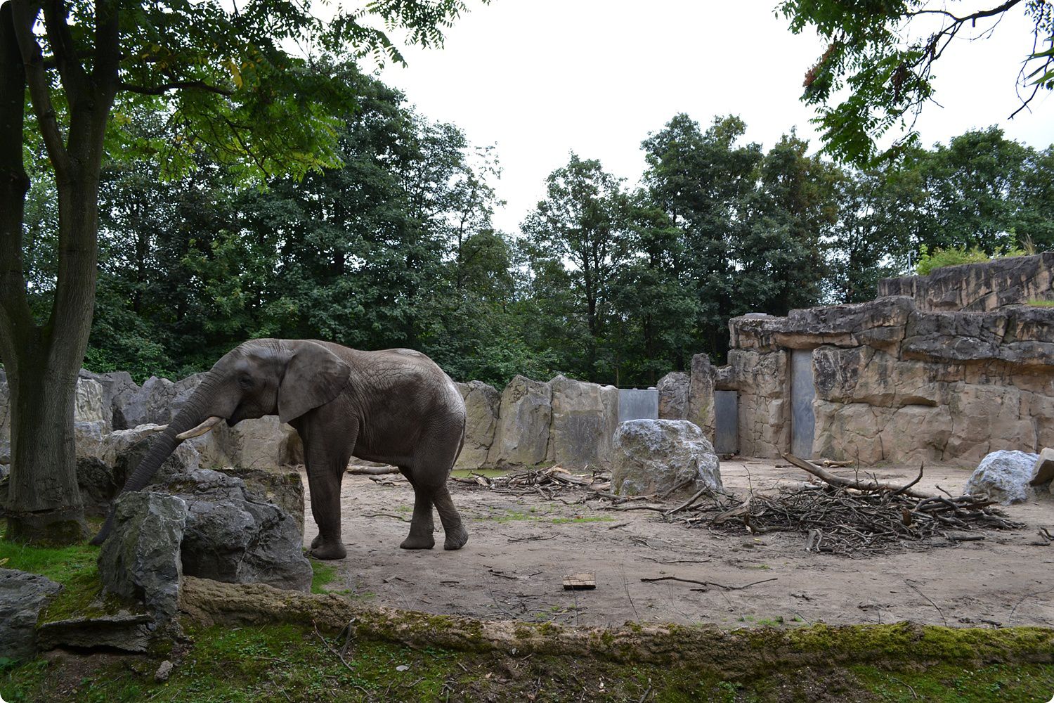 A felvételen a duisburgi elefántbika látható. Akárcsak az afrikai elefántot tartó európai állatkertek többségében, Duisburgban is alfajtiszta dél-afrikai szavannaelefántokat (Loxodonta africana africana) gondoznak, jelenleg egy bika és három tehén alkotja az állományt.