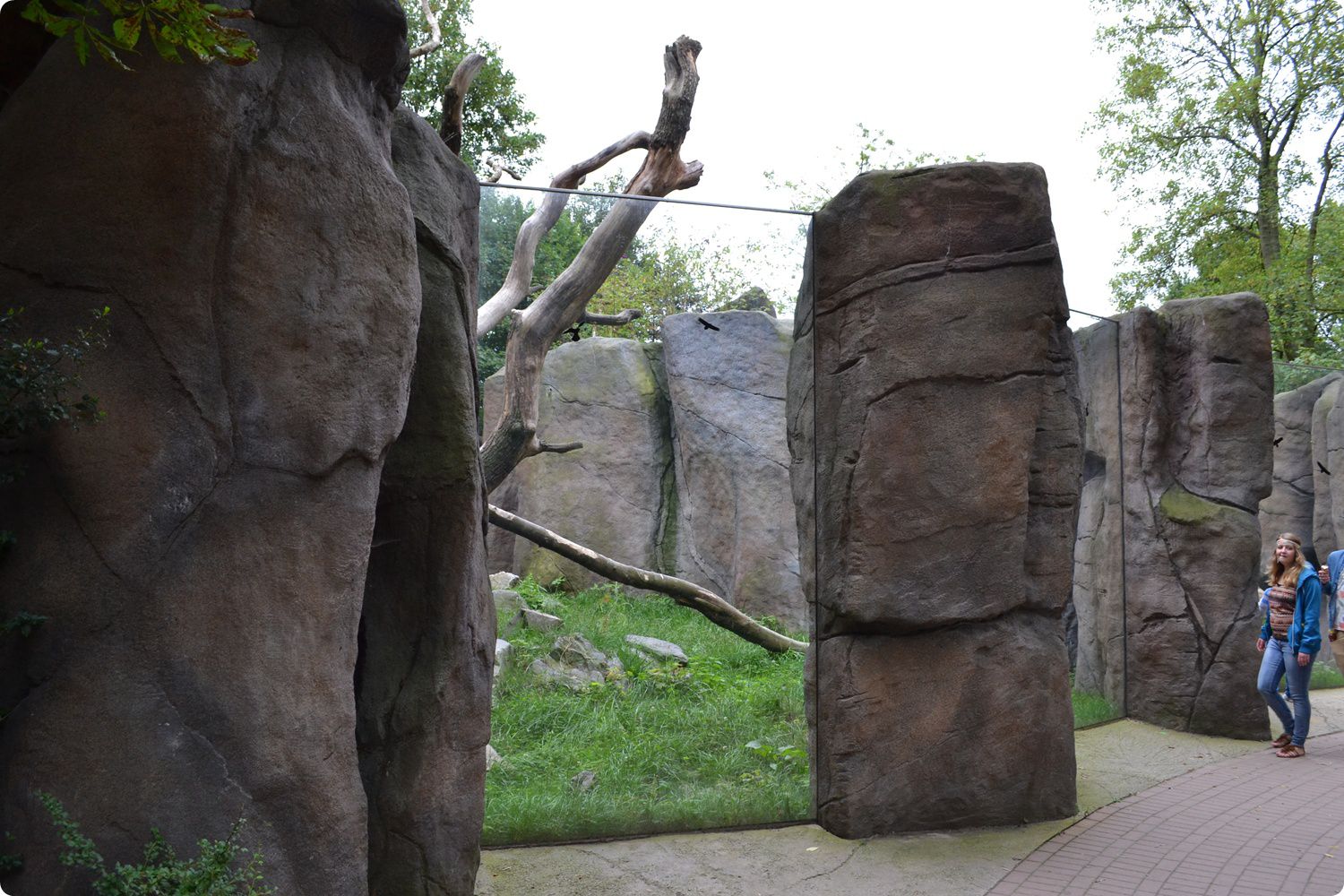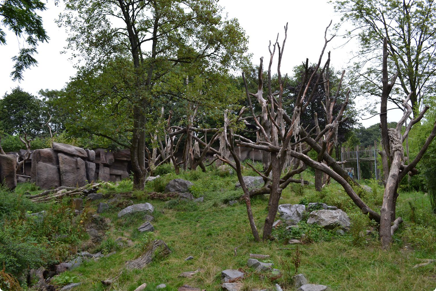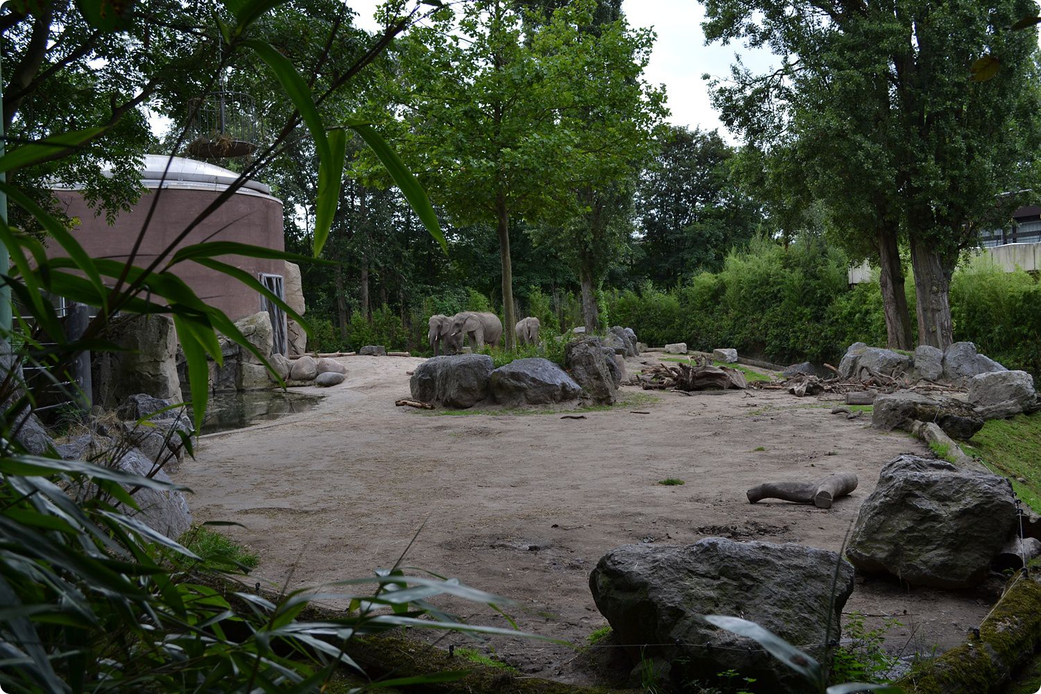 Az elefánttehenek külső kifutója: annak érdekében, hogy a kifutón lévő fákat megóvják az elefántok rongálásától, hatalmas kőtömbökkel vették azokat körbe.