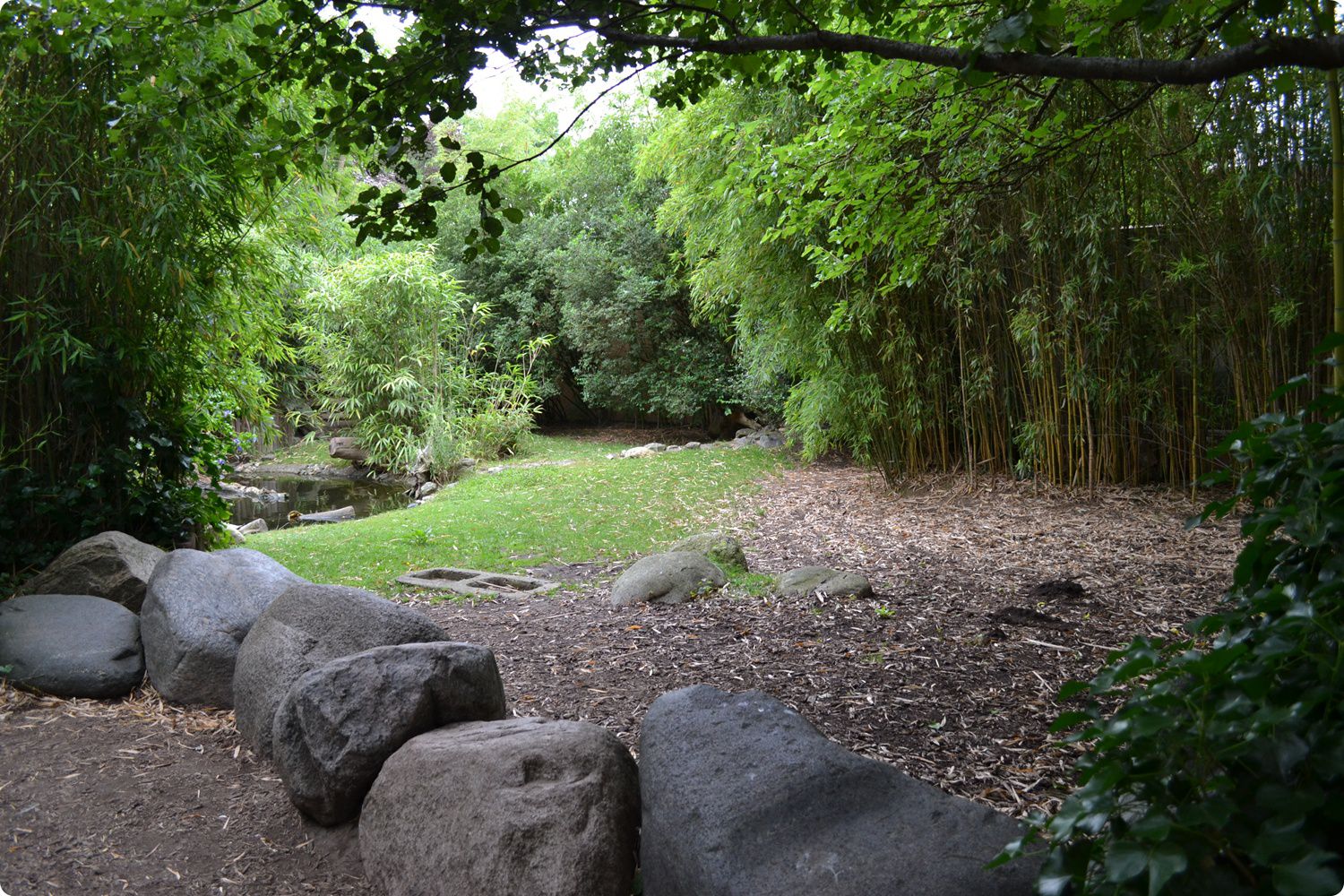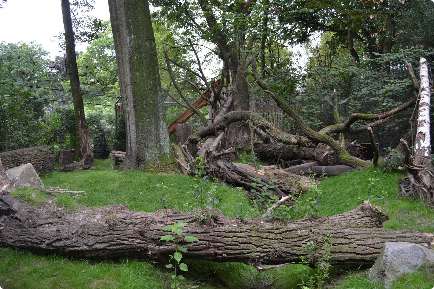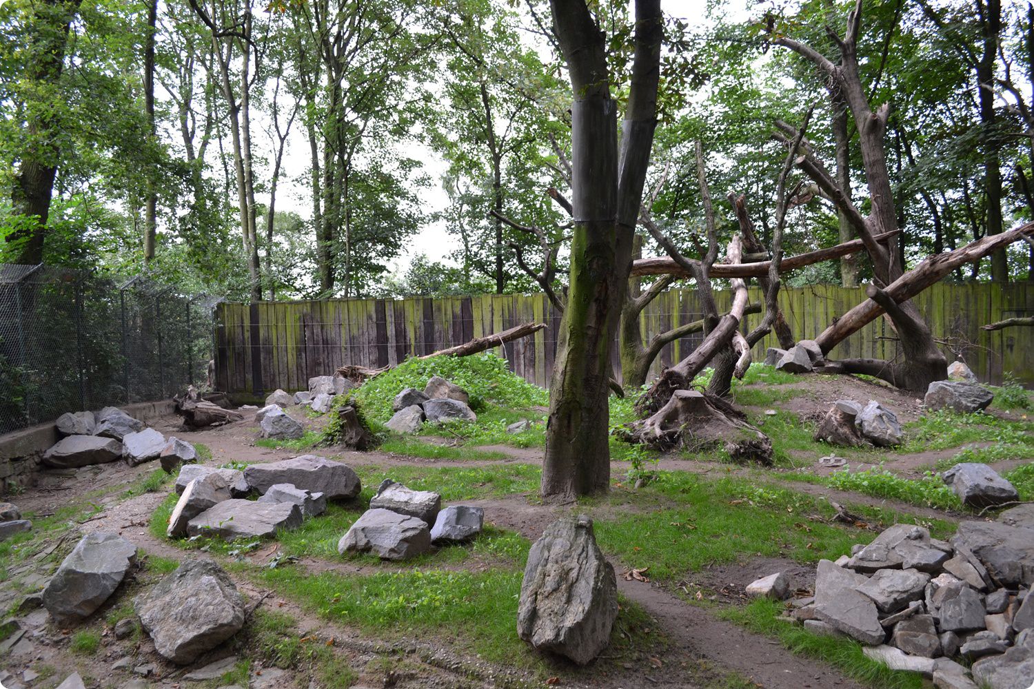 Az elefánttehenek külső kifutója: annak érdekében, hogy a kifutón lévő fákat megóvják az elefántok rongálásától, hatalmas kőtömbökkel vették azokat körbe.