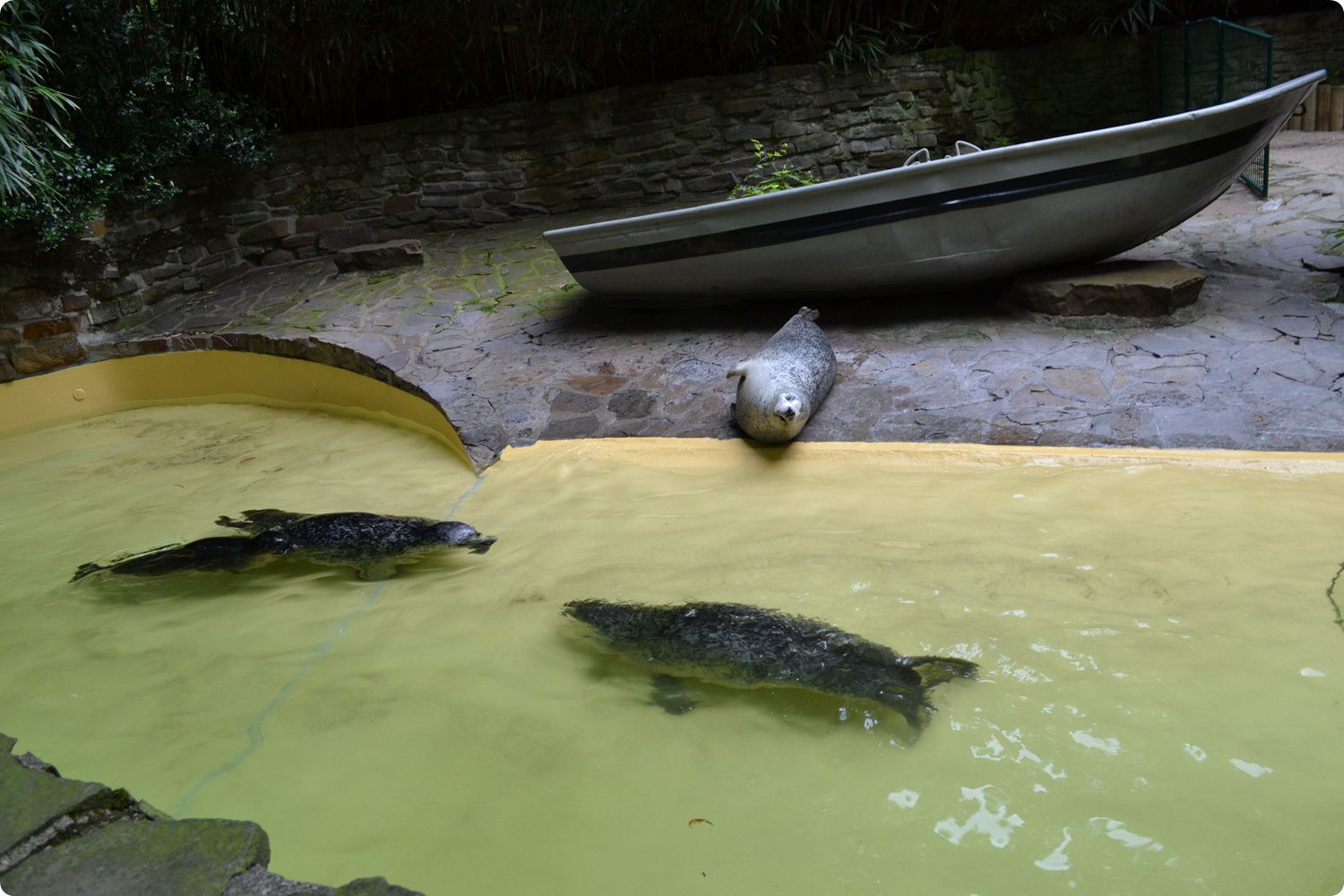 Duisburgban két fókafaj is bemutatásra kerül, mind a kettő rendszeresen szaporodik az állatkertben. Sajnos az állatok víz alatti mozgásának megtekintésére egyik medencénél sincs lehetőség. A borjúfókák egyike teljesen vak: a legöregebb példánynak sajnos egy műtét során mindkét szemét el kellett távolítani egészségének megőrzése érdekében. Az öreg nőstény kissé bizarr látványt nyújt és láthatóan óvatosabban közlekedik társainál. A gyűjtemény másik fókafaja a kaliforniai oroszlánfóka (Zalophus californianus). Duisburgban mindkét fajjal naponta tartanak bemutatókat.