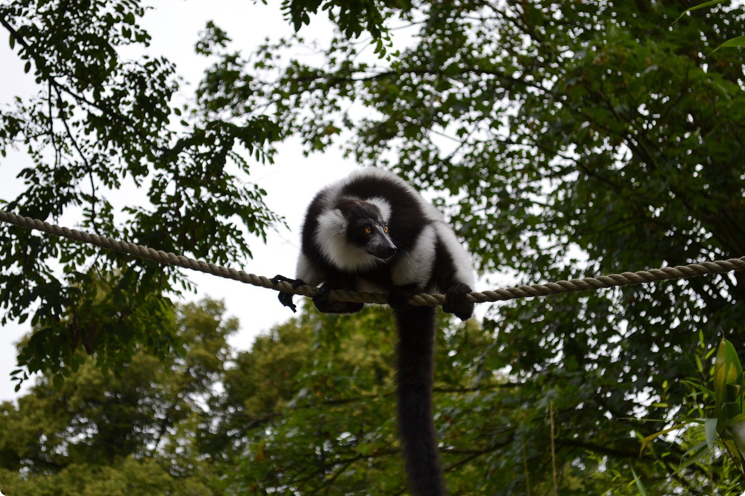 Egy "kötéltáncos" fekete-fehér vari (Varecia variegata variegata)