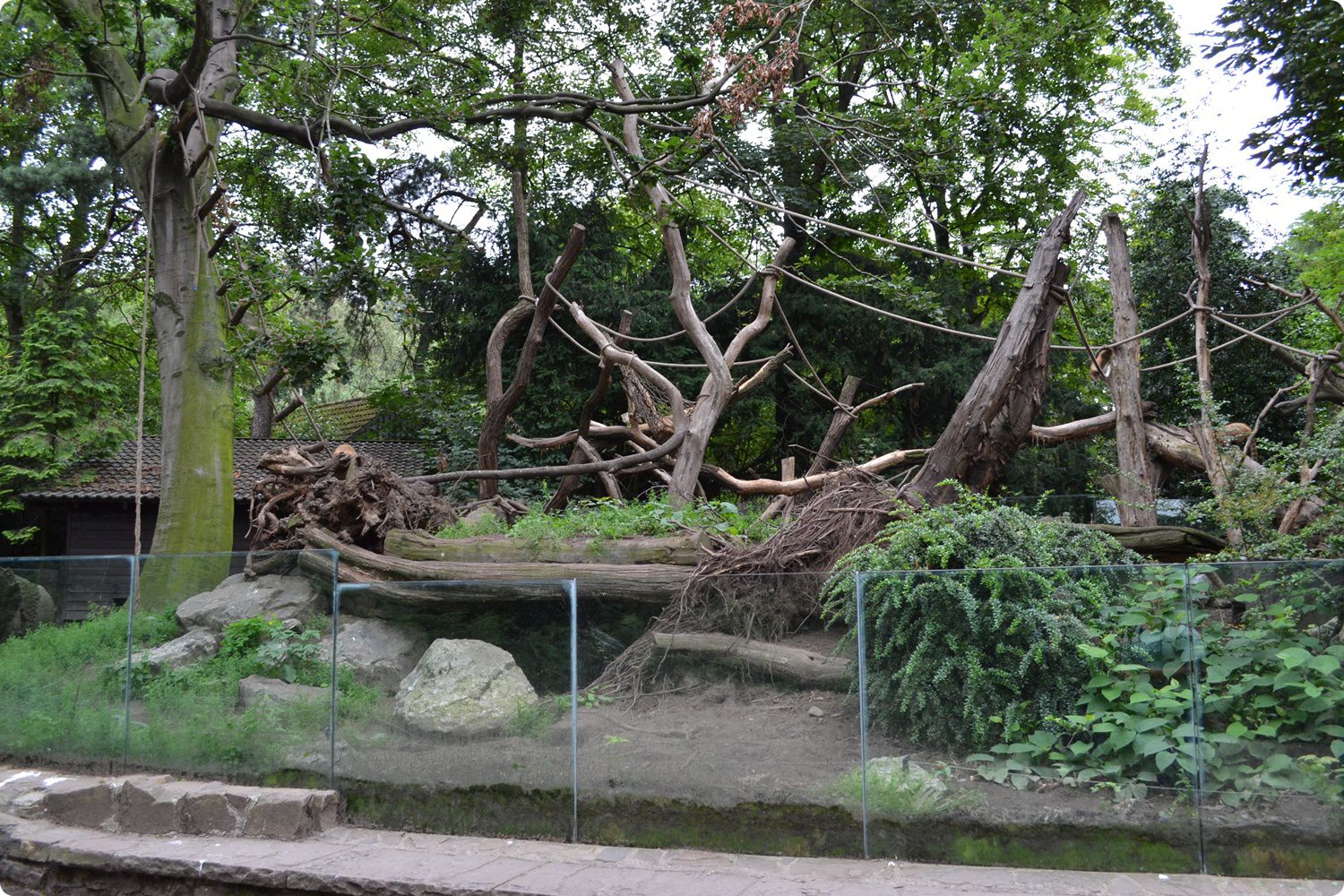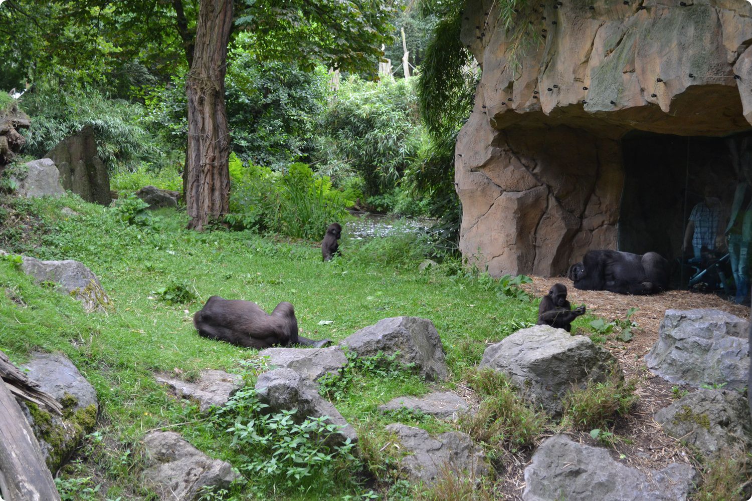 A nyugati síkvidéki gorillák (Gorilla gorilla gorilla) külső kifutója az Äquatorium legkorszerűbb főemlős-férőhelye. A látogatók itt rácsok nélkül, szárazárkokkal és üvegfelületekkel elválasztott férőhelyen ismerkedhetnek a gorillákkal. A hatalmas emberszabásúak rendszeresen szaporodnak Duisburgban. Külső kifutójukat Brazza-cerkófokkal (Cercopithecus neglectus) osztják meg. Bár a gorillák külső kifutója mindenben megfelel a benne tartott igényeinek, az állatkertben bemutatott másik emberszabású, a borneói orángután (Pongo pygmaeus) számára kialakított, apró kifutóról ez már nemigen mondható el. A csöppnyi kifutót két orángutáncsapat felváltva használja. Az 1962-ben átadott Äquatorium férőhelyei a 60-as évek elején korszerűnek számítottak ugyan, ám ma már legnagyobb részük nem felel meg a korszerű állatkerti állattartás kritériumainak. A főemlősök egy részének külső férőhelye látogatók elől elzárt helyen került kialakításra.