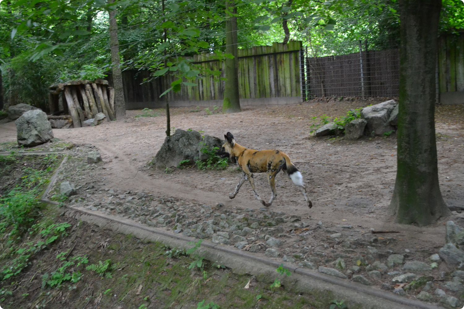 A hiénakutyák kifutóját a közönség felőli oldalon csak szárazárok határolja. Az örökmozgó vadkutyák számára környezetgazdagításként egy műzebra lett kiépítve, melyet kötélpályán követve levadászhatnak az állatok. A kifutó mellett a látogatók összehasonlíthatják sebességüket a hiénakutyákéval: egy futópályán végigfutva egy digitális kijelző mutatja meg az adott látogató legnagyobb elért sebességét.