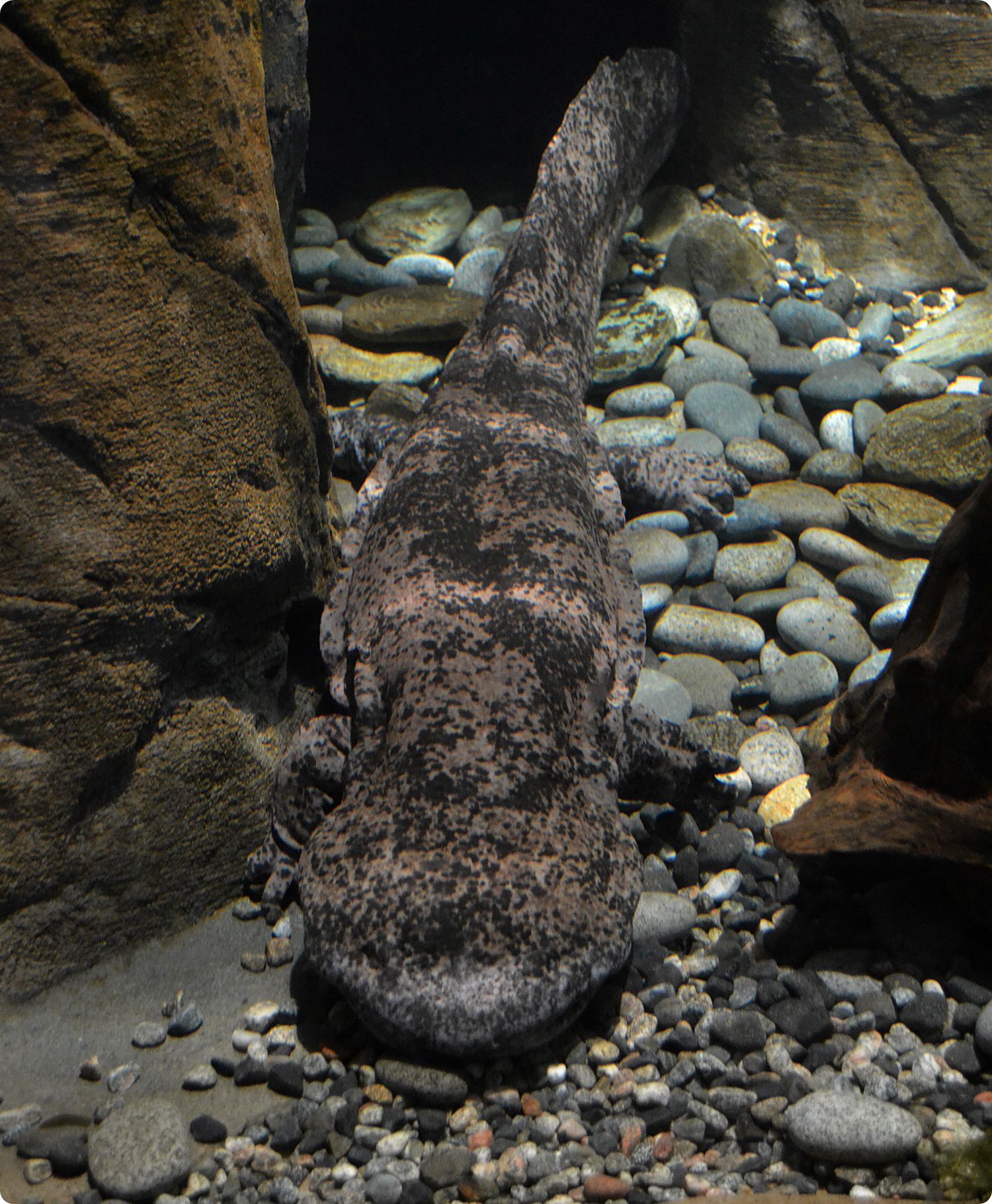 A kínai óriásszalamandra az Akvárium egyik legérdekesebb lakója. A világ második legnagyobbra növő kétéltűjéből Duisburgban jelenleg két példányt gondoznak.